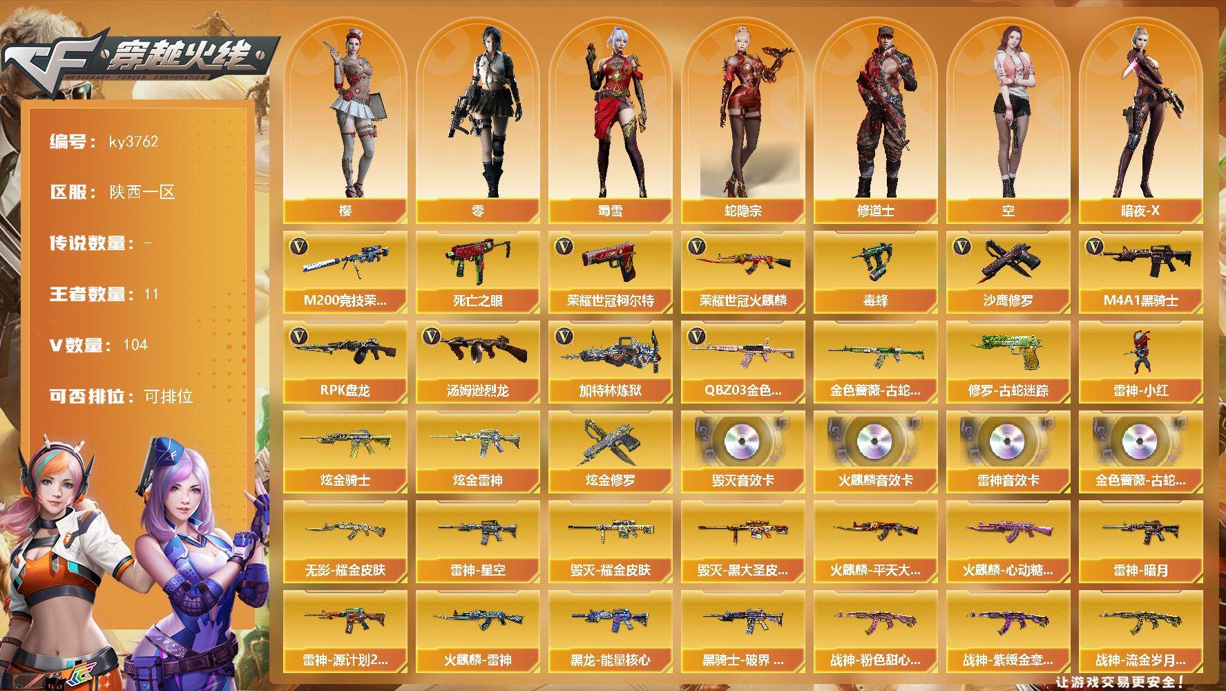 [14043495]陕西一区-104V-11王者-3炫金 【热门武器】:QBZ03-金色蔷薇,金色蔷薇-古蛇迷踪,修罗-古蛇迷踪,M200-竞技荣光,死亡之眼,荣耀世冠-火麒麟,荣耀世冠-柯尔特,毒蜂,M4A1-黑骑士*4,汤姆逊-烈龙*6,RPK-盘龙*5,加特林-炼狱*2,雷神-小红,沙鹰-修罗*4 【王者炫金武器】:炫金骑士,炫金雷神,炫金修罗 【音效卡】:金色蔷薇-古蛇迷踪音效卡,AK47-火麒麟音效卡,M4A1-雷神音效卡,Barrett-毁灭音效卡 【皮肤】:雷神-暗月,雷神-星空,雷神-源计划2.0专属 皮肤,火麒麟-雷神,火麒麟-平天大圣,火麒麟-心动糖果,毁灭耀金皮肤*2,毁灭-黑大圣皮肤,黑龙-能量核心,黑骑士-破界 皮肤,无影耀金皮肤,战神-粉色甜心皮肤,战神-紫绶金章皮肤*5,战神-流金岁月皮肤*5,AK47-B-常胜将军-曹操,AK47-B-常胜将军-刘备,AK47-B-常胜将军-孙权*2 【角色】:零,樱,蛇隐宗,修道士,空,暗夜-X,北极狐-X,初恋灵狐,电竞少女,风暴女,娟娟,兰-新年限定,0号玩家,灵狐者-X,灵狐者-黄金海岸,龙儿,龙儿-小淘气,潘多拉-X,潘多拉-甜心教官,潜龙队-X,蛇姬,斯沃特-X,蜀雪,新娜塔莎,雪莉杨,影武者-X 【人偶武器】:雷神-小红,火麒麟-灵狐*2,迷你深渊冰龙*9,迷你裂空之翼*3,夺魂*4,迷你牛牛*3,迷你火种,迷你生化手雷,生化手雷-机甲核心,深渊终结者手雷,闪光弹-小乔,闪光弹-貂蝉,高爆手雷-大乔,迷你艾比,迷你巨石泰坦-魔花研究所 【暴走生化】:毒蜂,死亡之眼,超级对讲机 【挑战大师】:致命乱世-超越Max,神圣爆裂者III,AK47-冰龙粉碎者*2,冰龙粉碎者-白马银枪,激光毁灭者III-白马银枪,VEPR-12-金魔,激光毁灭者III,机甲撕裂者III,试炼破坏者III,神圣爆裂者-末日III,阐释者III*2 【英雄级武器】:AK47-火麒麟*3,M4A1-黑龙*2,M4A1-雷神*2,M4A1-黑骑士*4,AK47-无影*2,M4A1-死神,AK47-黑武士*2,AK12-天启,AN94-超新星,AK47-黑鲨,金色蔷薇-古蛇迷踪,QBZ03-金色蔷薇,王者之魄-觉醒版,超新星-悦享-觉醒版,AK-47-猩红传说*9,AK47-B-战神,黑骑士-海王*2,AK47-B-常胜将军,王者之烈-觉醒