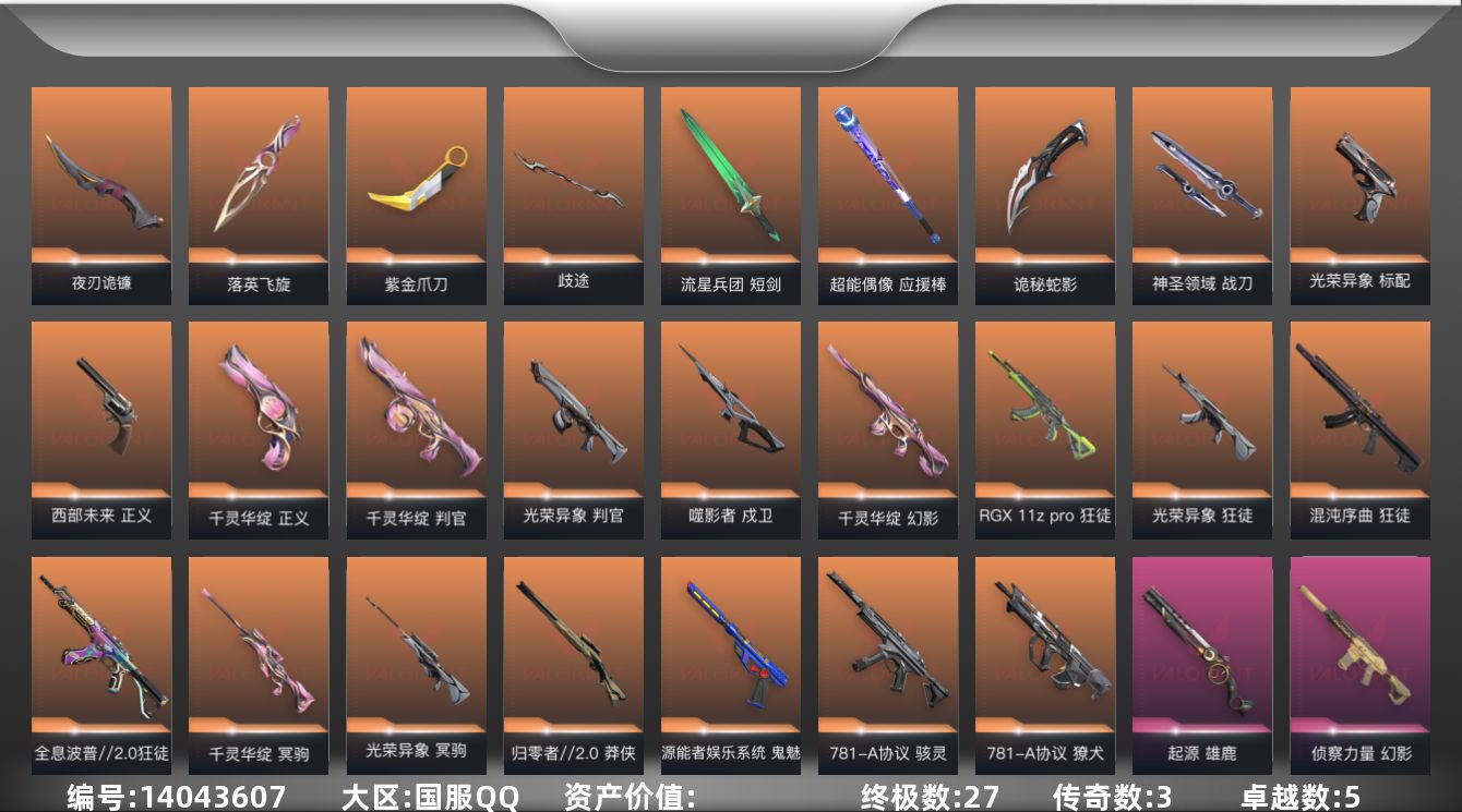 [14043607]【套装】:光荣异象套装,千灵华绽套装 【英雄】:幻棱,炼狱,维斯,暮蝶,钛狐,壹决,铁臂,捷风,雷兹,幽影,不死鸟,贤者,猎枭,蝰蛇,零,芮娜,奇乐,尚勃勒,霓虹,斯凯,夜露,星礈,K/O,海神,盖可,黑梦,钢锁 【近战 武器】:近战武器-光荣异象 歧途,近战武器-紫金爪刀,近战武器-落英飞旋,近战武器-流星兵团 短剑,近战武器-超能偶像 应援棒,近战武器-夜刃诡镰,近战武器-诡秘蛇影 军刀,近战武器-神圣领域 战刀,近战武器-日耀风暴 遗器,近战武器-星际猎兵 短剑 【狂徒】:狂徒-2025全球冠军赛,狂徒-混沌序曲,狂徒-全息波普//2.0,狂徒-RGX 11z Pro,狂徒-光荣异象,狂徒-紫阙金琅,狂徒-离子武器//2.0,狂徒-超能偶像,狂徒-流星兵团,狂徒-诡秘蛇影 【幻影】:幻影-千灵华绽,幻影-混沌序曲//2.0,幻影-侦察力量,幻影-神圣领域,幻影-聚合之力,幻影-末日之翼 【戍卫】:戍卫-噬影者,戍卫-超能偶像,戍卫-战术熊与伙伴们,戍卫-月球哨兵,戍卫-折光棱晶 【獠犬】:獠犬-781-A协议,獠犬-神圣领域,獠犬-采蜜小蜂队 【冥驹】:冥驹-千灵华绽,冥驹-光荣异象,冥驹-离子武器,冥驹-星云暗涌 【飞将】:飞将-聚合之力,飞将-战术熊与伙伴们,飞将-末日之翼 【莽侠】:莽侠-归零者//2.0,莽侠-诡秘蛇影,莽侠-纤云弄巧,莽侠-月球哨兵 【战神】:战神-神圣领域,战神-采蜜小蜂队 【奥丁】:奥丁-流星兵团,奥丁-末日之翼 【判官】:判官-千灵华绽,判官-光荣异象,判官-超能偶像,判官-诡秘蛇影,判官-采蜜小蜂队 【雄鹿】:雄鹿-起源,雄鹿-月球哨兵 【骇灵】:骇灵-781-A协议,骇灵-流星兵团,骇灵-星云暗涌 【蜂刺】:蜂刺-聚合之力,蜂刺-纤云弄巧,蜂刺-星云暗涌,蜂刺-折光棱晶 【标配】:标配-光荣异象,标配-超能偶像,标配-战术熊与伙伴们,标配-折光棱晶 【正义】:正义-千灵华绽,正义-西部未来,正义-纤云弄巧,正义-月球哨兵 【鬼魅】:鬼魅-源能者娱乐系统,鬼魅-流星兵团,鬼魅-诡秘蛇影,鬼魅-采蜜小蜂队,鬼魅-灵魂消声者,鬼魅-星云暗涌 【狂怒】:狂怒-神圣领域,狂怒-聚合之力,狂怒-战术熊与伙伴们 【短炮】:短炮-纤云弄巧,短炮-末日之翼 【卡面】:欢迎来到底城 卡面,南瓜盛典 卡面,修车达人 卡面,热舞环节 卡面,正义的