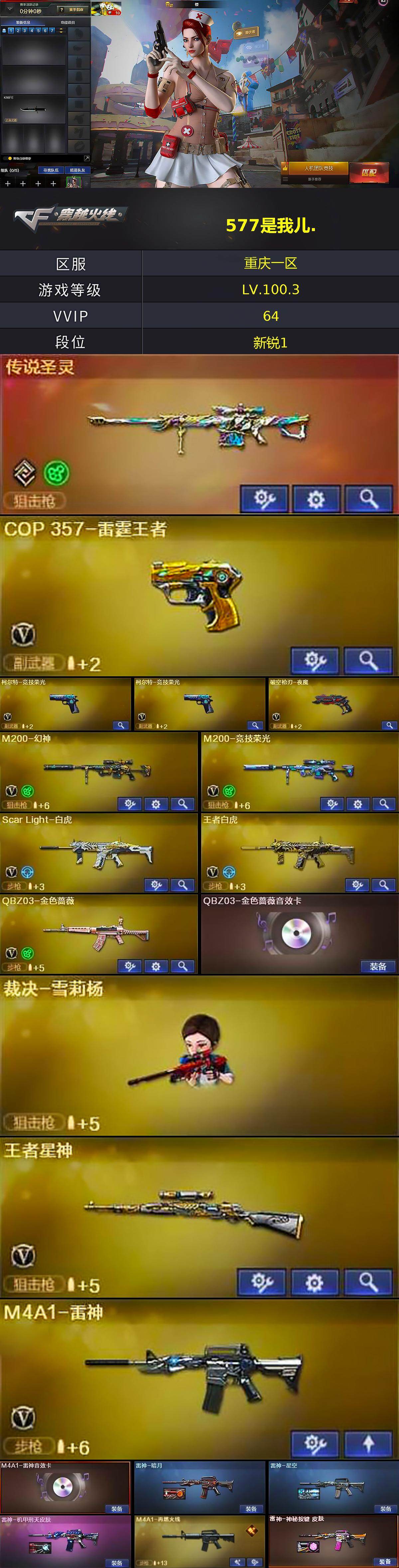- [12628213]广东一区-131V-62王者-6炫金 【传说武器】:传说光耀,传说暗裔,传说圣灵,传说辉光,传说幽瞳,传说灵眸,传说幽冥 【传说角色】:传说女帝 【热门武器】:传说光耀,传说暗裔,传说圣灵,传说辉光,传说幽瞳,传说灵眸,传说幽冥,G36C-幻影,QBZ03-金色蔷薇*2,M14EBR-玄武,Scar Light-白虎,HK417-朱雀,M4A1-青龙,M200-幻神*2,柯尔特-荣耀世冠白鲨2023,金色蔷薇-古蛇迷踪,修罗-古蛇迷踪,M200-竞技荣光,荣耀世冠-火麒麟,荣耀世冠-雷神,白虎-电玩蓝兔,柯尔特-冠军之特,荣耀世冠-柯尔特,Kar98K-星神,炼狱-迷你小钢,毒蜂,M4A1-黑骑士,汤姆逊-烈龙*3,RPK-盘龙*4,幻神-枪娘爱丽丝,玄武-枪娘火莲,COP-白鲨*2,USP-雷暴,沙鹰-修罗*4,Knife-冠军之刃*2,炽芒蝶刃,炽芒蝶刃-冠军炽芒皮肤,炽芒蝶刃-荣耀世冠白鲨2023 皮肤,荣耀世冠-龙啸*2,黄金猫猫手套-白鲨,金刚伞 【王者炫金武器】:炫金骑士,炫金天龙,炫金毁灭*2,炫金雷神,炫金超新星,炼狱-悦蓝,王者之力,王者之心,Barrett-雷霆王者,王者青龙,王者凤吟,王者之霆,王者之刺,雷霆王者之锋*2,王者玉锋 【音效卡】:M200-幻神音效卡,M4A1-雷神音效卡,M4A1-黑骑士音效卡,QBZ03-金色蔷薇音效卡,Scar Light-白虎音效卡,Kar98K-星神音效卡 【稀有皮肤】:幻神-周瑜皮肤,幻神-冠军之幻,幻神-宠儿-2021MVP,幻神-巅峰荣耀,幻神-CFS2022,M200-幻神-荣耀世冠白鲨,M200-幻神-N9-2022MVP,幻神-星火小队签名臻藏版 皮肤,幻神-荣耀世冠白鲨2023 皮肤,星神-枪娘默 皮肤,星神-巅峰荣耀 皮肤,白虎-AG-CFPLS20冠军,白虎-巅峰荣耀 皮肤,QBZ03-冠军之薇,QBZ03-荣耀世冠白鲨,QBZ03-巅峰荣耀皮肤,金色蔷薇-破浪逐光 皮肤,雷神-能量核心*4,雷神-荣耀之魄,雷神-星空*2,雷神-耀金皮肤,雷神-传奇N9,雷神-宠儿-2019MVP,雷神-R.LGD-CFPLS18冠军,雷神-荣耀世冠AG,火麒麟-平天大圣,火麒麟-盘古,火麒麟-巅峰荣耀,火麒麟-心动糖果,黑骑士-暗月,黑骑士-冠军之势,黑骑士-CFS2021,黑骑士-伏羲,黑骑士-A