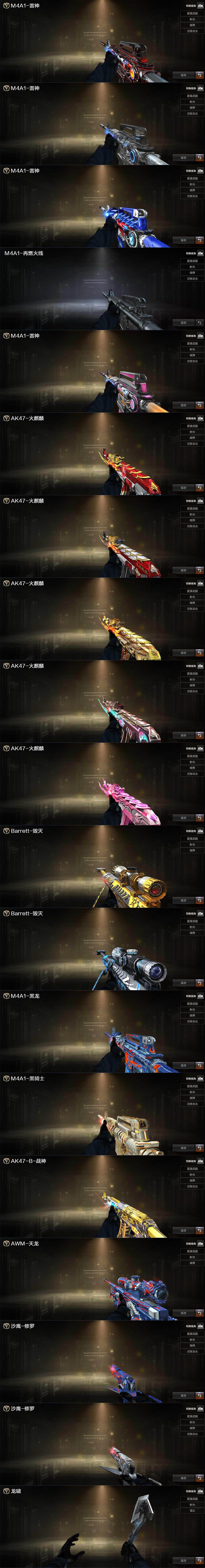 【英雄级武器】:AK47-火麒麟*2,M4A1-雷神,M4A1-黑骑士,AN94-超新星,AK47-黑鲨,HK417-朱雀,Scar Light-白虎,无影-神兵利器,QBZ03-金色蔷薇,王者之势-觉醒版,AK-47-猩红传说*3,AK47-B-战神,黑骑士-海王,AK47-B-常胜将军,王者白虎-觉醒版,AWM-天龙,Barrett-毁灭,Barrett-极光*2,M200-幻神,M200-竞技荣光,王者星神-觉醒版,炼狱-风暴
