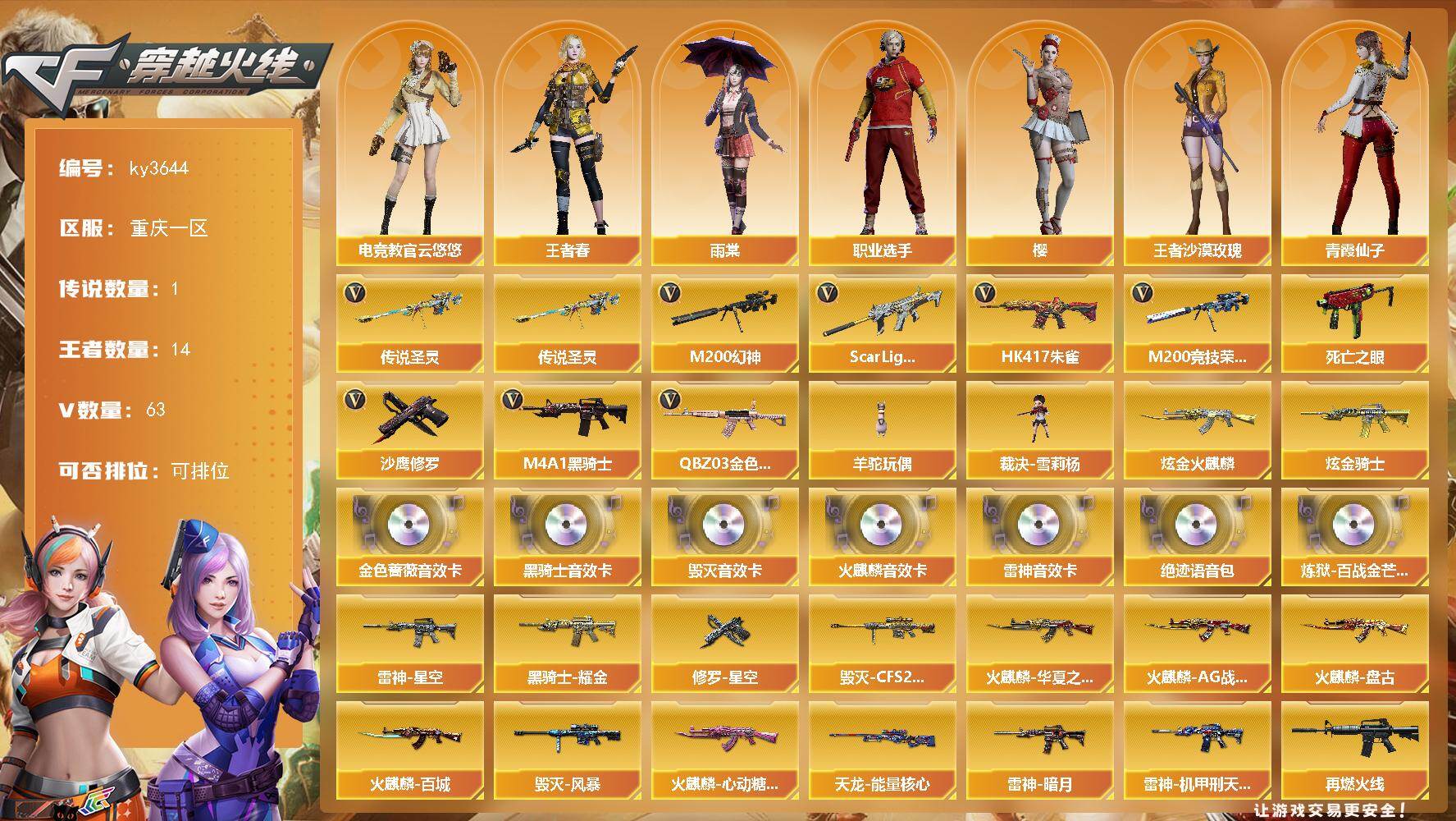 [14044614]重庆一区-63V-14王者-2炫金 【传说武器】:传说圣灵 【热门武器】:传说圣灵,QBZ03-金色蔷薇,Scar Light-白虎,HK417-朱雀,M200-幻神,M200-竞技荣光,死亡之眼,M4A1-黑骑士,羊驼玩偶,裁决-雪莉杨,沙鹰-修罗 【王者炫金武器】:炫金火麒麟,炫金骑士 【音效卡】:AK47-火麒麟音效卡,M4A1-雷神音效卡,M4A1-黑骑士音效卡,Barrett-毁灭音效卡,QBZ03-金色蔷薇音效卡,绝迹语音包,炼狱-百战金芒-庆典舞曲音效卡 【皮肤】:雷神-暗月,雷神-星空,雷神-机甲刑天皮肤,M4A1-再燃火线,雷神-神秘按键 皮肤,火麒麟-AG战队皮肤,火麒麟-华夏之心,火麒麟-盘古,火麒麟-百城,火麒麟-心动糖果,毁灭-CFS2020,毁灭-风暴*2,黑龙-能量核心,黑骑士耀金皮肤,战神-流金岁月皮肤*2,AK47-B-常胜将军-曹操*2,AK47-B-常胜将军-孙权,天龙-能量核心,修罗-能量核心,修罗-星空,屠龙-惊鸿 皮肤,轻型军用手斧-再燃火线 【角色】:樱,雨棠,电竞教官-云悠悠,王者春,王者沙漠玫瑰,奇洋探员,修道士,暗夜-X,芳心审判者,飞虎队-X,风暴女,嘉年华灵狐,娟娟,兰妹妹,灵狐者-七夕宝贝,麻雀,潘多拉-甜心教官,青霞仙子,斯沃特-X,蜀雪,雪莉杨,樱-战斗天使,职业选手 【人偶武器】:裁决-雪莉杨,AWM-灵狐-15周年嘉年华,迷你裂空之翼*5,迷你牛魔王,迷你波特博士*4,迷你牛牛,迷你火种*5,迷你生化手雷,生化手雷-机甲核心*2,深渊终结者手雷,闪光弹-貂蝉,高爆手雷-大乔,迷你艾比,灵狐娃娃手雷 【暴走生化】:双面神,死亡之眼,超级对讲机 【挑战大师】:暴君乱世-超越Max,神圣爆裂者III,激光毁灭者III,机甲撕裂者III,试炼破坏者III,神圣爆裂者-末日III 【英雄级武器】:AK47-火麒麟*2,M4A1-雷神,M4A1-黑骑士,AN94-超新星,AK47-黑鲨,HK417-朱雀,Scar Light-白虎,无影-神兵利器,QBZ03-金色蔷薇,王者之势-觉醒版,AK-47-猩红传说*3,AK47-B-战神,黑骑士-海王,AK47-B-常胜将军,王者白虎-觉醒版,AWM-天龙,Barrett-毁灭,Barrett-极光*2,M200-幻神,M200-竞技荣光,王者星神-觉醒版,炼狱-风暴
