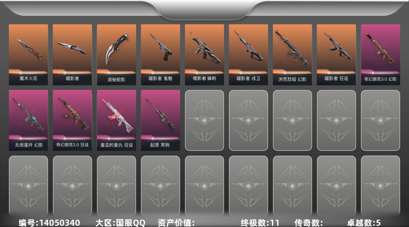 [14050340]【套装】:2025全球冠军赛套装,噬影者套装 【英雄】:幻棱,炼狱,维斯,暮蝶,壹决,铁臂,捷风,雷兹,幽影,不死鸟,贤者,猎枭,蝰蛇,零,芮娜,尚勃勒,霓虹,夜露,K/O,盖可,黑梦,钢锁 【近战 武器】:近战武器-2025全球冠军赛 蝴蝶刀,近战武器-魔术火花,近战武器-噬影者 簇刃,近战武器-诡秘蛇影 军刀,近战武器-阿特拉斯指挥部 甩棍,近战武器-魔术火花 【狂徒】:狂徒-2025全球冠军赛,狂徒-噬影者,狂徒-盖亚的复仇,狂徒-奇幻朋克//3.0,狂徒-诡秘蛇影 【幻影】:幻影-洪荒怒焰,幻影-无垠星环,幻影-奇幻朋克//3.0,幻影-末日之翼 【戍卫】:戍卫-噬影者,戍卫-折光棱晶 【冥驹】:冥驹-起源 【飞将】:飞将-末日之翼 【莽侠】:莽侠-诡秘蛇影 【奥丁】:奥丁-末日之翼 【判官】:判官-诡秘蛇影 【蜂刺】:蜂刺-噬影者,蜂刺-折光棱晶 【标配】:标配-神罚,标配-折光棱晶 【鬼魅】:鬼魅-噬影者,鬼魅-诡秘蛇影 【短炮】:短炮-末日之翼 【卡面】:欢迎来到底城 卡面,南瓜盛典 卡面,梦幻奶茶 卡面,源能反应 卡面,零点嗅探设计图 卡面,代号红色 卡面,新兵报到 卡面,V契约 卡面,无畏契约 卡面 【喷漆】:都算到了 喷漆,我的刀呢? 喷漆,胜利属于无畏契约 喷漆,GLHF 喷漆,无畏契约 喷漆 【挂饰】:第九季//第三幕 纪念币 挂饰,迷你K/O 挂饰,第八季//第三幕 纪念币 挂饰,无畏契约 纪念币 挂饰