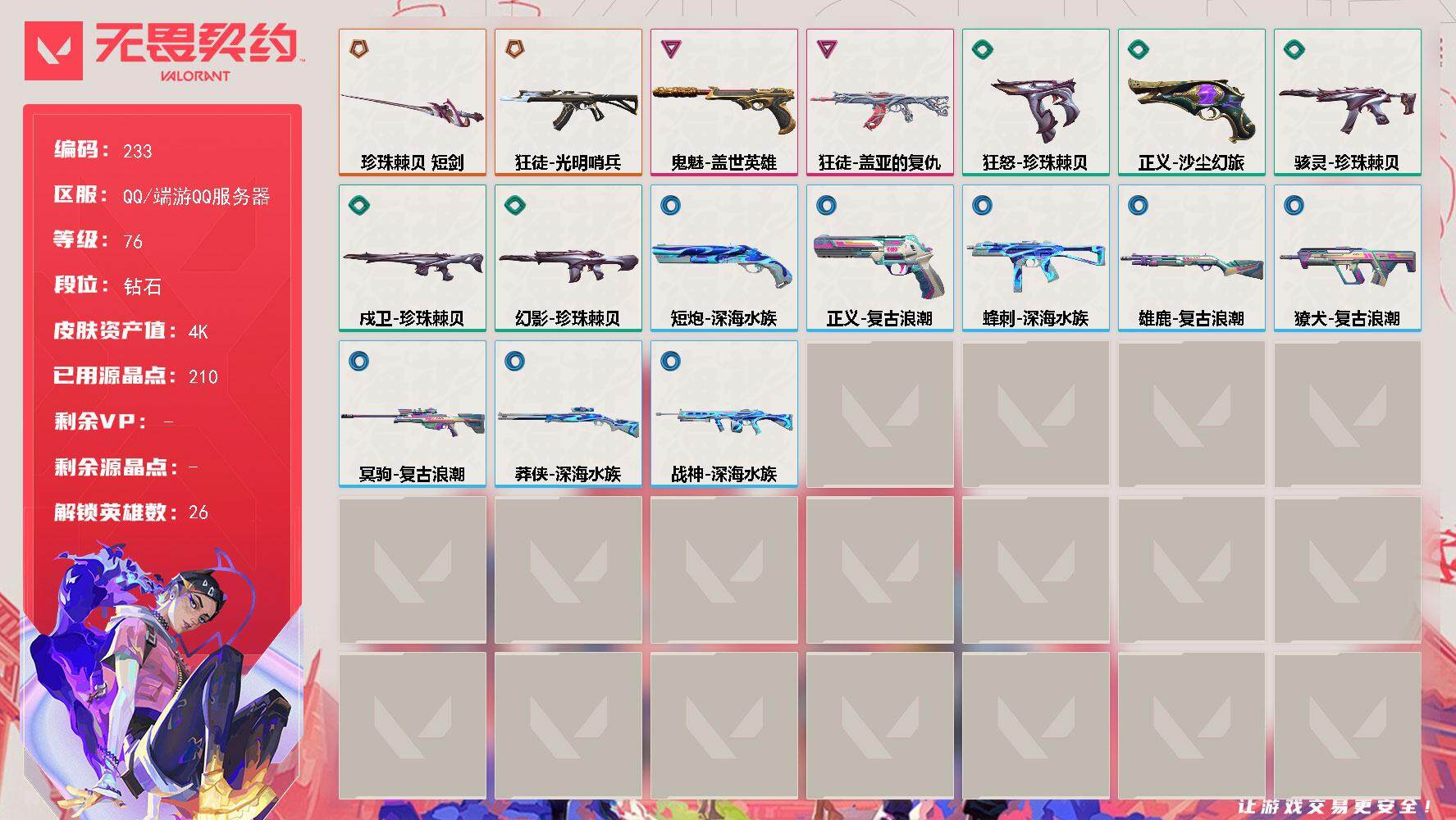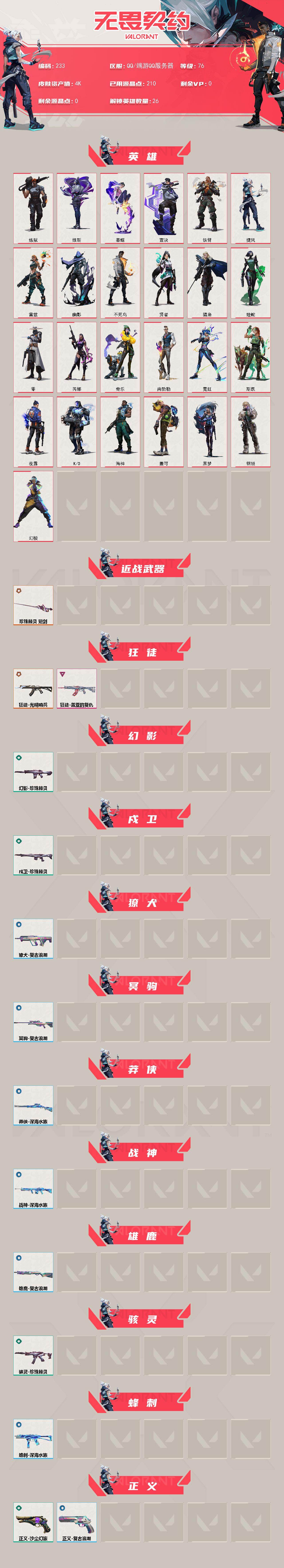 [14050446]【英雄】:幻棱,炼狱,维斯,暮蝶,壹决,铁臂,捷风,雷兹,幽影,不死鸟,贤者,猎枭,蝰蛇,零,芮娜,奇乐,尚勃勒,霓虹,斯凯,夜露,K/O,海神,盖可,黑梦,钢锁 【近战 武器】:近战武器-珍珠棘贝 短剑 【狂徒】:狂徒-光明哨兵,狂徒-盖亚的复仇 【幻影】:幻影-珍珠棘贝 【戍卫】:戍卫-珍珠棘贝 【獠犬】:獠犬-复古浪潮 【冥驹】:冥驹-复古浪潮 【莽侠】:莽侠-深海水族 【战神】:战神-深海水族 【雄鹿】:雄鹿-复古浪潮 【骇灵】:骇灵-珍珠棘贝 【蜂刺】:蜂刺-深海水族 【正义】:正义-沙尘幻旅,正义-复古浪潮 【鬼魅】:鬼魅-盖世英雄 【狂怒】:狂怒-珍珠棘贝 【短炮】:短炮-深海水族 【卡面】:零点嗅探设计图 卡面,表象之下 卡面,虹吸式咖啡壶 卡面,源能者美容 卡面,脚踝终结者 卡面 ,夜班 卡面,瓦娃脸雪糕 卡面 ,沙雕爆能器 卡面,无畏契约GO!第一卷:芮娜 卡面,深海水族 卡面,珍珠棘贝 卡面,复古浪潮 卡面,盖可工牌 卡面,清除名单 卡面,无畏契约GO!第一卷:零 卡面,完美调谐 卡面 ,暗枪 卡面,终章:黑影先生的咖啡! 卡面,铁臂vs雷兹 卡面,钢锁vs盖可 卡面,别冒尖 卡面,夯实根基 卡面,"Luie" 卡面,热烈欢迎 卡面,铁臂设计图 卡面,代号红色 卡面,新兵报到 卡面,V契约 卡面,无畏契约 卡面 【喷漆】:情绪控制 喷漆,哨卫滑步 喷漆,倒吸一口凉气 喷漆,UWU 喷漆,新潮流 喷漆,逮到一个 喷漆,一个人的孤岛 喷漆,双人比心 喷漆,不予置评 喷漆,三熊合一 喷漆,要喝完噢! 喷漆,双击点赞 喷漆,珍珠棘贝 喷漆,深海水族 喷漆,禁止标配 喷漆 ,铁臂尴尬 喷漆,买装还是存钱 喷漆,醒狮贺春 喷漆,旅行小熊 喷漆,蕊形灯 喷漆,放下武器 喷漆,凌空惊吓 喷漆,老铁困了 喷漆,口袋贤者 喷漆,胜利属于无畏契约 喷漆,GLHF 喷漆,无畏契约 喷漆 【挂饰】:Z世代特饮 挂饰,战术抓娃娃:阿丹 挂饰 ,瓶中信 挂饰,复古浪潮 挂饰,深海水母 挂饰,传世莲华 挂饰,扭结饼干 挂饰 ,珍珠棘贝 挂饰,深海水族 挂饰 ,第八季//第二幕 纪念币 挂饰 ,天外飞客 挂饰,好运福爪 挂饰,红鳞松叶 挂饰,《双城之战》魄罗 挂饰,酷闪轮滑 挂饰,瞄这里 挂饰,第八季//第一幕 纪念币 挂饰,终章:高音谱号 挂饰,彩糖面包 挂饰,冬日絮语 挂