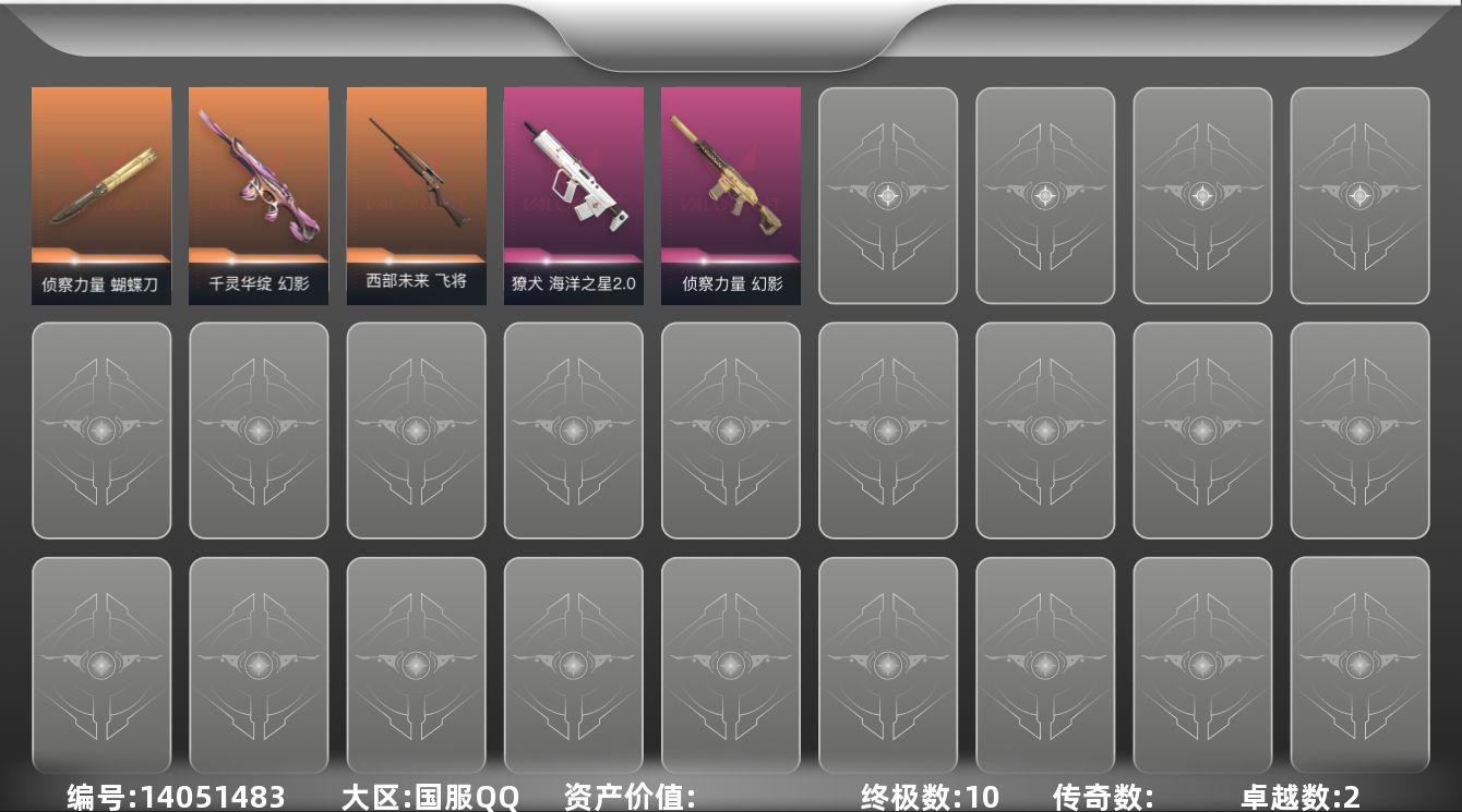 [14051483]【套装】:2025全球冠军赛套装,混沌序曲//2.0套装 【英雄】:炼狱,暮蝶,捷风,不死鸟,贤者,猎枭,零,芮娜,奇乐,尚勃勒,霓虹,K/O,钢锁 【近战 武器】:近战武器-2025全球冠军赛 蝴蝶刀,近战武器-混沌链枷,近战武器-侦察力量 蝴蝶刀 【狂徒】:狂徒-2025全球冠军赛 【幻影】:幻影-千灵华绽,幻影-混沌序曲//2.0,幻影-侦察力量 【獠犬】:獠犬-混沌序曲//2.0,獠犬-海洋之星//2.0 【飞将】:飞将-西部未来 【骇灵】:骇灵-混沌序曲//2.0 【正义】:正义-混沌序曲//2.0 【卡面】:无畏契约GO!第一卷:零 卡面,代号红色 卡面,新兵报到 卡面,V契约 卡面,无畏契约 卡面 【喷漆】:买装还是存钱 喷漆,胜利属于无畏契约 喷漆,GLHF 喷漆,无畏契约 喷漆 【挂饰】:无畏契约 纪念币 挂饰