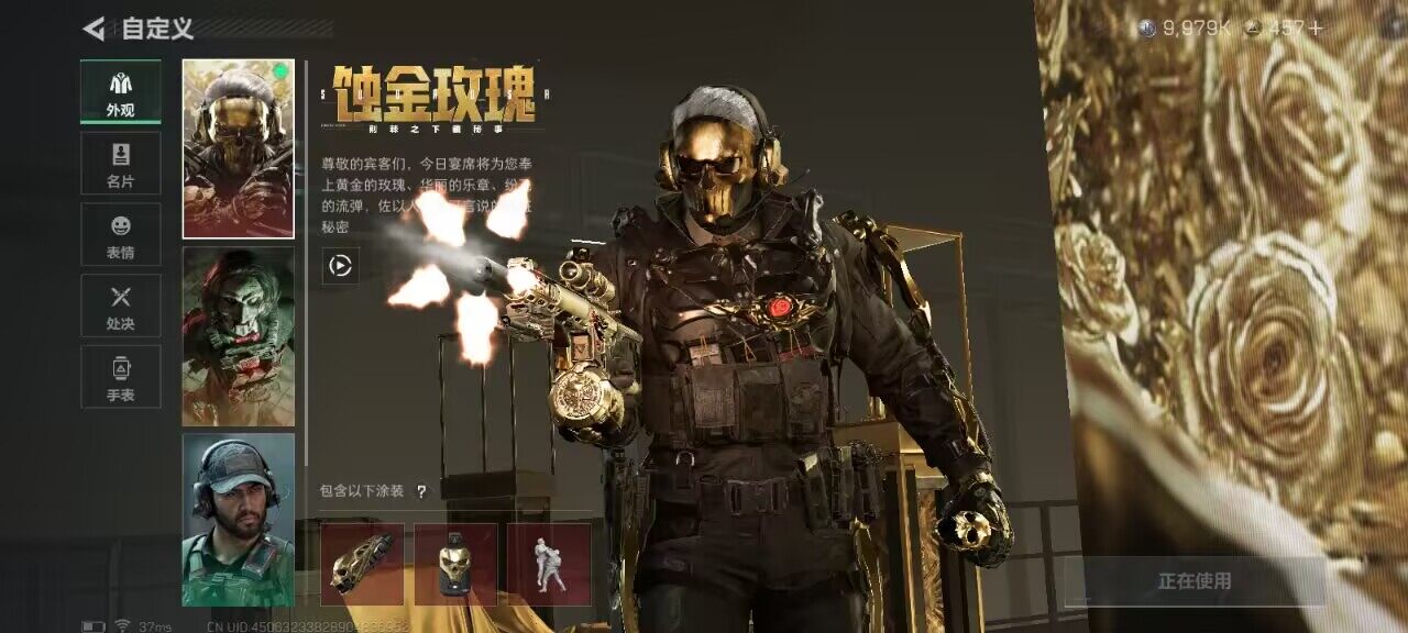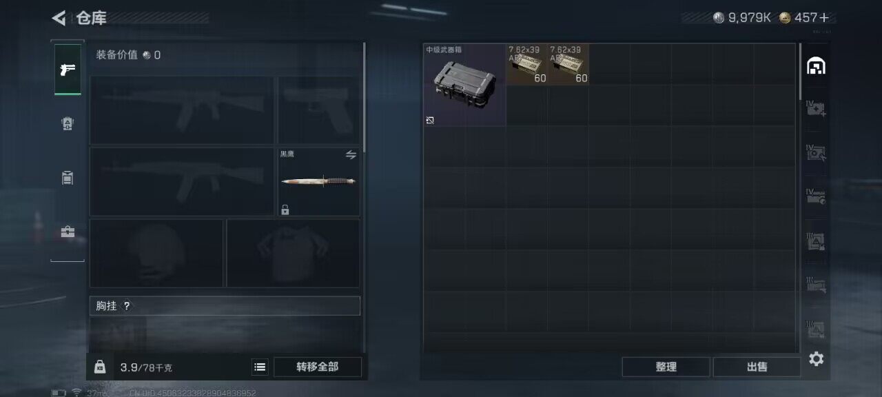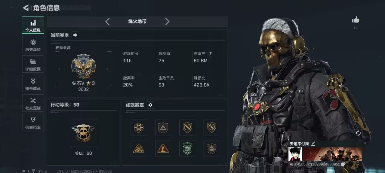 - [10444955]总资产122M,哈夫币9062w,枪皮数量39,战场等级:1 无军衔,行动等级:44 铂金,近战-黑鹰