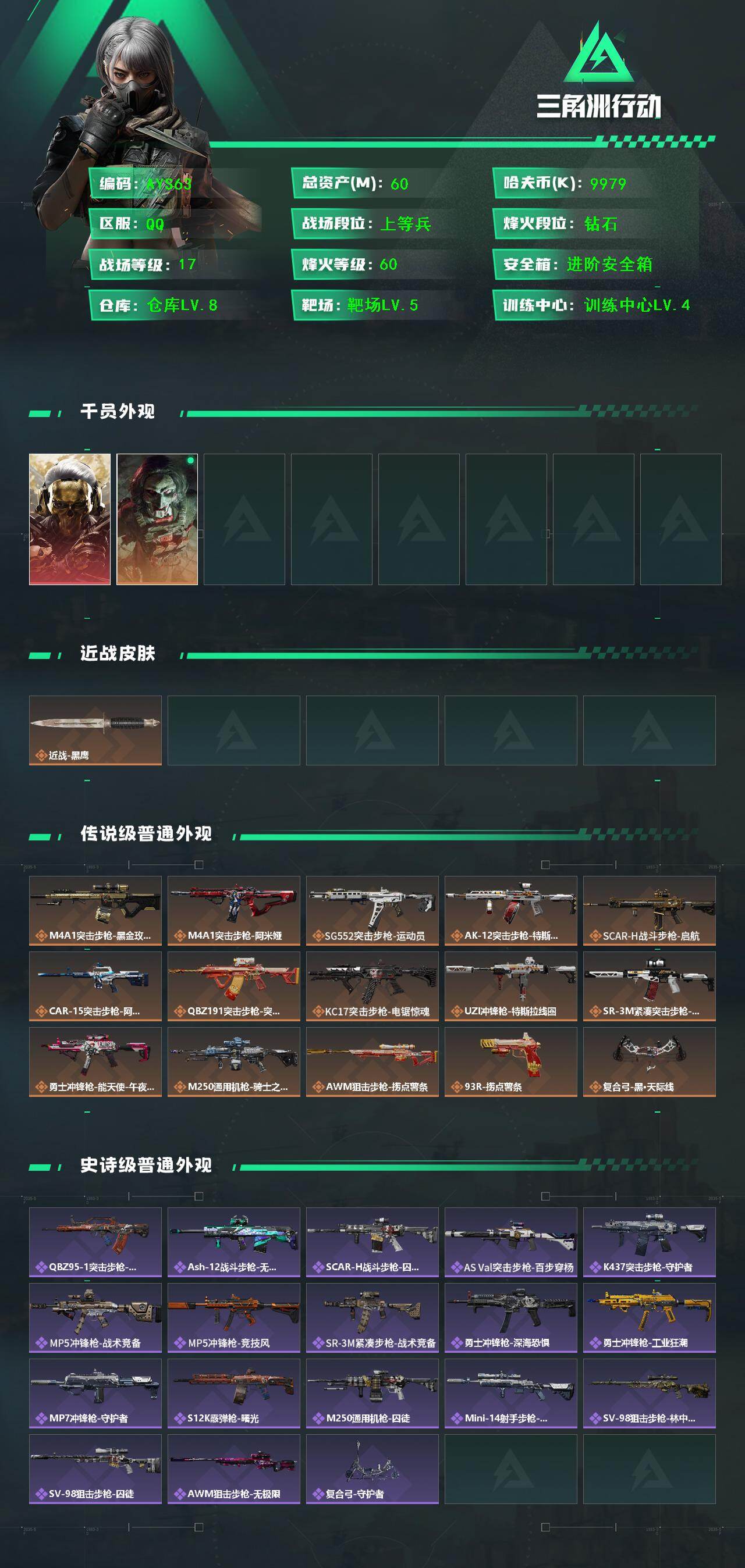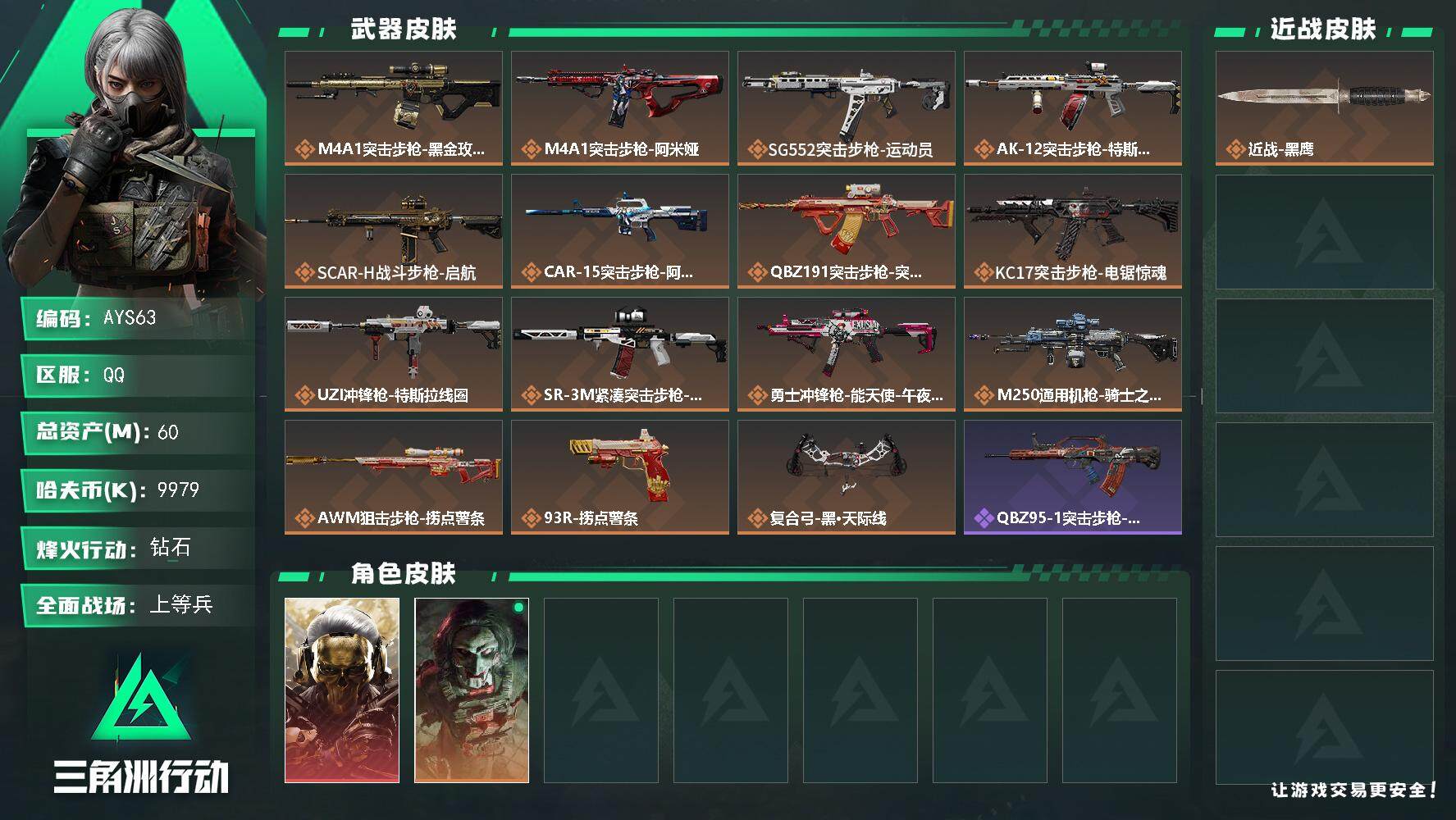 [14069832]总资产60m【店主推荐捡漏号!可直接换绑】9979k哈伏币-60m流动资产-60烽火等级-钻石-17战场等级-上等兵 【干员外观】:红狼-蚀金玫瑰,红狼-电锯惊魂 【近战皮肤】:近战-黑鹰 【传说级普通外观】:M4A1突击步枪-蚀金玫瑰,M4A1突击步枪-阿米娅,SG552突击步枪-运动员,AK-12突击步枪-特斯拉线圈,SCAR-H战斗步枪-启航,CAR-15突击步枪-阿米娅,腾龙突击步枪-捞点薯条,KC17突击步枪-电锯惊魂,UZI冲锋枪-特斯拉线圈,SR-3M紧凑突击步枪-特斯拉线圈,勇士冲锋枪-能天使-午夜邮差,M250通用机枪-骑士之心,AWM狙击步枪-捞点薯条,93R-捞点薯条,复合弓-黑·天际线 【史诗级普通外观】:QBZ95-1突击步枪-曙光,ASh-12战斗步枪-无极限,SCAR-H战斗步枪-囚徒,AS Val突击步枪-百步穿杨,K437突击步枪-守护者,MP5冲锋枪-战术竞备,MP5冲锋枪-竞技风,SR-3M紧凑突击步枪-战术竞备,勇士冲锋枪-深海恐惧,勇士冲锋枪-工业狂潮,MP7冲锋枪-守护者,S12K霰弹枪-曙光,M250通用机枪-囚徒,Mini-14射手步枪-守护者,SV-98狙击步枪-林中猎手,SV-98狙击步枪-囚徒,AWM狙击步枪-无极限,复合弓-守护者 【稀有级普通外观】:SCAR-H战斗步枪-荣耀列队,MP5冲锋枪-弄臣,SMG-45-行动开启,SMG-45冲锋枪-幻影结构,M1014霰弹枪-幻影结构,Mini-14射手步枪-荣耀列队,SKS射手步枪-弄臣,SR-25射手步枪-开拓,SR-9射手步枪-街头涂鸦,SV-98狙击步枪-星链科技,G18-星链科技 【普通级普通外观】:M4A1突击步枪-粉色涂装,M4A1突击步枪-高雅黑,M4A1突击步枪-海色,QBZ95-1突击步枪-高雅黑,QBZ95-1突击步枪-海浪,QBZ95-1突击步枪-海色,QBZ191突击步枪-三角洲力量,K416突击步枪-几何迷彩,K416突击步枪-高雅黑,M16A4突击步枪-三角洲力量,M16A4突击步枪-山林猎人,AUG突击步枪-浅蓝涂装,M7战斗步枪-红色涂装,SG552突击步枪-三角洲力量,SG552突击步枪-浅蓝涂装,SG552突击步枪-海浪,SCAR-H战斗步枪-数码迷彩,G3战斗步枪-高雅黑,PTR-32突击步枪-黄蜂,MP5冲锋枪-安全工作
