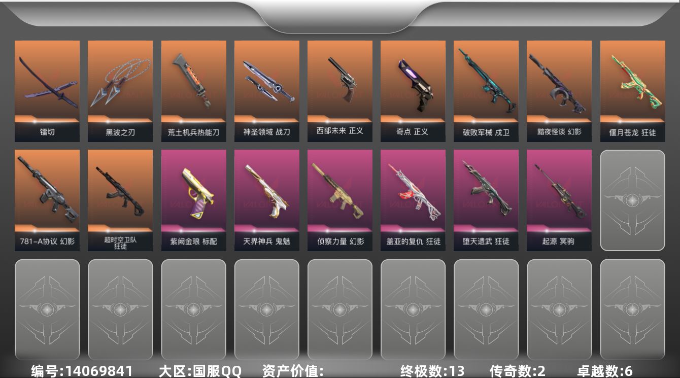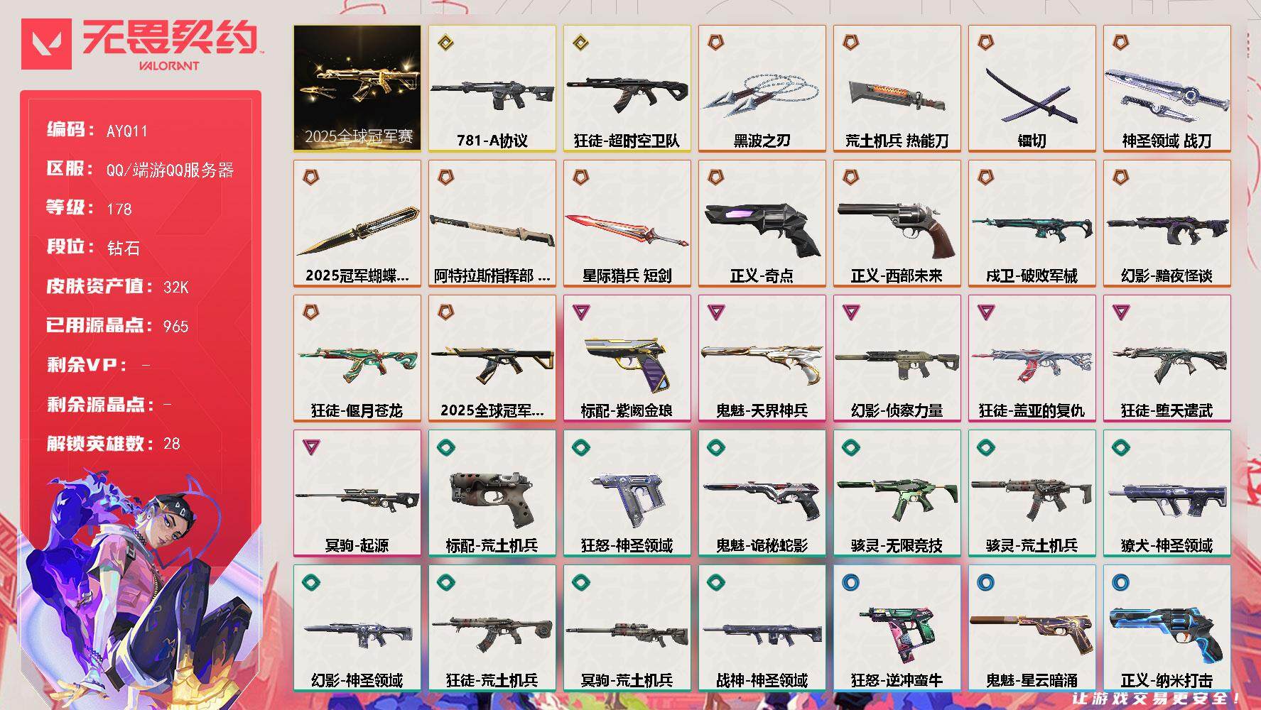 [14069841]可二次,【店主推荐捡漏号!可直接换绑】【套装】:2025全球冠军赛套装【英雄】:幻棱,炼狱,维斯,暮蝶,钛狐,壹决,铁臂,捷风,雷兹,幽影,不死鸟,贤者,猎枭,蝰蛇,零,芮娜,奇乐,尚勃勒,霓虹,斯凯,夜露,星礈,K/O,海神,盖可,黑梦,钢锁【近战 武器】:近战武器-2025全球冠军赛 蝴蝶刀,近战武器-黑波之刃,近战武器-镭切,近战武器-荒土机兵 热能刀,近战武器-神圣领域 战刀,近战武器-阿特拉斯指挥部 甩棍,近战武器-星际猎兵 短剑【狂徒】:狂徒-超时空卫队,狂徒-2025全球冠军赛,狂徒-偃月苍龙,狂徒-堕天遗武,狂徒-盖亚的复仇,狂徒-荒土机兵【幻影】:幻影-781-A协议,幻影-黯夜怪谈,幻影-侦察力量,幻影-神圣领域,幻影-纳米打击【戍卫】:戍卫-破败军械,戍卫-逆冲蛮牛,戍卫-月球哨兵【獠犬】:獠犬-神圣领域,獠犬-逆冲蛮牛【冥驹】:冥驹-起源,冥驹-荒土机兵,冥驹-星云暗涌【莽侠】:莽侠-月球哨【战神】:战神-神圣领域【奥丁】:奥丁-纳米打击【判官】:判官-纳米打击x【雄鹿】:雄鹿-逆冲蛮牛,雄鹿-月球哨兵【骇灵】:骇灵-荒土机兵,骇灵-无限竞技,骇灵-星云暗涌【蜂刺】:蜂刺-星云暗涌【标配】:标配-紫阙金琅,标配-荒土机兵【正义】:正义-奇点,正义-西部未来,正义-纳米打击,正义-月球哨兵【鬼魅】:鬼魅-天界神兵,鬼魅-诡秘蛇影,鬼魅-星云暗涌【狂怒】:狂怒-神圣领域,狂怒-逆冲蛮牛【卡面】:终章:激斗汉堡 卡面,进入射程 卡面,分崩离析 卡面,纳米打击 卡面,抑制技术 卡面,激斗汉堡 卡面,瓦娃脸雪糕 P2 卡面,从黄昏到黎明 卡面,荒土机兵 卡面,银弹猎手 卡面,逆冲蛮牛 卡面,《双城之战》拥抱 卡面,精灵大战 卡面,欢迎来到底城 卡面,南瓜盛典 卡面,正义的化身 卡面,树懒大作战 卡面,红鳞松叶 卡面,流星兵团 卡面,无畏契约GO!第一卷:芮娜 卡面,无畏契约GO!第一卷:零 卡面,无垠星环 卡面,《双城之战》金克丝 卡面,没有什么能逃过我的眼睛 卡面,无畏契约GO!第一卷:贤者 卡面,代号红色 卡面,新兵报到 卡面,V契约 卡面,无畏契约 卡面【喷漆】:小小心意 喷漆,战“素”兔 喷漆,宇宙的指引 喷漆,请求重启 喷漆,逆冲蛮牛 喷漆,纳米打击 喷漆,鼻尖上的蝴蝶 喷漆,简笔画黯兽 喷漆,独守蝰腹 喷漆,他们将落荒而逃 喷漆,通缉:战