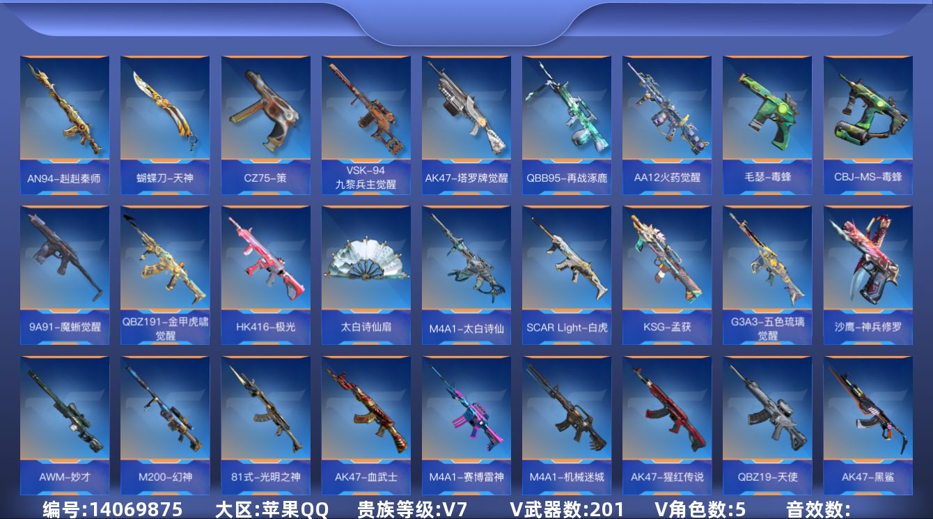 【英雄武器】:AK47-无影,AK47-火麒麟,AK47-黑武士觉醒,AK47-沙漠领主*3,AK47-樱斗士-超觉,AK47-竞技战魂,AK47-猩红传说,AK47-血武士*2,AK47-黑鲨,AK47-木兰,AK47-塔罗牌觉醒,AK47-谜城烟火,M4A1-雷神*2,M4A1-黑骑士,M4A1-死神,M4A1-君威GS,M4A1-武圣,M4A1-竞技战魂,M4A1-威侯,M4A1-机械迷城,M4A1-赛博雷神,M4A1-猎神,M4A1-夏清,M4A1-太白诗仙,SCAR-幽暗骑士,SCAR Light-白虎,SCAR-探星者,SCAR-心动PICK,AN94-赳赳秦师,FAMAS-湮灭,9A91-魔蜥觉醒,M14EBR-葫芦山庄,HK416-极光,HK417-炎龙铠甲,81式-光明之神,QBZ19-天使,G3A3-五色琉璃觉醒,G3A3-衍神兵,QBZ97-浩瀚征途,QBZ191-金甲虎啸觉醒,QBZ191-封神榜,AWM-天龙,AWM-妙才,AWM-天使,巴雷特-毁灭*6,巴雷特-极光,巴雷特-枪娘,巴雷特-朱雀,M200-幻神,09式狙-天神*2,98K-黑骑士,98K-星神,TAC-天使,VSK-94-九黎兵主觉醒,加特林-堡垒觉醒,加特林-蟒蛇,QBB95-极光,QBB95-再战涿鹿,MK5-极光,王者之烈,双持斯泰尔-天使,CBJ-MS-毒蜂,CZS2-心动次元觉醒,CZS2-血月,地狱火*2,地狱烈炎,AA12-火药觉醒,KSG-孟获,USP-机械迷城,USP-太白诗仙,沙鹰-修罗*2,沙鹰-神兵修罗*2,沙鹰-宇航兔兔,毛瑟-毒蜂,左轮-黑武士,左轮-卧龙觉醒,GLOCK18-武圣,改装GLOCK-黑龙,双持GLOCK18-本初,GLOCK18-猎神,双管猎枪-黑骑士,CZ75-策,激光短刃-黑骑士,蝴蝶刀-天神,女皇利刃-铁胆虎魄,炽芒蝶刃,匕首-浩瀚征途,龙啸,神罚战斧,手斧-机械迷