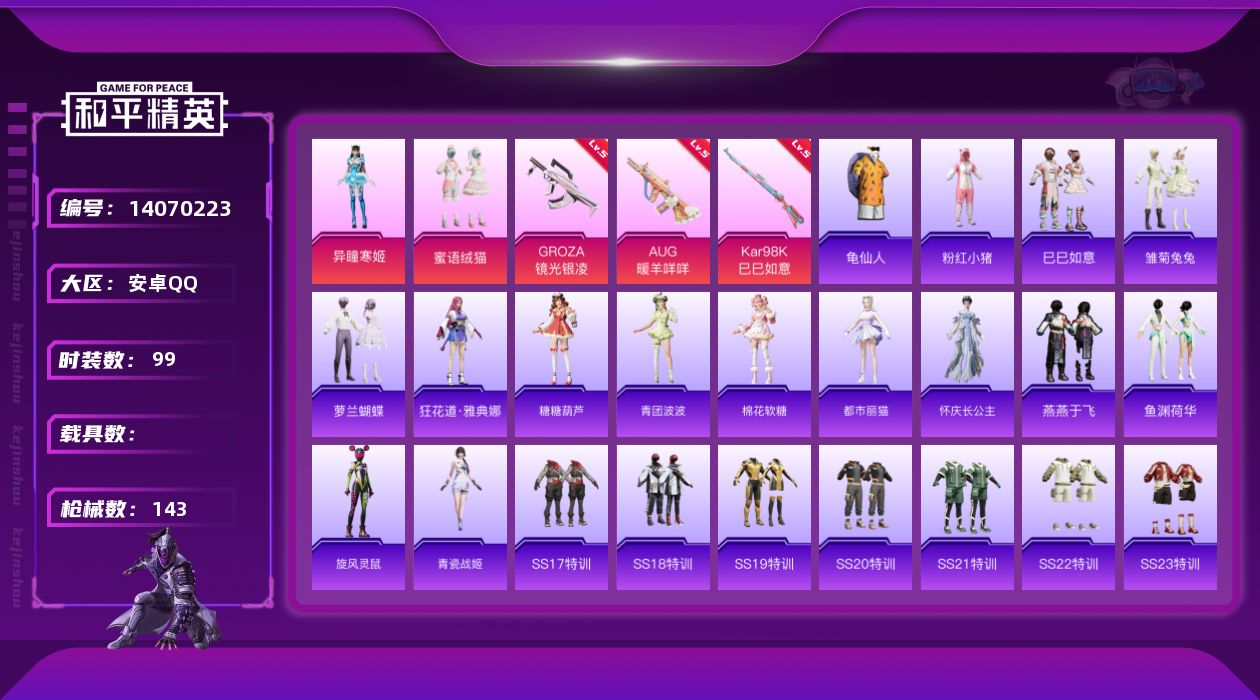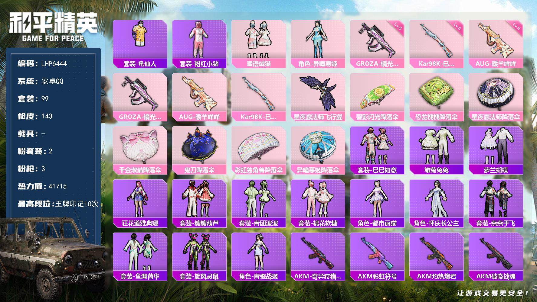 [14070223]【店主推荐捡漏号!可直接换绑】 安卓 手Q-2粉装-3特效枪-3粉色飞行器-4.1w热力值-10王牌印记-99套装-143枪皮【热门品类】:套装-龟仙人,套装-粉红小猪【粉色套装】:粉装-蜜语绒猫,角色-异瞳寒姬【粉色枪皮等级】:GROZA-镜光银凌(五级),AUG-暖羊咩咩(五级),Kar98K-巳巳如意(五级)【粉色飞行器】:星夜魔法师飞行翼