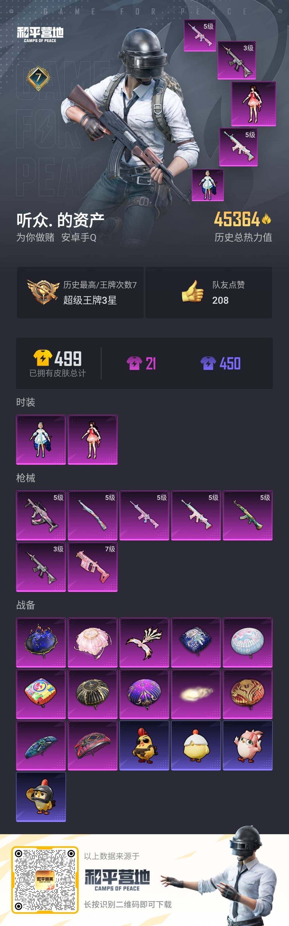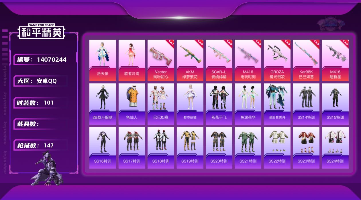 [14070244]可二次【店主推荐捡漏号!可直接换绑】 安卓 手Q-2粉装-7特效枪-2粉色飞行器-4.5w热力值-7王牌印记-101套装-147枪皮【热门品类】:角色-2B战斗服款,套装-龟仙人,套装-浪漫波比【粉色套装】:角色-洛天依,角色-歌者泠鸢【粉色枪皮等级】:AKM-绿萝繁花(五级),SCAR-L-锦绣绵绵(五级),M416-超新星(三级),M416-电玩时刻(五级),GROZA-镜光银凌(五级),Vector-飒粉甜心(七级),Kar98K-巳巳如意(五级)【粉色飞行器】:齐天大圣飞行器,凤舞九天飞行器