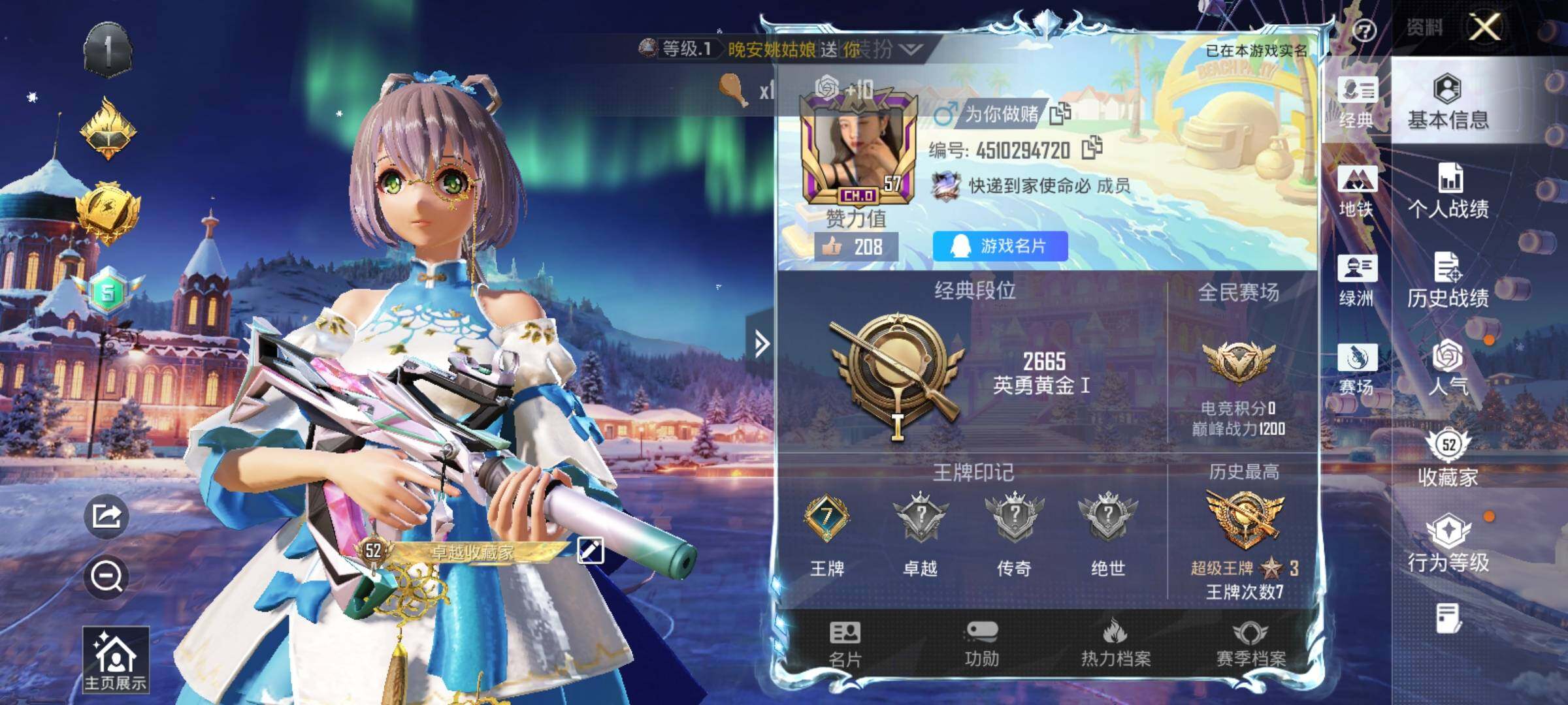 - PX_2108246-实名: 可修改 贵族等级: V7 英雄数: 123 皮肤数: 140 荣耀水晶: 杀手不太冷,星域神启 传说皮: 黄金射手座,幻光神枪 限定皮: 李小龙,天狼溯光者,如梦令-后羿,大圣娶亲,匿光追影者,傲雪梅枪,百木心枪,鸣野蒿 亮点: 【店长推荐精品号】3印记,贵7,2典藏诸葛亮星域神启 孙尚香杀手不太冷,3传说后裔黄金射手座