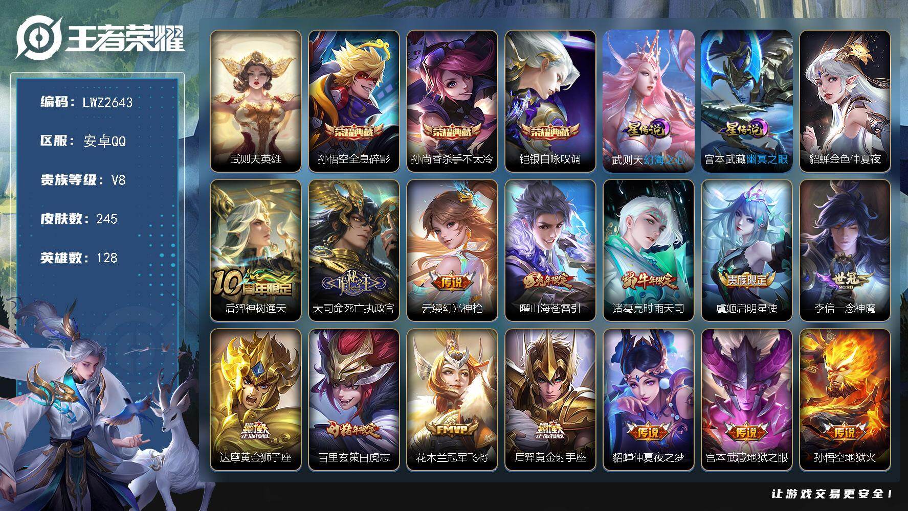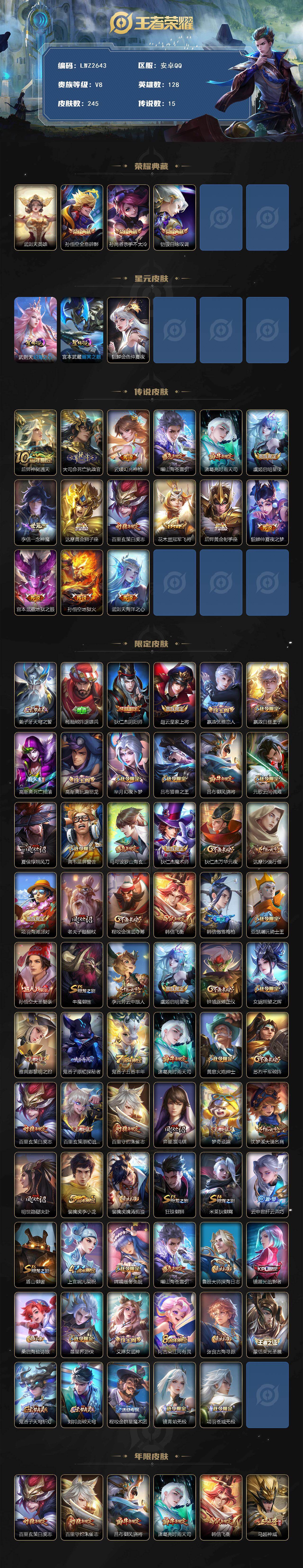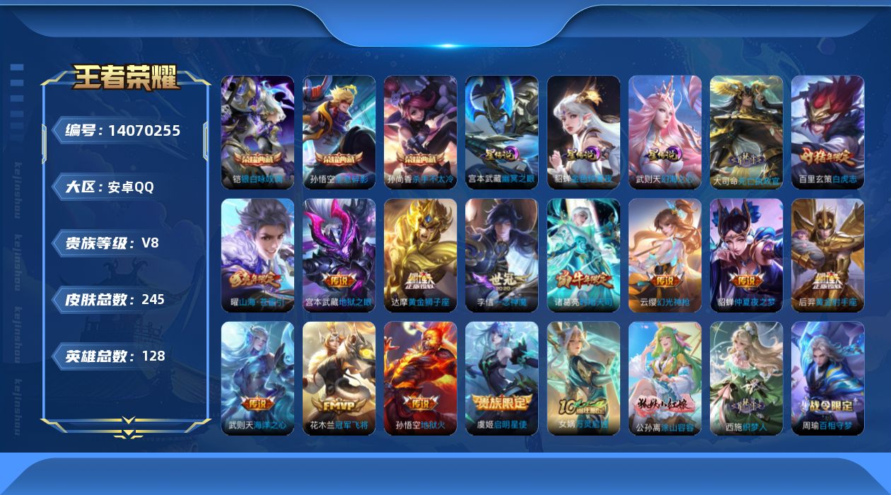 [14070255]【店主推荐捡漏号!可直接换绑】安卓Q-V8-最强王者段位40段打野2金标-128英雄-245皮肤-3典藏-3星元-15传说-71史诗 【荣耀典藏】:武则天英雄,孙悟空全息碎影,孙尚香杀手不太冷,铠银白咏叹调 【传说皮肤】:后羿神树通天,大司命死亡执政官,云缨幻光神枪,曜山海苍雷引,诸葛亮时雨天司,虞姬启明星使,李信一念神魔,达摩黄金狮子座,百里玄策白虎志,花木兰冠军飞将,后羿黄金射手座,貂蝉仲夏夜之梦,宫本武藏地狱之眼,孙悟空地狱火,武则天海洋之心 【限定皮肤】:姜子牙天穹之誓,杨戬破阵退雄兵,狄仁杰阴阳师,赵云皇家上将,嬴政优雅恋人,嬴政白昼王子,高渐离死亡摇滚,高渐离玩趣恶龙,芈月幻夜卜梦,吕布猎兽之王,吕布御风骁将,元歌云间偶戏,夏侯惇朔风刀,典韦蓝屏警告,马可波罗山海玄木吟,狄仁杰魔术师,狄仁杰万华元夜,达摩沙漠行僧,项羽海滩派对,老夫子醍醐杖,程咬金演武夺筹,韩信飞衡,韩信傲雪梅枪,亚瑟潮玩骑士王,孙悟空大圣娶亲,牛魔御旌,李元芳云中旅人,虞姬启明星使,钟馗驱傩正仪,女娲朔望之晖,雅典娜黎明之约,鬼谷子原初探秘者,鬼谷子五谷丰年,诸葛亮时雨天司,黄忠火炮绅士,苏烈千军破阵,百里玄策白虎志,百里玄策原初追逐者,百里守约朱雀志,弈星混沌棋,梦奇顽趣,沈梦溪大漠名商,明世隐疑决卦,裴擒虎李小龙,裴擒虎擒涛扼浪,狂铁御狮,米莱狄御霄,云中君纤云弄巧,盾山御銮,上官婉儿梁祝,嫦娥暖冬兔眠,曜山海苍雷引,鲁班大师探海日志,镜匿光追影者,桑启海盐诗旅,暃星界游侠,艾琳女武神,阿古朵江河有灵,张良古海寻踪,蒙恬荣光圣徽,鬼谷子天穹祈灯,刘邦剑破天穹,程咬金群星魔术团,镜青焰无极,项羽苍威无极 【年限皮肤】:百里玄策白虎志,百里守约朱雀志,吕布御风骁将,诸葛亮时雨天司,韩信飞衡,马超神威,马可波罗山海玄木吟,曜山海苍雷引 【赛季限定】:夏侯惇朔风刀,狄仁杰万华元夜,达摩沙漠行僧,老夫子醍醐杖,程咬金演武夺筹,张良古海寻踪,牛魔御旌,李元芳云中旅人,钟馗驱傩正仪,雅典娜黎明之约,鬼谷子原初探秘者,苏烈千军破阵,百里玄策原初追逐者,弈星混沌棋,梦奇顽趣,沈梦溪大漠名商,明世隐疑决卦,裴擒虎擒涛扼浪,狂铁御狮,米莱狄御霄,盾山御銮,鲁班大师探海日志,桑启海盐诗旅,鬼谷子天穹祈灯,蒙恬荣光圣徽,刘邦剑破天穹,姜子牙天穹之誓 【战令限定】:嬴政白昼王子,芈月幻夜卜梦,吕布猎兽之王,