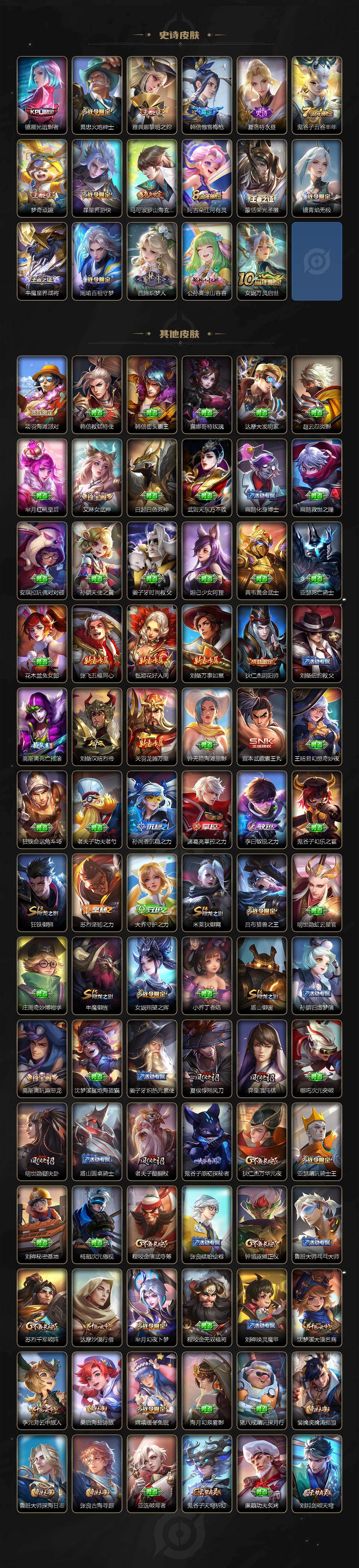 【限定皮肤】:姜子牙天穹之誓,杨戬破阵退雄兵,狄仁杰阴阳师,赵云皇家上将,嬴政优雅恋人,嬴政白昼王子,高渐离死亡摇滚,高渐离玩趣恶龙,芈月幻夜卜梦,吕布猎兽之王,吕布御风骁将,元歌云间偶戏,夏侯惇朔风刀,典韦蓝屏警告,马可波罗山海玄木吟,狄仁杰魔术师,狄仁杰万华元夜,达摩沙漠行僧,项羽海滩派对,老夫子醍醐杖,程咬金演武夺筹,韩信飞衡,韩信傲雪梅枪,亚瑟潮玩骑士王,孙悟空大圣娶亲,牛魔御旌,李元芳云中旅人,虞姬启明星使,钟馗驱傩正仪,女娲朔望之晖,雅典娜黎明之约,鬼谷子原初探秘者,鬼谷子五谷丰年,诸葛亮时雨天司,黄忠火炮绅士,苏烈千军破阵,百里玄策白虎志,百里玄策原初追逐者,百里守约朱雀志,弈星混沌棋,梦奇顽趣,沈梦溪大漠名商,明世隐疑决卦,裴擒虎李小龙,裴擒虎擒涛扼浪,狂铁御狮,米莱狄御霄,云中君纤云弄巧,盾山御銮,上官婉儿梁祝,嫦娥暖冬兔眠,曜山海苍雷引,鲁班大师探海日志,镜匿光追影者,桑启海盐诗旅,暃星界游侠,艾琳女武神,阿古朵江河有灵,张良古海寻踪,蒙恬荣光圣徽,鬼谷子天穹祈灯,刘邦剑破天穹,程咬金群星魔术团,镜青焰无极,项羽苍威无极