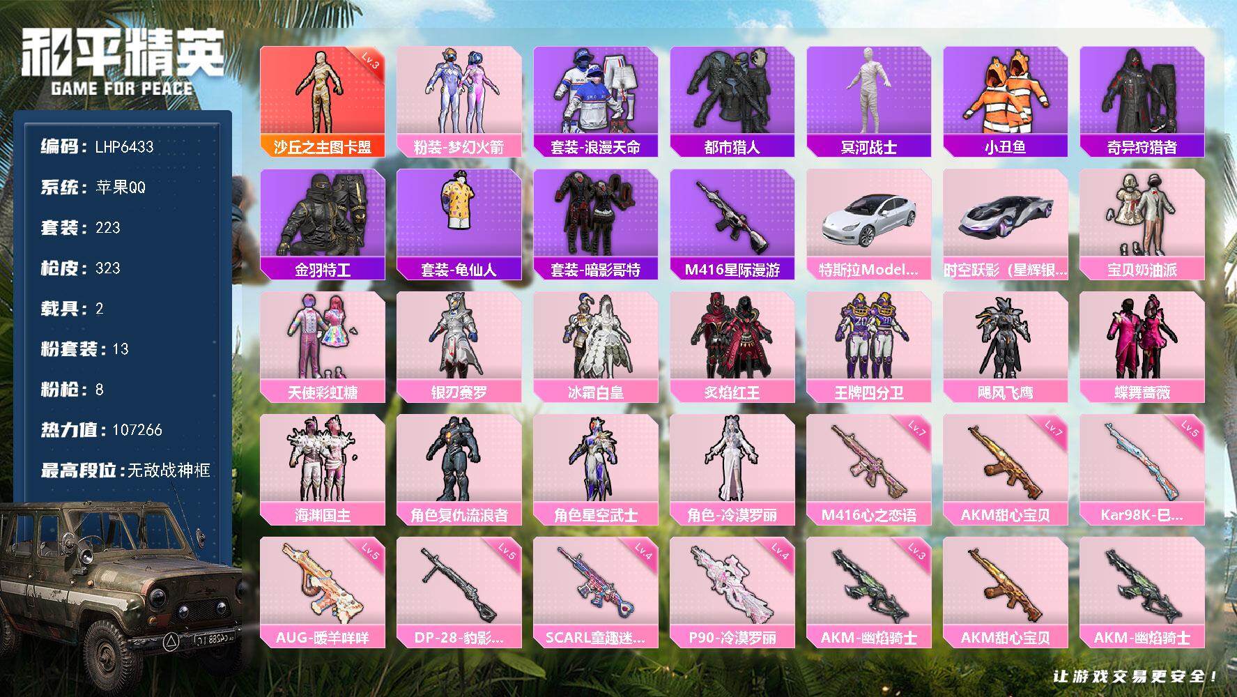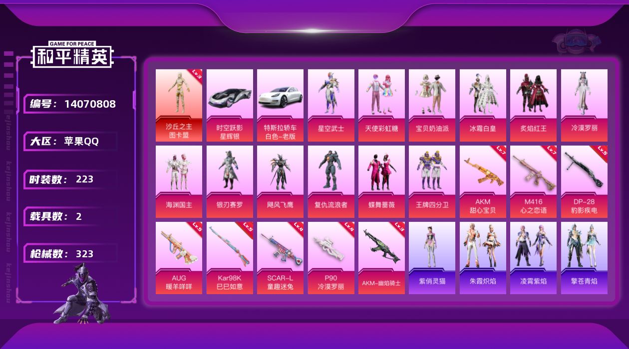 - [15226830]【店主推荐捡漏号!可直接换绑】 苹果 手Q-4粉装-1特效枪-1载具-1粉色飞行器-1.9w热力值-3王牌印记-41套装-59枪皮【热门品类】:粉装-梦幻火箭,角色-军刀雅典娜,套装-粉红小猪【粉色载具】:路特斯EVIJA(星际黄)【粉色套装】:粉装-梦幻火箭,粉装-傲雪凌霜,粉装-霁雪冰心,角色-羊梦糖心【粉色枪皮等级】:DP-28-豹影疾电(五级)