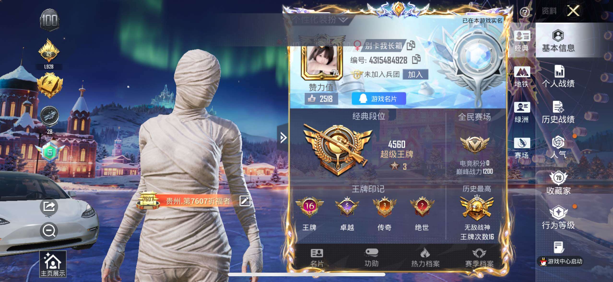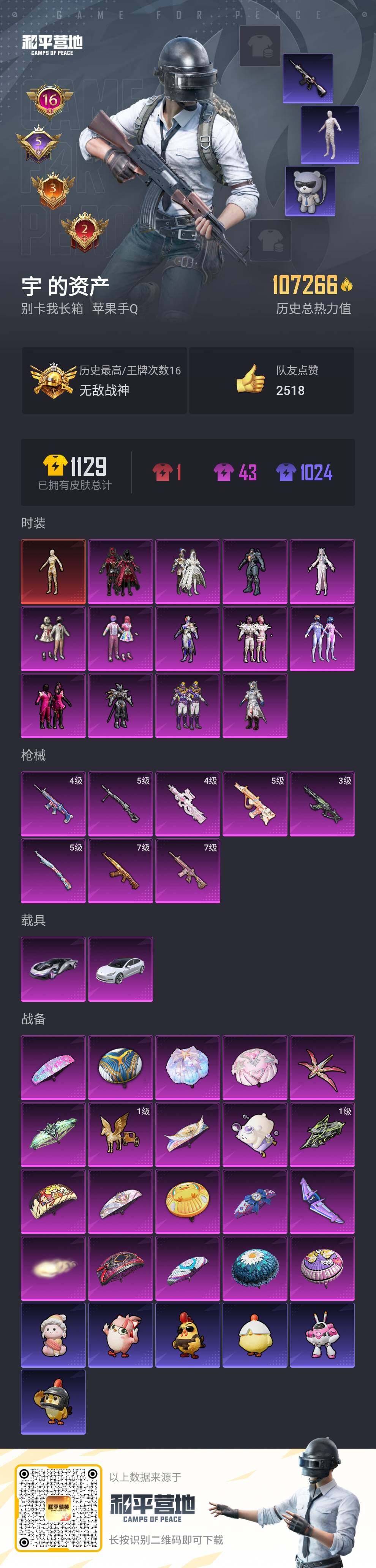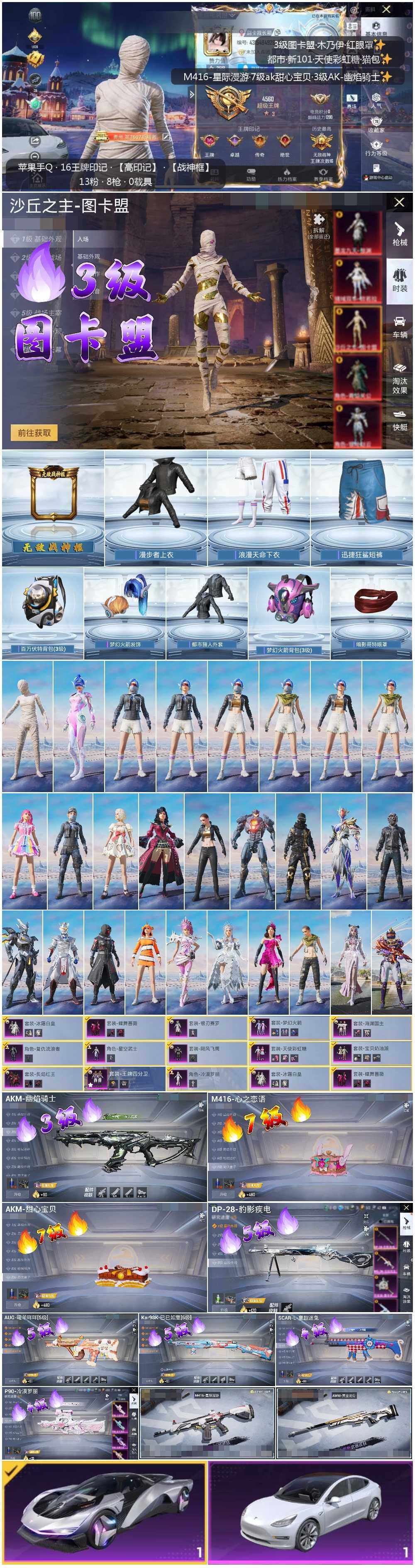 [14070808]可二次【店主推荐捡漏号!可直接换绑】/素材身法号/老木乃伊/无敌战神框1/绝世印记2 苹果 手Q-无敌战神框-1神装-13粉装-8特效枪-2载具-6粉色飞行器-10.7w热力值-16王牌印记-223套装-323枪皮【红色神装等级】:沙丘之主-图卡盟(三级)【热门品类】:粉装-梦幻火箭,套装-浪漫天命,套装-都市猎人,套装-冥河战士,套装-小丑鱼,套装-奇异狩猎者,套装-金羽特工,套装-龟仙人,套装-暗影哥特,M416-星际漫游【粉色载具】:特斯拉Model 3(珍珠白),时空跃影(星辉银)【粉色套装】:粉装-宝贝奶油派,粉装-天使彩虹糖,粉装-梦幻火箭,粉装-银刃赛罗,粉装-冰霜白皇,粉装-炙焰红王,粉装-王牌四分卫,粉装-飓风飞鹰,粉装-蝶舞蔷薇,粉装-海渊国主,角色-复仇流浪者,角色-星空武士,角色-冷漠罗丽【粉色枪皮等级】:AKM-甜心宝贝(七级),AKM-幽焰骑士(三级),SCAR-L-童趣迷兔(四级),M416-心之恋语(七级),AUG-暖羊咩咩(五级),P90-冷漠罗丽(四级),Kar98K-巳巳如意(五级),DP-28-豹影疾电(五级)【粉色飞行器】:酣梦熊熊飞行器,梦幻火箭飞行器,齐天大圣飞行器,沙丘之主天马,幽焰列车飞行器