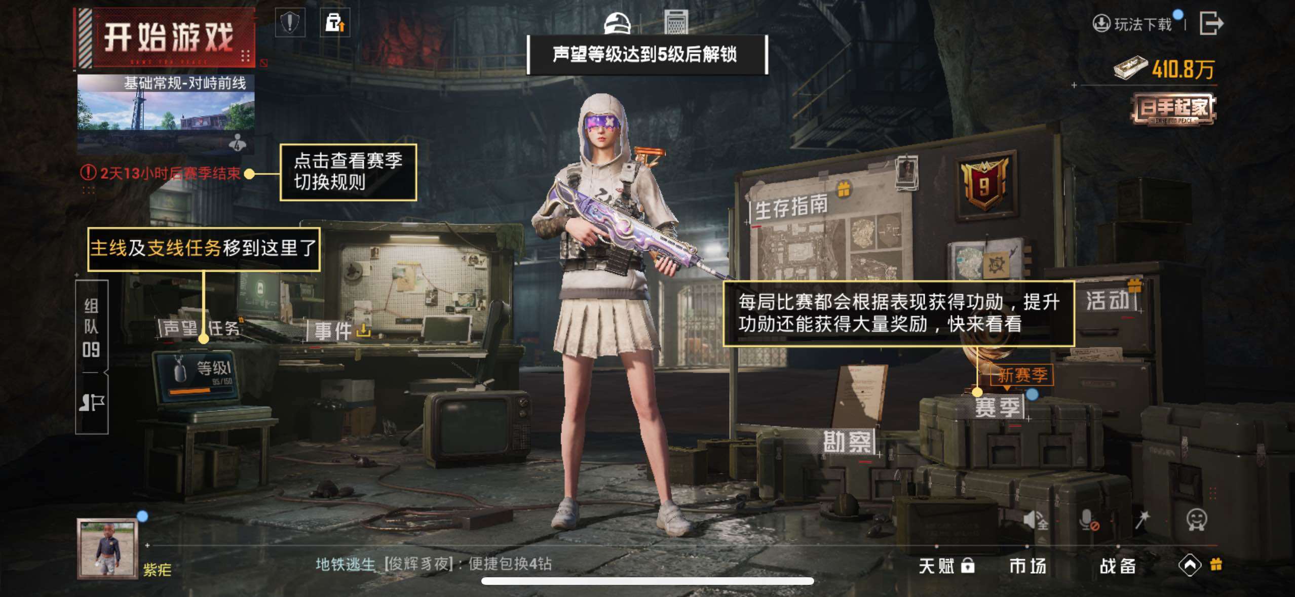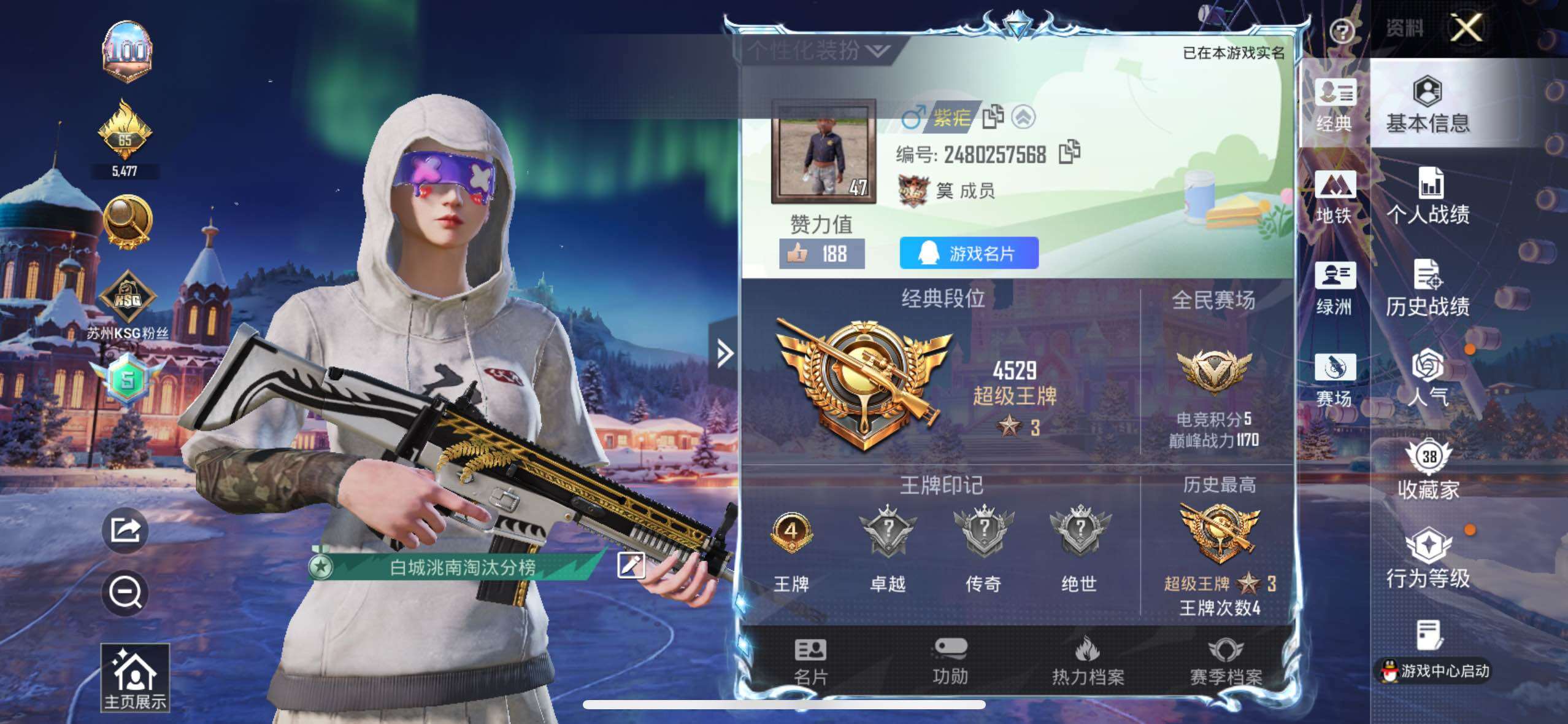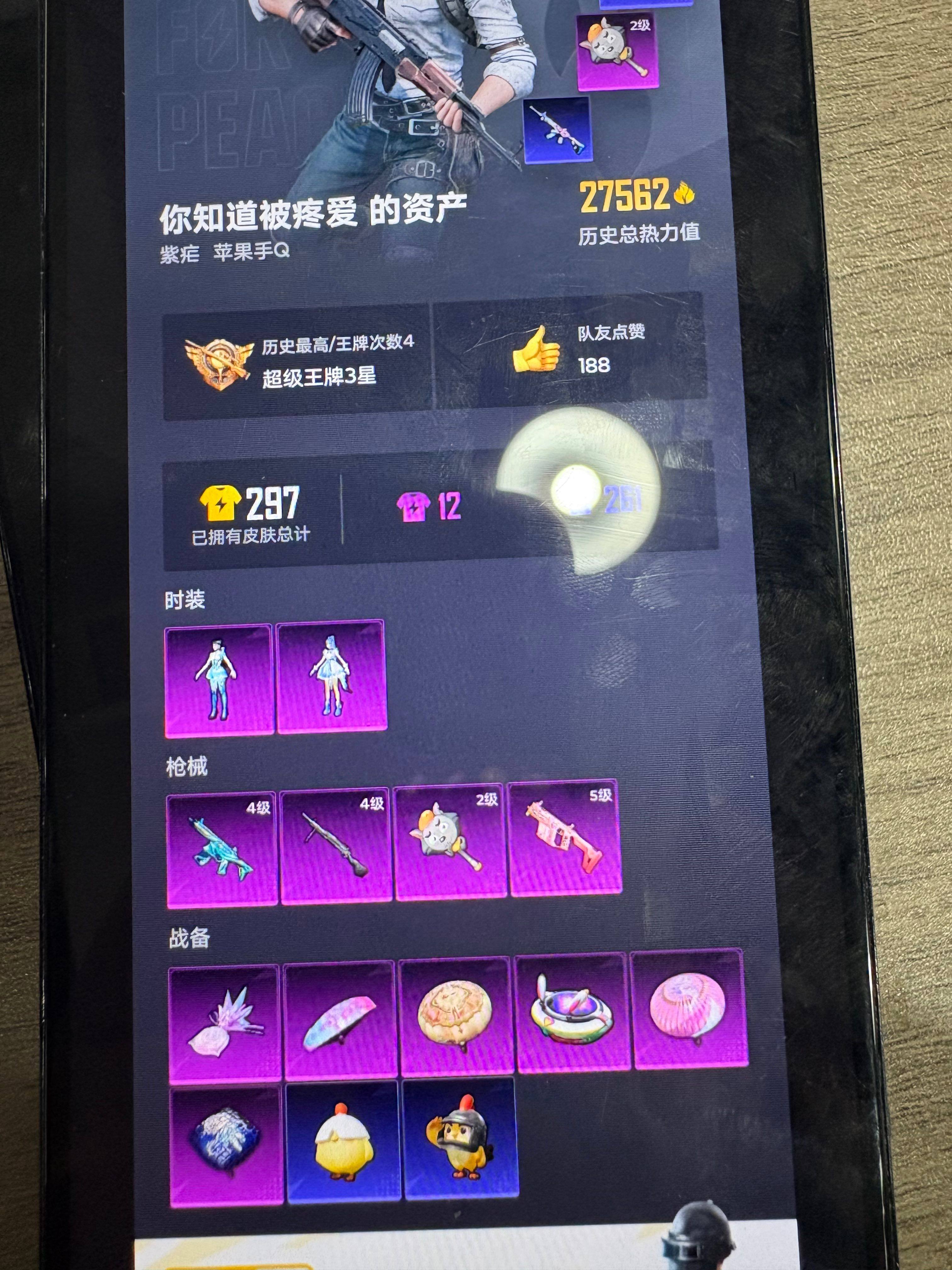 - [10197291]实名: 可修改 时装数: 563 载具数: 7 枪械数: 210 战备数: 136 热门装扮: 奇异狩猎者,梦幻火箭(新101),呆萌铁蟹,宝贝奶油派,浪漫波比,天使彩虹糖,放客神游,鹰眼刺客,缤纷油彩,酷熊伴侣,萌熊伴侣,香水柠檬,绚金战神,极致幻想,冥河战士,沙漠守护者,激萌罗小黑,浪客战士,神秘黑猫,暗夜魅影,狂魅哈莉 载具: 玛莎拉蒂Ghibli(粉),双人摩托-双刃魅影(红),阿斯顿·马丁DBS(绿),阿斯顿·马丁DBX(橙),合金龙骨(绿),特斯拉Roadster(水滴蓝),兰博基尼Aventador SVJ(翡翠绿) 稀有枪皮: M416心之恋语,AKM梦之光华,GROZA焦糖拿铁,SCAR-L青春物语,Kar98K-巳巳如意,AUG-暖羊咩咩,Mk14-爆裂游戏,破片手榴弹-美味星星糖
