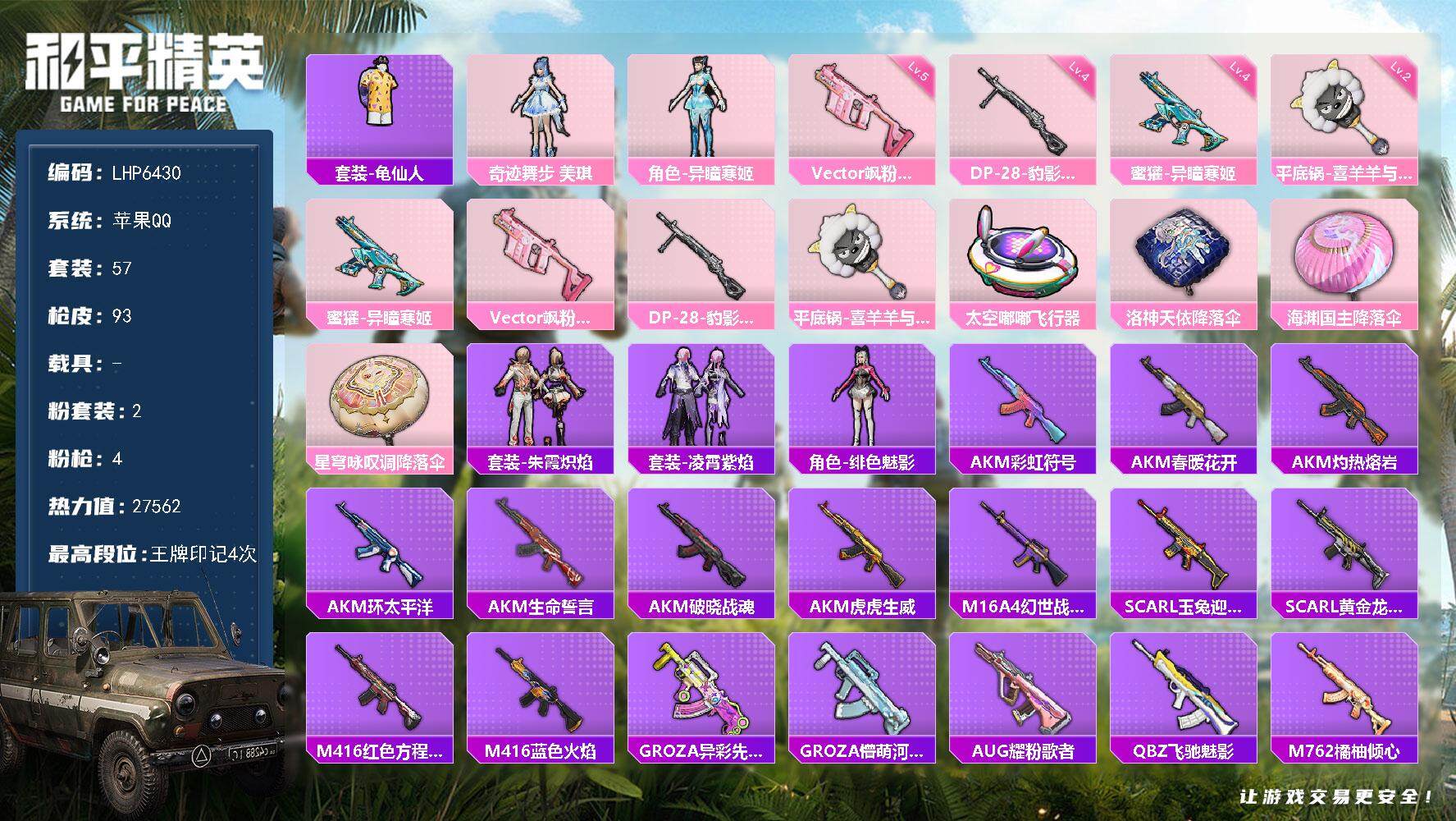 [14070864]【店主推荐捡漏号!可直接换绑】 苹果 手Q-2粉装-4特效枪-2粉色飞行器-2.7w热力值-4王牌印记-57套装-93枪皮【热门品类】:套装-龟仙人【粉色套装】:角色-奇迹舞步 美琪,角色-异瞳寒姬【粉色枪皮等级】:蜜獾-异瞳寒姬(四级),Vector-飒粉甜心(五级),DP-28-豹影疾电(四级),平底锅-喜羊羊与灰太狼(二级)【粉色飞行器】:太空嘟嘟飞行器