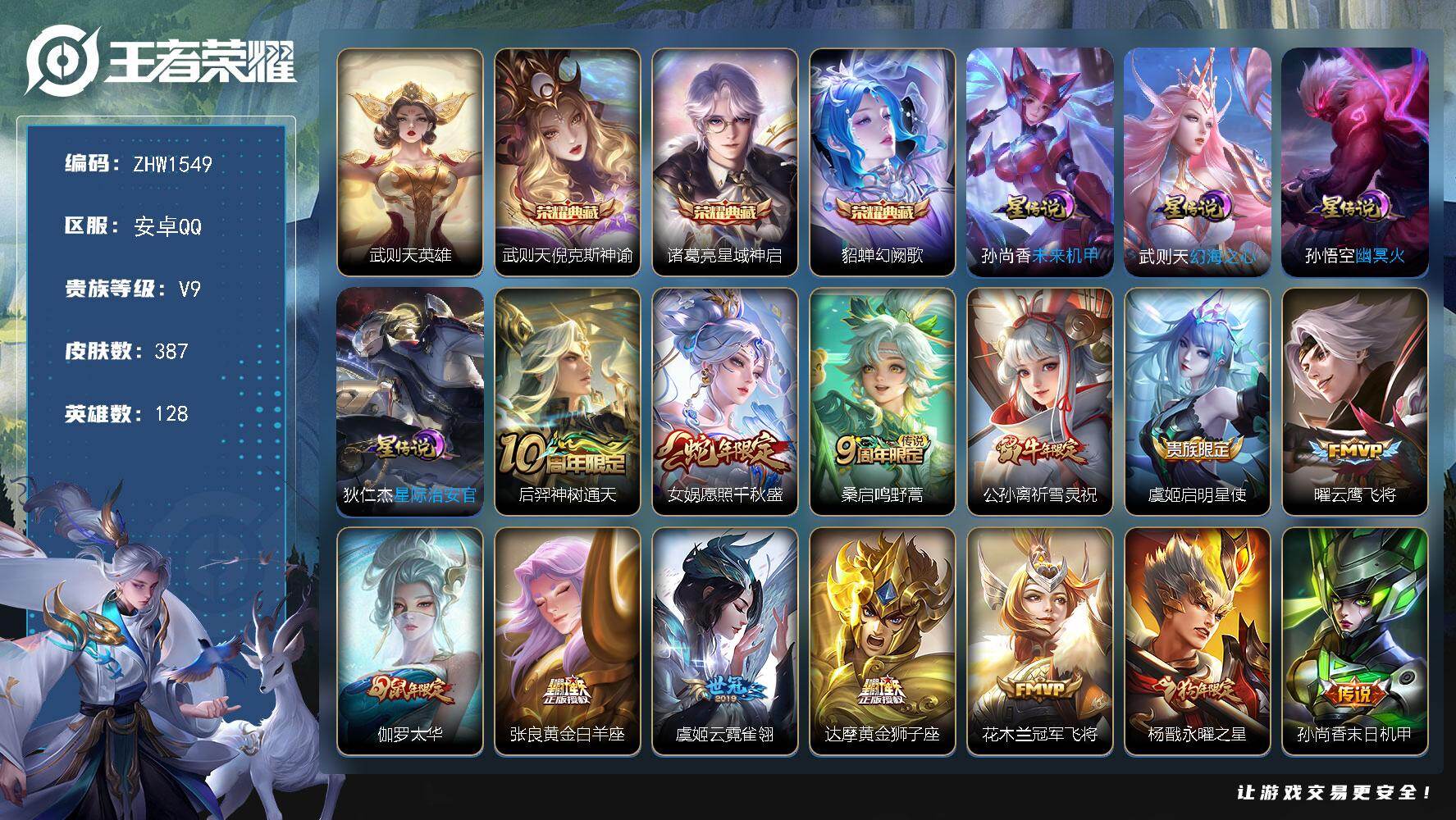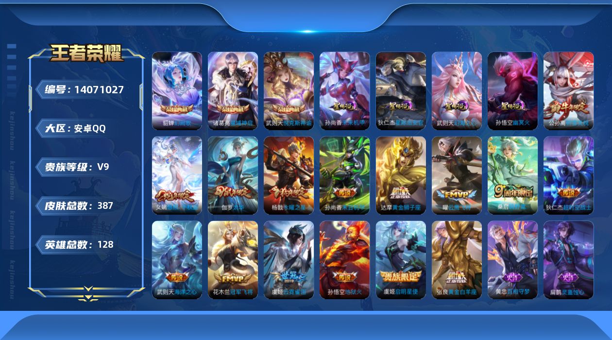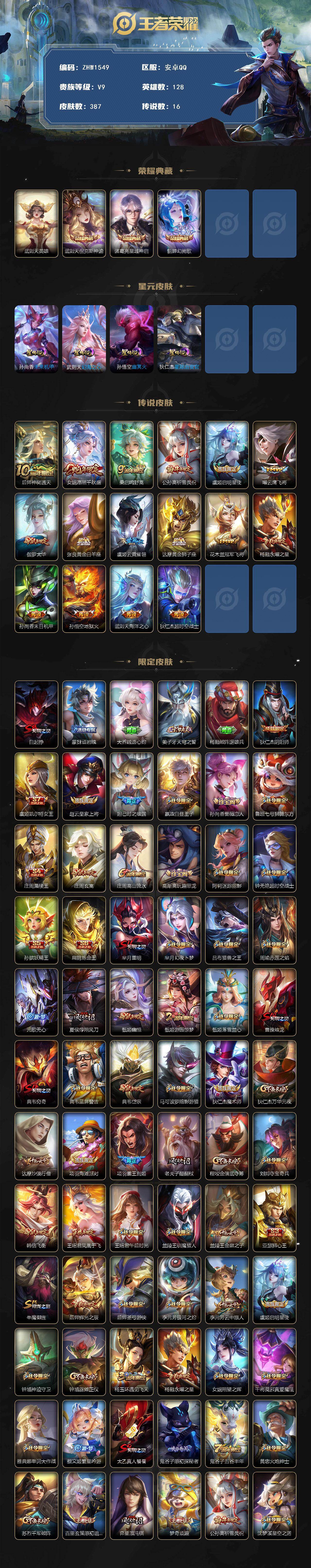 [14071027]可二次【店主推荐捡漏号!可直接换绑】安卓Q-V9-至尊星耀II段位-128英雄-387皮肤-3典藏-16传说-102史诗 【英雄全皮】:刘邦全皮,钟馗全皮,猪八戒全皮,蒙恬全皮,影全皮 【荣耀典藏】:武则天英雄,武则天倪克斯神谕,诸葛亮星域神启,貂蝉幻阙歌 【传说皮肤】:后羿神树通天,女娲愿照千秋盛,桑启鸣野蒿,公孙离祈雪灵祝,虞姬启明星使,曜云鹰飞将,伽罗太华,张良黄金白羊座,虞姬云霓雀翎,达摩黄金狮子座,花木兰冠军飞将,杨戬永曜之星,孙尚香末日机甲,孙悟空地狱火,武则天海洋之心,狄仁杰超时空战士 【限定皮肤】:白起狰,蒙犽顽岩魄,大乔绒语心约,姜子牙天穹之誓,杨戬破阵退雄兵,狄仁杰阴阳师,虞姬凯尔特女王,赵云皇家上将,妲己时之彼端,嬴政白昼王子,孙尚香蔷薇恋人,鲁班七号狮舞东方,庄周蜃楼王,庄周玄嵩,庄周高山流水,高渐离玩趣恶龙,阿轲迷踪丽影,钟无艳超时空战士,孙膑妖精王,扁鹊炼金王,芈月重明,芈月幻夜卜梦,吕布猎兽之王,周瑜赤莲之焰,元歌无心,夏侯惇朔风刀,甄姬幽恒,甄姬游园惊梦,甄姬落雪兰心,曹操烛龙,典韦穷奇,典韦蓝屏警告,典韦岱宗,马可波罗暗影游猎,狄仁杰魔术师,狄仁杰万华元夜,达摩沙漠行僧,项羽海滩派对,项羽霸王别姬,老夫子醍醐杖,程咬金演武夺筹,刘邦夺宝奇兵,韩信飞衡,王昭君凤凰于飞,王昭君午后时光,兰陵王驯魔猎人,兰陵王金庭之子,亚瑟狮心王,牛魔御旌,后羿辉光之辰,后羿圣弓游侠,李元芳银河之约,李元芳云中旅人,虞姬启明星使,钟馗神迹守卫,钟馗驱傩正仪,杨玉环遇见飞天,杨戬永曜之星,女娲朔望之晖,干将莫邪真爱魔法,雅典娜单词大作战,蔡文姬繁星吟游,太乙真人饕餮,鬼谷子原初探秘者,鬼谷子五谷丰年,黄忠火炮绅士,苏烈千军破阵,百里玄策原初追逐者,弈星混沌棋,梦奇顽趣,公孙离祈雪灵祝,沈梦溪星空之诺,沈梦溪大漠名商,明世隐疑决卦,裴擒虎李小龙,裴擒虎擒涛扼浪,狂铁御狮,狂铁电玩高手,米莱狄御霄,云中君纤云弄巧,伽罗太华,盾山御銮,猪八戒西部大镖客,猪八戒猪悟能,上官婉儿梁祝,嫦娥拒霜思,嫦娥暖冬兔眠,蒙犽狂想玩偶喵,鲁班大师探海日志,桑启海盐诗旅,暃星界游侠,艾琳女武神,艾琳流音漫舞,司空震地狱燃心,阿古朵江河有灵,张良古海寻踪,蒙犽百解令,蒙恬荣光圣徽,高渐离燃音魔法,妲己灵卜魔法,鬼谷子天穹祈灯,姬小满妄想食味,沈梦溪龙舞盛年,刘邦剑破天穹,程咬金群