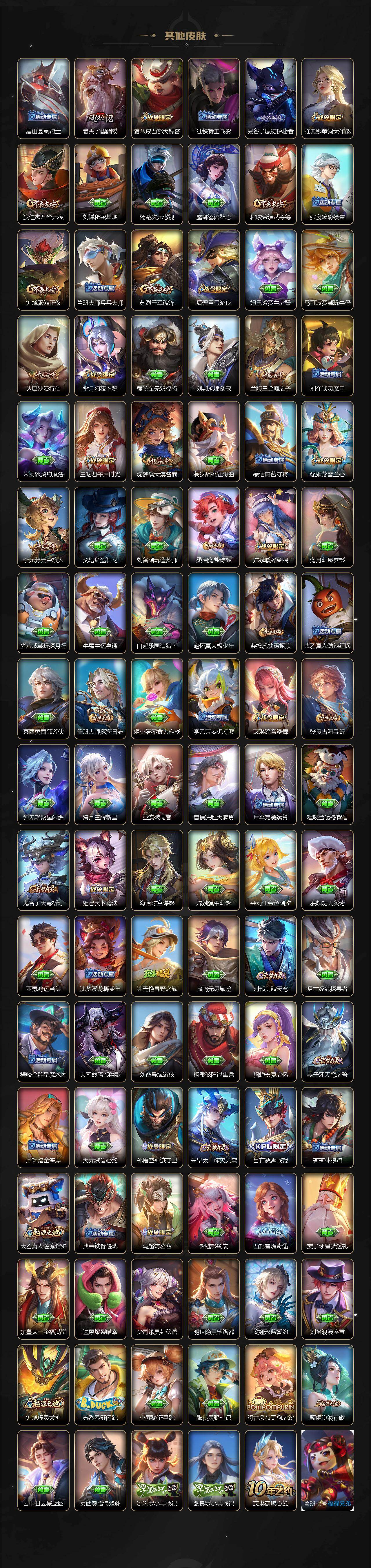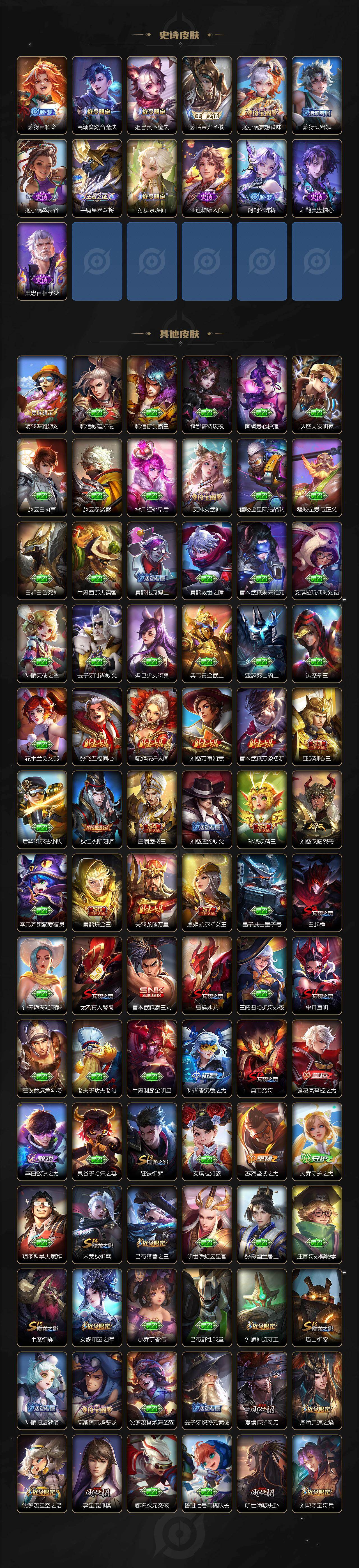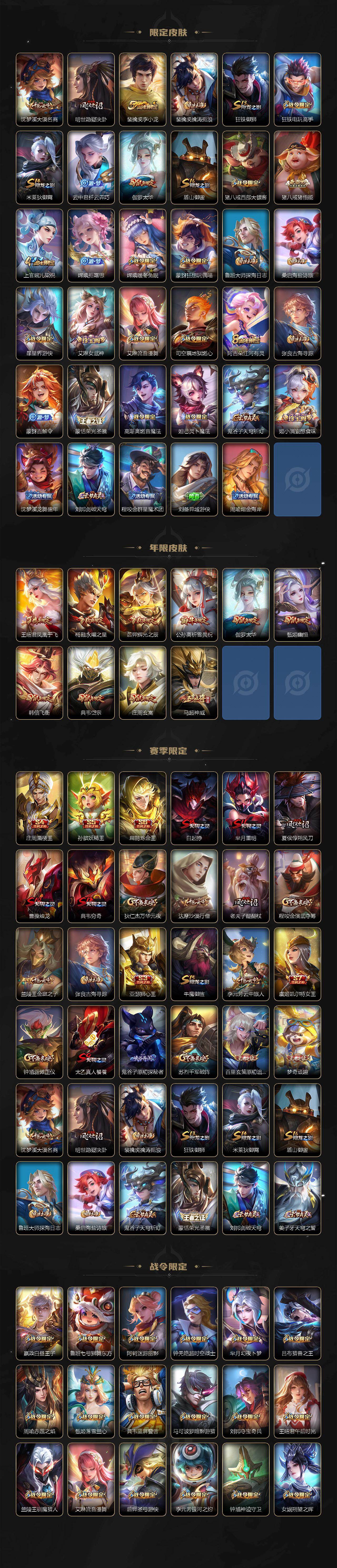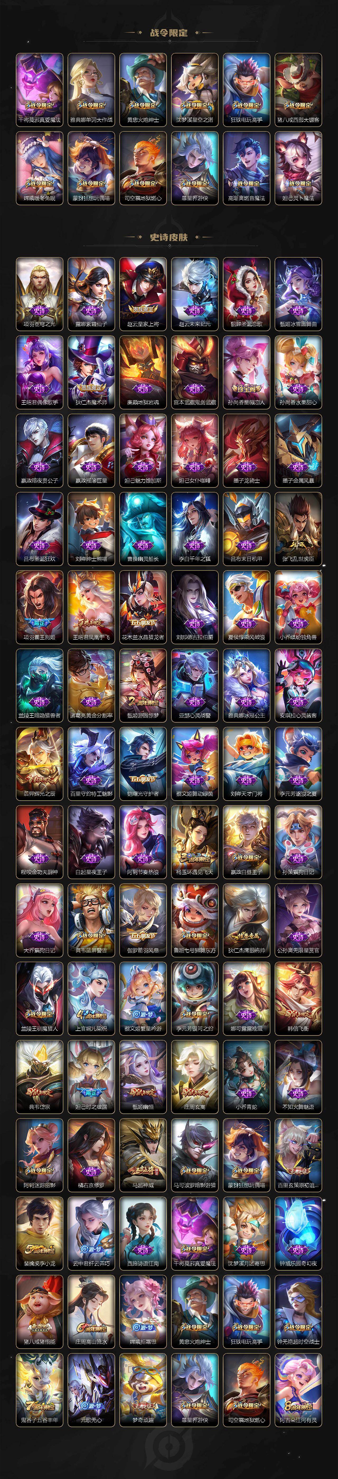 【限定皮肤】:白起狰,蒙犽顽岩魄,大乔绒语心约,姜子牙天穹之誓,杨戬破阵退雄兵,狄仁杰阴阳师,虞姬凯尔特女王,赵云皇家上将,妲己时之彼端,嬴政白昼王子,孙尚香蔷薇恋人,鲁班七号狮舞东方,庄周蜃楼王,庄周玄嵩,庄周高山流水,高渐离玩趣恶龙,阿轲迷踪丽影,钟无艳超时空战士,孙膑妖精王,扁鹊炼金王,芈月重明,芈月幻夜卜梦,吕布猎兽之王,周瑜赤莲之焰,元歌无心,夏侯惇朔风刀,甄姬幽恒,甄姬游园惊梦,甄姬落雪兰心,曹操烛龙,典韦穷奇,典韦蓝屏警告,典韦岱宗,马可波罗暗影游猎,狄仁杰魔术师,狄仁杰万华元夜,达摩沙漠行僧,项羽海滩派对,项羽霸王别姬,老夫子醍醐杖,程咬金演武夺筹,刘邦夺宝奇兵,韩信飞衡,王昭君凤凰于飞,王昭君午后时光,兰陵王驯魔猎人,兰陵王金庭之子,亚瑟狮心王,牛魔御旌,后羿辉光之辰,后羿圣弓游侠,李元芳银河之约,李元芳云中旅人,虞姬启明星使,钟馗神迹守卫,钟馗驱傩正仪,杨玉环遇见飞天,杨戬永曜之星,女娲朔望之晖,干将莫邪真爱魔法,雅典娜单词大作战,蔡文姬繁星吟游,太乙真人饕餮,鬼谷子原初探秘者,鬼谷子五谷丰年,黄忠火炮绅士,苏烈千军破阵,百里玄策原初追逐者,弈星混沌棋,梦奇顽趣,公孙离祈雪灵祝,沈梦溪星空之诺,沈梦溪大漠名商,明世隐疑决卦,裴擒虎李小龙,裴擒虎擒涛扼浪,狂铁御狮,狂铁电玩高手,米莱狄御霄,云中君纤云弄巧,伽罗太华,盾山御銮,猪八戒西部大镖客,猪八戒猪悟能,上官婉儿梁祝,嫦娥拒霜思,嫦娥暖冬兔眠,蒙犽狂想玩偶喵,鲁班大师探海日志,桑启海盐诗旅,暃星界游侠,艾琳女武神,艾琳流音漫舞,司空震地狱燃心,阿古朵江河有灵,张良古海寻踪,蒙犽百解令,蒙恬荣光圣徽,高渐离燃音魔法,妲己灵卜魔法,鬼谷子天穹祈灯,姬小满妄想食味,沈梦溪龙舞盛年,刘邦剑破天穹,程咬金群