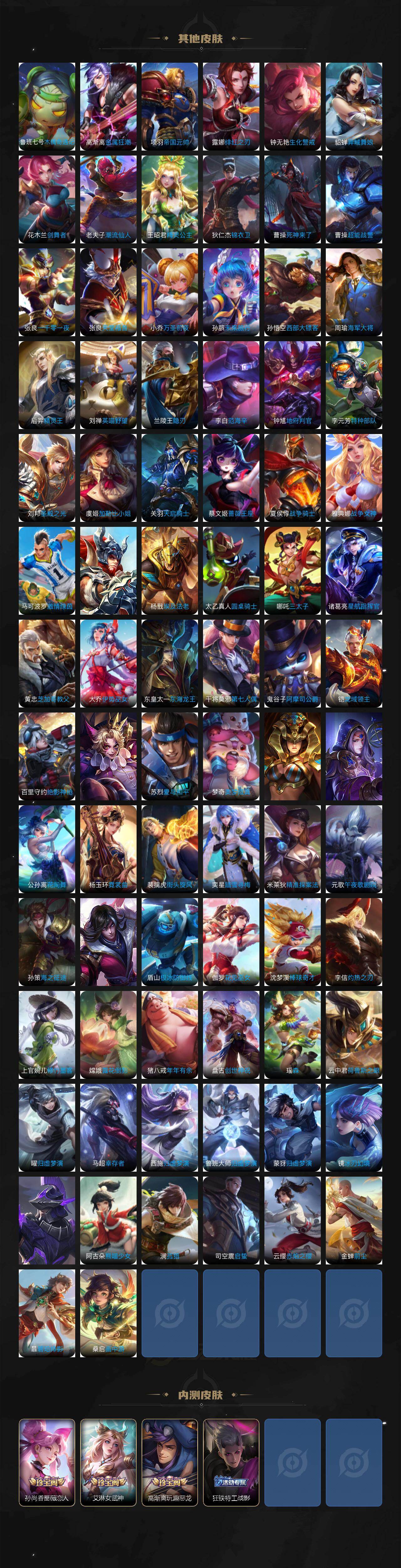 亚瑟狮心王,庄周蜃楼王,孙膑妖精王,扁鹊炼金王,虞姬凯尔特女王,白起狰,太乙真人饕餮,曹操烛龙,芈月重明,典韦穷奇,狂铁御狮,米莱狄御霄,牛魔御旌,盾山御銮,夏侯惇朔风刀,明世隐疑决卦,老夫子醍醐杖,鬼谷子原初探秘者,狄仁杰万华元夜,程咬金演武夺筹,钟馗驱傩正仪,苏烈千军破阵,吕布猎兽之王,嬴政白昼王子,女娲朔望之晖,典韦蓝屏警告,钟馗神迹守卫,鲁班七号狮舞东方,沈梦溪星空之诺,李元芳银河之约,刘邦夺宝奇兵,马可波罗暗影游猎,蒙犽狂想玩偶喵,弈星混沌棋,达摩沙漠行僧,兰陵王金庭之子,沈梦溪大漠名商,李元芳云中旅人,桑启海盐诗旅,裴擒虎擒涛扼浪,鲁班大师探海日志,张良古海寻踪