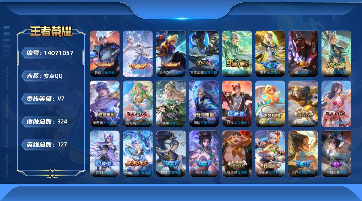- [11516123]V8 1典藏 14传说 122英雄 228皮肤 可修改实名 优质装备:鸣剑·曳影,云鹰飞将(小将军),猫影幻舞,久胜战神,云霓雀翎,地狱火,仲夏夜之梦(大飞蛾),零号·赤焰,游龙清影(小青龙) 珍宝阁皮:女武神 限定皮:至尊宝,白虎志(电光耗子),梅西,异界灵契(白毛香),白鹤梁神女,时雨天司(水龙头),飞衡(韩信年限),高山流水,五谷丰年,游园惊梦,梁祝,御风骁将(吕布年限),天狼狩猎者,龙胆,逐梦之翼,逐梦之星,天狼溯光者,祈雪灵祝(雪兔子),李小龙,逐梦之影,逐梦之光,霸王别姬-项羽,霸王别姬-虞姬,默契交锋-花木兰,大圣娶亲,青春决赛季,蜜橘之夏,寅虎·御盾(廉颇年限),寅虎·赤拳(老虎年限) 史诗皮:紫霞仙子,白龙吟,千年之狐,偶像歌手,魅语,冰冠公主,猫狗日记-孙策,时之恋人-孙尚香,乱世虎臣,节奏热浪,女仆咖啡,摇滚巨星,水果甜心,天才门将,星夜王子,功夫厨神,德古拉伯爵,暗隐猎兽者,幽灵船长,鬼剑武藏,繁星吟游(呼啦呼啦),拒霜思,缤纷独角兽,乘风破浪,逐浪之夏,水晶猎龙者,曙光守护者,箭羽风息,金属风暴,圣诞恋歌,鹰眼统帅,魅力维加斯,寅虎·御盾