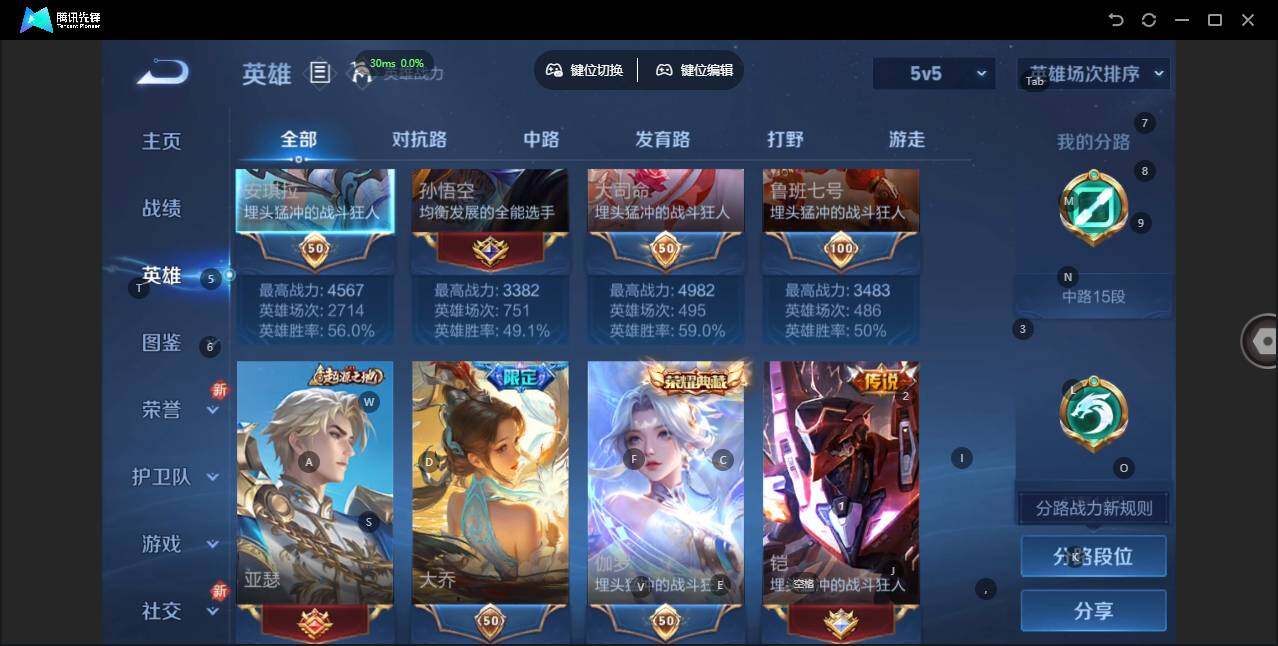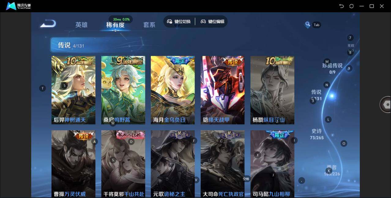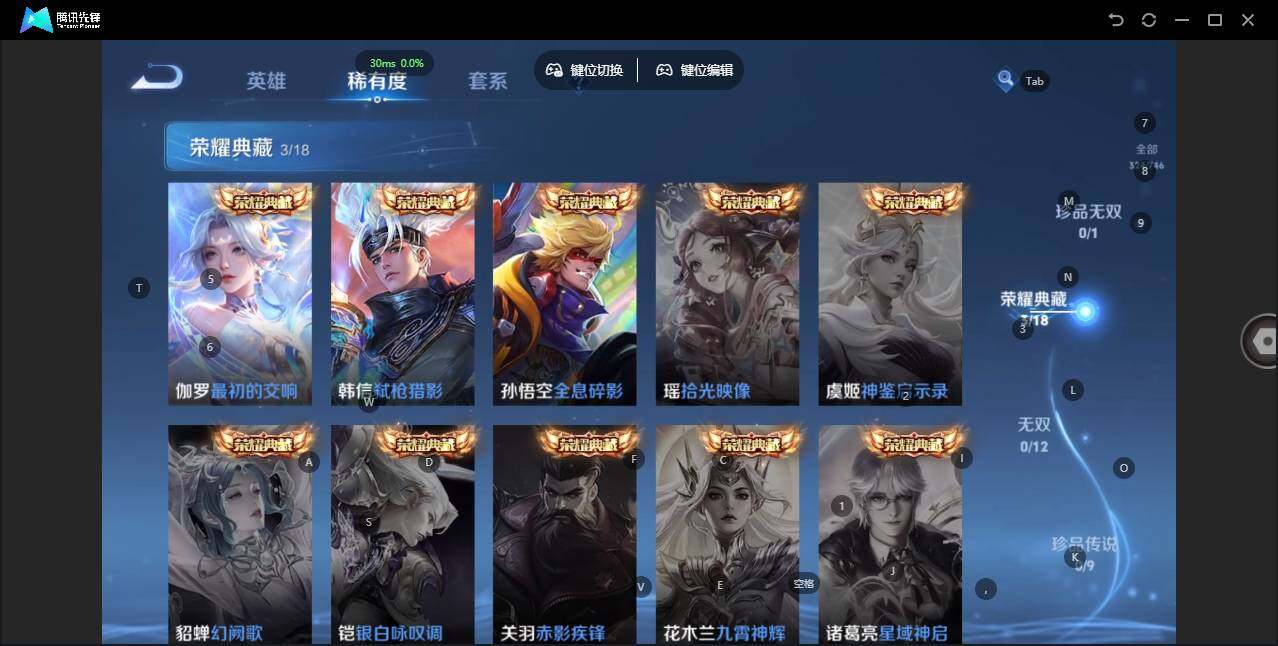 - [11971209]猴子典藏,久胜,紫霞,-可二次-108英雄-165皮肤-1典藏-7传说-31史诗 辉光之辰-后羿 街头霸王-韩信
