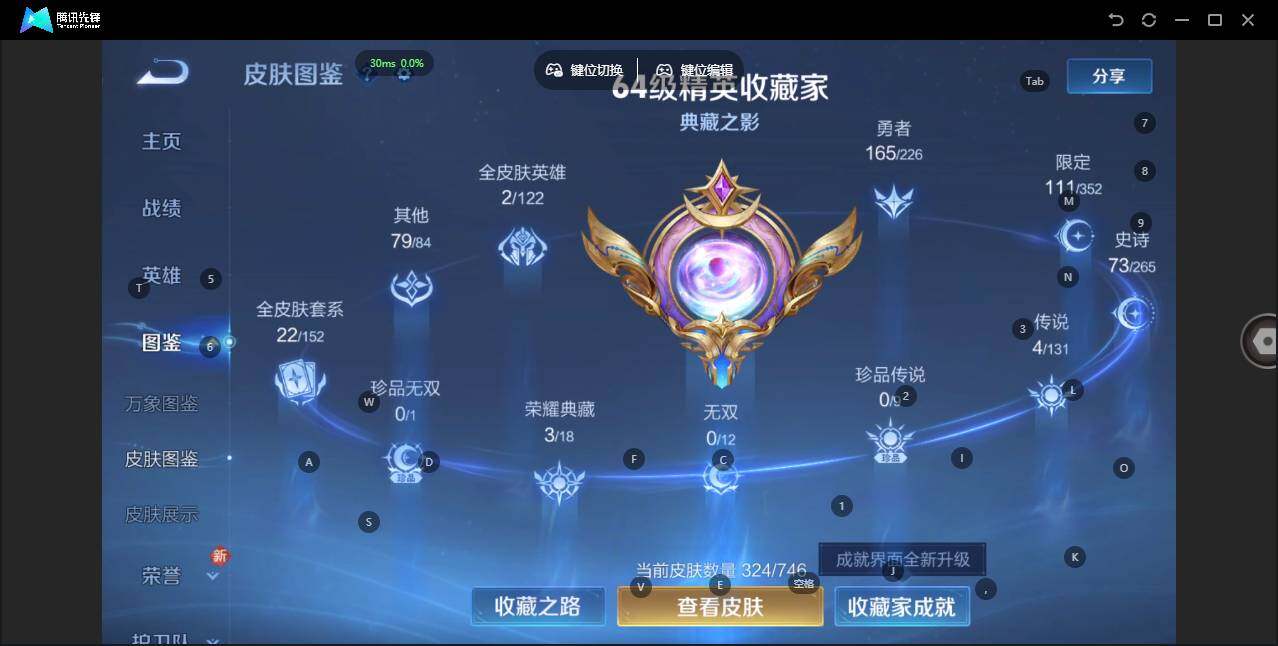 - PX_2054271-贵族等级: V7 英雄数: 117 皮肤数: 160 荣耀水晶: 神鉴启示录 无双皮: 雪境奇遇-甄姬 传说皮: 浮生妄,幻光神枪 限定皮: 李小龙,游园惊梦,梁祝,至尊宝,高山流水,孙行者,傲雪梅枪,五谷丰年,降魔,愿照·众生和,愿照·山河定,愿照·岁时盈