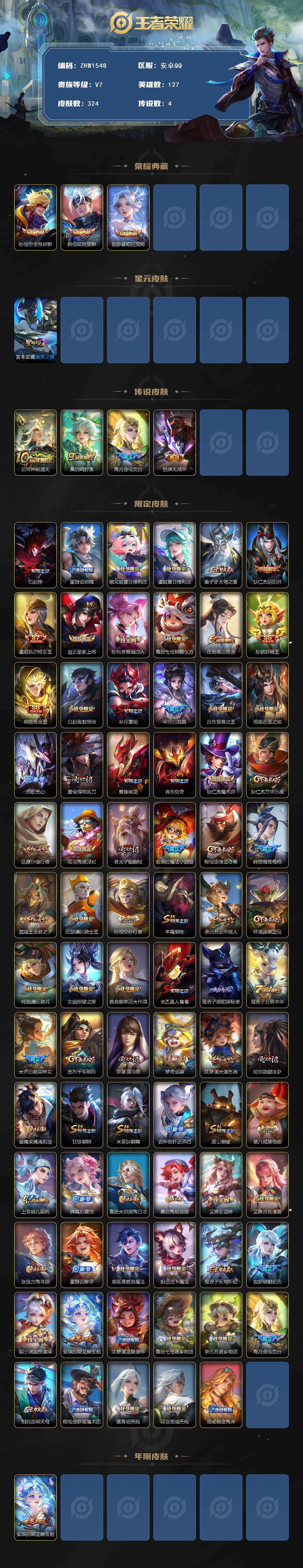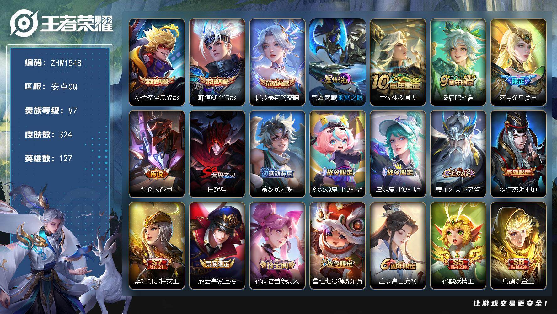 [14071057]可二次【店主推荐捡漏号!可直接换绑】安卓Q-V7-永恒钻石III段位-127英雄-324皮肤-3典藏-4传说-73史诗 【英雄全皮】:鬼谷子全皮,影全皮 【荣耀典藏】:孙悟空全息碎影,韩信弑枪猎影,伽罗最初的交响 【传说皮肤】:后羿神树通天,桑启鸣野蒿,海月金乌负日,铠绛天战甲 【限定皮肤】:白起狰,蒙犽顽岩魄,蔡文姬夏日便利店,虞姬夏日便利店,姜子牙天穹之誓,狄仁杰阴阳师,虞姬凯尔特女王,赵云皇家上将,孙尚香蔷薇恋人,鲁班七号狮舞东方,庄周高山流水,孙膑妖精王,扁鹊炼金王,白起夜都怪侠,芈月重明,芈月白晶晶,吕布猎兽之王,周瑜赤莲之焰,元歌无心,夏侯惇朔风刀,曹操烛龙,典韦穷奇,狄仁杰魔术师,狄仁杰万华元夜,达摩沙漠行僧,项羽海滩派对,老夫子醍醐杖,安琪拉魔法小厨娘,程咬金演武夺筹,韩信傲雪梅枪,兰陵王金庭之子,亚瑟潮玩骑士王,孙悟空孙行者,牛魔御旌,李元芳云中旅人,钟馗驱傩正仪,杨戬潮玩骑兵,女娲朔望之晖,雅典娜单词大作战,太乙真人饕餮,鬼谷子原初探秘者,鬼谷子五谷丰年,大乔白鹤梁神女,苏烈千军破阵,弈星混沌棋,梦奇顽趣,沈梦溪大漠名商,明世隐疑决卦,裴擒虎擒涛扼浪,狂铁御狮,米莱狄御霄,云中君纤云弄巧,盾山御銮,猪八戒猪悟能,上官婉儿梁祝,嫦娥拒霜思,鲁班大师探海日志,桑启海盐诗旅,艾琳女武神,艾琳流音漫舞,张良古海寻踪,蒙犽百解令,高渐离燃音魔法,妲己灵卜魔法,鬼谷子天穹祈灯,伽罗琥珀纪元,姬小满妄想食味,安琪拉乘龙聚宝船,沈梦溪龙舞盛年,鲁班七号蔬乡物语,李元芳蔬乡物语,海月金乌负日,刘邦剑破天穹,程咬金群星魔术团,镜青焰无极,项羽苍威无极,周瑜熔金海岸 【年限皮肤】:安琪拉乘龙聚宝船 【赛季限定】:孙膑妖精王,扁鹊炼金王,白起狰,芈月重明,夏侯惇朔风刀,曹操烛龙,典韦穷奇,狄仁杰万华元夜,达摩沙漠行僧,老夫子醍醐杖,程咬金演武夺筹,兰陵王金庭之子,张良古海寻踪,牛魔御旌,李元芳云中旅人,虞姬凯尔特女王,钟馗驱傩正仪,太乙真人饕餮,鬼谷子原初探秘者,苏烈千军破阵,弈星混沌棋,梦奇顽趣,沈梦溪大漠名商,明世隐疑决卦,裴擒虎擒涛扼浪,狂铁御狮,米莱狄御霄,盾山御銮,鲁班大师探海日志,桑启海盐诗旅,鬼谷子天穹祈灯,刘邦剑破天穹,姜子牙天穹之誓 【战令限定】:蔡文姬夏日便利店,虞姬夏日便利店,鲁班七号狮舞东方,白起夜都怪侠,吕布猎兽之王,周瑜赤莲之焰,艾琳流音漫