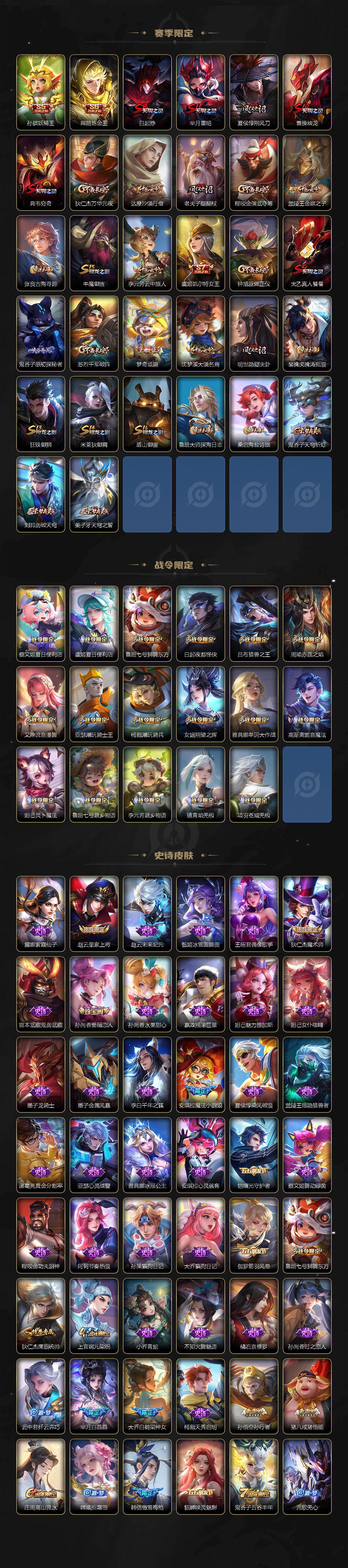 【赛季限定】:孙膑妖精王,扁鹊炼金王,白起狰,芈月重明,夏侯惇朔风刀,曹操烛龙,典韦穷奇,狄仁杰万华元夜,达摩沙漠行僧,老夫子醍醐杖,程咬金演武夺筹,兰陵王金庭之子,张良古海寻踪,牛魔御旌,李元芳云中旅人,虞姬凯尔特女王,钟馗驱傩正仪,太乙真人饕餮,鬼谷子原初探秘者,苏烈千军破阵,弈星混沌棋,梦奇顽趣,沈梦溪大漠名商,明世隐疑决卦,裴擒虎擒涛扼浪,狂铁御狮,米莱狄御霄,盾山御銮,鲁班大师探海日志,桑启海盐诗旅,鬼谷子天穹祈灯,刘邦剑破天穹,姜子牙天穹之誓