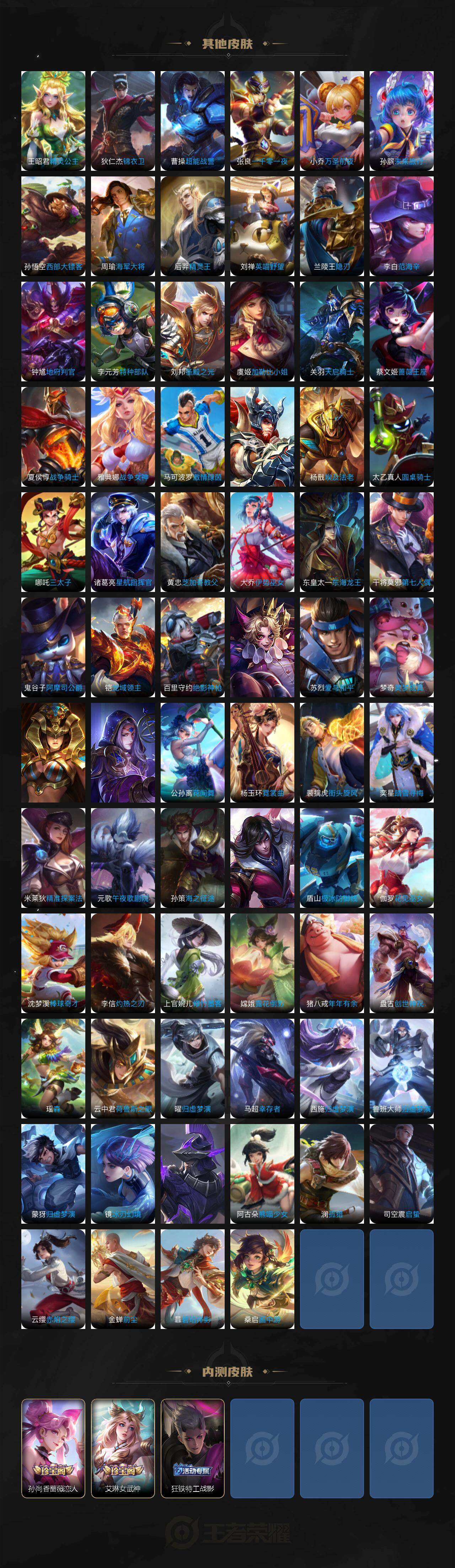【限定皮肤】:白起狰,蒙犽顽岩魄,蔡文姬夏日便利店,虞姬夏日便利店,姜子牙天穹之誓,狄仁杰阴阳师,虞姬凯尔特女王,赵云皇家上将,孙尚香蔷薇恋人,鲁班七号狮舞东方,庄周高山流水,孙膑妖精王,扁鹊炼金王,白起夜都怪侠,芈月重明,芈月白晶晶,吕布猎兽之王,周瑜赤莲之焰,元歌无心,夏侯惇朔风刀,曹操烛龙,典韦穷奇,狄仁杰魔术师,狄仁杰万华元夜,达摩沙漠行僧,项羽海滩派对,老夫子醍醐杖,安琪拉魔法小厨娘,程咬金演武夺筹,韩信傲雪梅枪,兰陵王金庭之子,亚瑟潮玩骑士王,孙悟空孙行者,牛魔御旌,李元芳云中旅人,钟馗驱傩正仪,杨戬潮玩骑兵,女娲朔望之晖,雅典娜单词大作战,太乙真人饕餮,鬼谷子原初探秘者,鬼谷子五谷丰年,大乔白鹤梁神女,苏烈千军破阵,弈星混沌棋,梦奇顽趣,沈梦溪大漠名商,明世隐疑决卦,裴擒虎擒涛扼浪,狂铁御狮,米莱狄御霄,云中君纤云弄巧,盾山御銮,猪八戒猪悟能,上官婉儿梁祝,嫦娥拒霜思,鲁班大师探海日志,桑启海盐诗旅,艾琳女武神,艾琳流音漫舞,张良古海寻踪,蒙犽百解令,高渐离燃音魔法,妲己灵卜魔法,鬼谷子天穹祈灯,伽罗琥珀纪元,姬小满妄想食味,安琪拉乘龙聚宝船,沈梦溪龙舞盛年,鲁班七号蔬乡物语,李元芳蔬乡物语,海月金乌负日,刘邦剑破天穹,程咬金群星魔术团,镜青焰无极,项羽苍威无极,周瑜熔金海岸