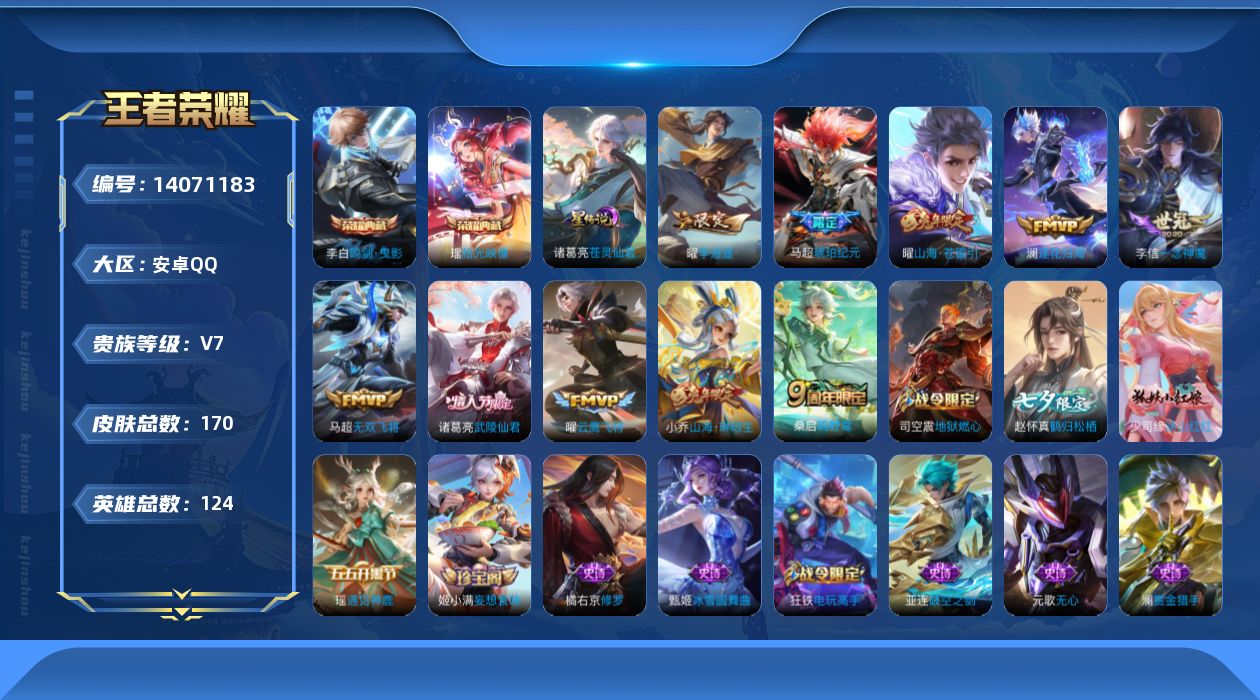 - [12031527]V10 3典藏 1无双 1珍品传说 81传说 125英雄 553皮肤 可修改实名 优质装备:无限飓风号(高达),鸣剑·曳影,弑枪猎影(韩信典藏),青丘·九尾(妲己无双),大耳狗之梦,黄金狮子座,黄金射手座,冠军飞将,云鹰飞将(小将军),绛天战甲(鸡嘴战神),黄金白羊座,猫影幻舞,久胜战神,炽阳神光,一念神魔,云霓雀翎,末日机甲-孙尚香(绿蚂蚱),音你心动-小乔,零号·赤焰,地狱之眼,飞鸢探春,音你心动-周瑜,胖达荣荣,李逍遥,乞巧织情,时之恋人-刘备(电焊工),游龙清影(小青龙),淬星耀世,超时空战士-狄仁杰,遇见胡旋,花朝如约(花篮子),挚爱之约,挚爱花嫁,无双飞将,音你闪耀(rap皮),碎云,天秀幻梦,神器·狴犴令,山海·炽霜斩(李信年限),山海·琳琅生(小乔年限),山海·苍雷引(电光曜子),炽翼辉光(娃娃菜牛角包),燃星之曲,画中仙,浮生妄,记忆之芯(机甲兔),青丘·九尾,百相守梦(张飞),追逃游戏(亚瑟),追逃游戏(安琪拉),电玩·雷克斯,鹤羽星尊,灼幽烈阳,妄想实况,遇见神鼓,艾琳觅芳踪,涂山容容 传说皮:幻光神枪 珍宝阁皮:优雅恋人,女武神,玩趣恶龙 限定皮:愿照·九州拓(澜年限),愿照·山河定(司空震年限),鸣野蒿,至尊宝,白虎志(电光耗子),凤求凰(白切鸡),凤凰于飞,太华(伽罗年限),梅西,武陵仙君(小桃花),异界灵契(白毛香),傲雪梅枪,补天,寅虎·展翼(孙膑年限),前尘镜,星穹之声,绯月行,时之彼端,白鹤梁神女,白晶晶,时雨天司(水龙头),神威(电光马子),飞衡(韩信年限),玄嵩(庄周年限),山海·碧波行(瑶年限),无限倾心-项羽,瑞麟志(木兰年限),遇见飞天,高山流水,诗剑行,无限倾心-虞姬,齐天大圣,匿光决锋者,怒海麟威,降魔,五谷丰年,青龙志(铠年限),冰锋战神,幽恒(沐浴露),武圣,天狼运算者,游园惊梦,梁祝,御风骁将(吕布年限),天狼狩猎者,龙胆,逐梦之翼,逐梦之星,烈魂,岱宗(典韦年限),天狼溯光者,虎魄,逐梦之音,天狼征服者,奔雷神使(牛魔年限),祈雪灵祝(雪兔子),天狼绘梦者,李小龙,逐梦之影,逐梦之光,玄武志(苏烈年限),朱雀志(守约年限),永曜之星,辉光之辰,如梦令-嫦娥,如梦令-后羿,霸王别姬-项羽,霸王别姬-虞姬,圣诞老人,奇迹圣诞,默契交锋-兰陵王,默契交锋-花木兰,真爱至上,纯白花嫁,孙行者,猪悟能,一生所爱,