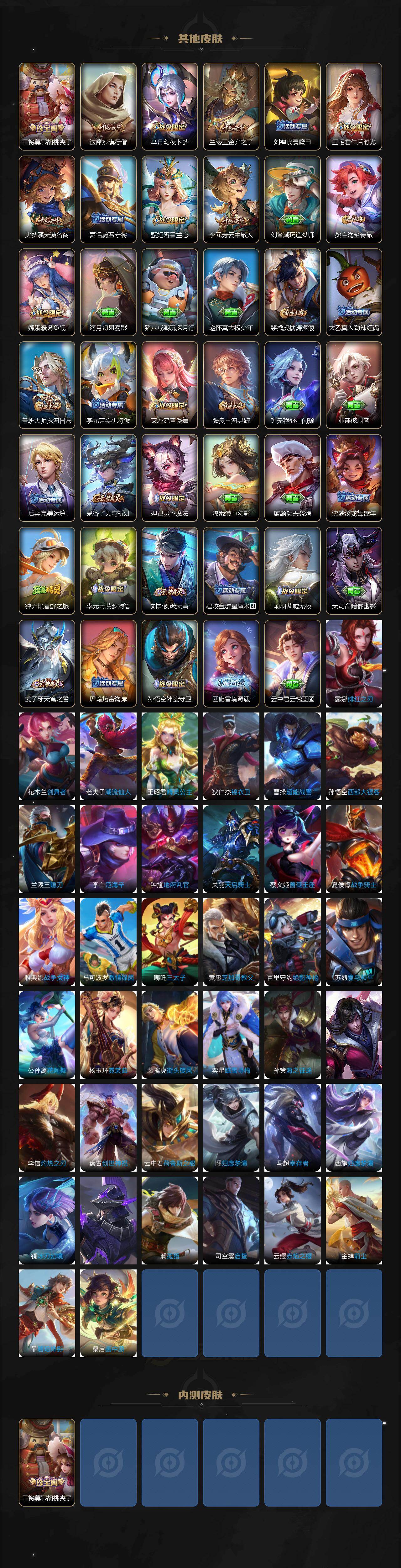 【赛季限定】:达摩沙漠行僧,兰陵王金庭之子,张良古海寻踪,李元芳云中旅人,钟馗驱傩正仪,苏烈千军破阵,百里玄策原初追逐者,梦奇顽趣,沈梦溪大漠名商,裴擒虎擒涛扼浪,鲁班大师探海日志,桑启海盐诗旅,鬼谷子天穹祈灯,蒙恬荣光圣徽,刘邦剑破天穹,姜子牙天穹之誓