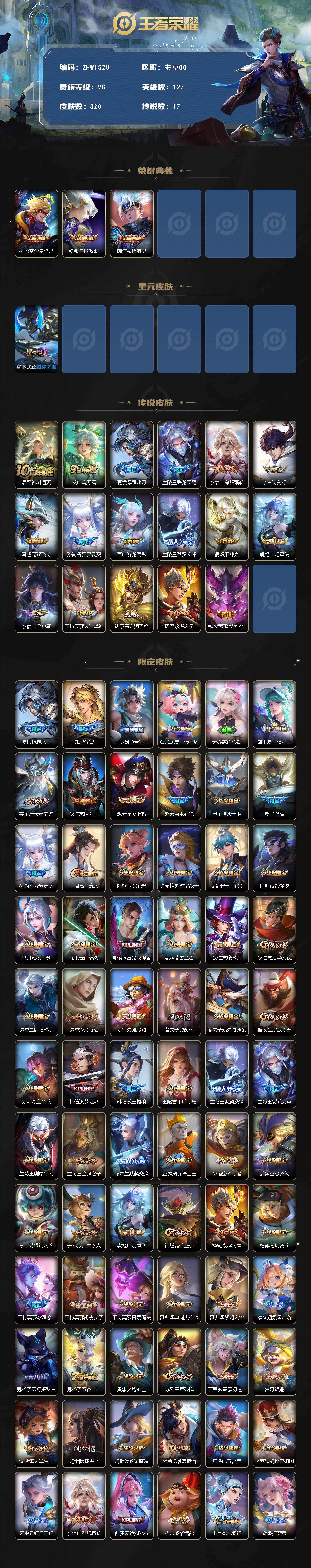 [14071396]可二次【店主推荐捡漏号!可直接换绑1.2w元歌,万战韩信】安卓Q-V8-最强王者段位-127英雄-320皮肤-3典藏-17传说-89史诗 【英雄全皮】:刘邦全皮,李信全皮,蒙恬全皮,戈娅全皮 【荣耀典藏】:孙悟空全息碎影,铠银白咏叹调,韩信弑枪猎影 【传说皮肤】:后羿神树通天,桑启鸣野蒿,夏侯惇霜北刀,兰陵王影龙天霄,李信山海炽霜斩,李白诗剑行,马超无双飞将,孙尚香异界灵契,西施游龙清影,兰陵王默契交锋,镜炽阳神光,虞姬启明星使,李信一念神魔,干将莫邪久胜战神,达摩黄金狮子座,杨戬永曜之星,宫本武藏地狱之眼 【限定皮肤】:夏侯惇霜北刀,暃埋骨钱,蒙犽顽岩魄,蔡文姬夏日便利店,大乔绒语心约,虞姬夏日便利店,姜子牙天穹之誓,狄仁杰阴阳师,赵云皇家上将,赵云百木心枪,墨子神迹守卫,墨子降魔,孙尚香异界灵契,庄周高山流水,阿轲迷踪丽影,钟无艳超时空战士,扁鹊奇幻香踪,白起夜都怪侠,芈月幻夜卜梦,元歌云间偶戏,夏侯惇匿光决锋者,甄姬落雪兰心,狄仁杰魔术师,狄仁杰万华元夜,达摩星际陆战队,达摩沙漠行僧,项羽海滩派对,老夫子醍醐杖,老夫子航海奇遇记,程咬金演武夺筹,刘邦夺宝奇兵,韩信逐梦之影,韩信傲雪梅枪,王昭君午后时光,兰陵王默契交锋,兰陵王影龙天霄,兰陵王驯魔猎人,兰陵王金庭之子,花木兰默契交锋,亚瑟潮玩骑士王,孙悟空孙行者,后羿圣弓游侠,李元芳银河之约,李元芳云中旅人,虞姬启明星使,钟馗驱傩正仪,杨戬永曜之星,杨戬潮玩骑兵,干将莫邪冰霜恋舞曲,干将莫邪胡桃夹子,干将莫邪真爱魔法,雅典娜单词大作战,雅典娜黎明之约,蔡文姬繁星吟游,鬼谷子原初探秘者,鬼谷子五谷丰年,黄忠火炮绅士,苏烈千军破阵,百里玄策原初追逐者,梦奇顽趣,沈梦溪大漠名商,明世隐疑决卦,明世隐吟游魔法,裴擒虎擒涛扼浪,狂铁电玩高手,米莱狄胡桃异想国,云中君纤云弄巧,李信山海炽霜斩,伽罗天狼溯光者,猪八戒猪悟能,上官婉儿梁祝,嫦娥拒霜思,嫦娥暖冬兔眠,西施玲珑珍味,鲁班大师探海日志,桑启海盐诗旅,暃星界游侠,戈娅驭风魔法,艾琳流音漫舞,司空震地狱燃心,阿古朵江河有灵,张良古海寻踪,蒙犽百解令,蒙恬荣光圣徽,鬼谷子天穹祈灯,姬小满妄想食味,沈梦溪龙舞盛年,刘邦剑破天穹,程咬金群星魔术团,周瑜熔金海岸 【年限皮肤】:杨戬永曜之星,李信山海炽霜斩 【赛季限定】:狄仁杰万华元夜,达摩沙漠行僧,老夫子醍醐杖,程咬金演武夺筹