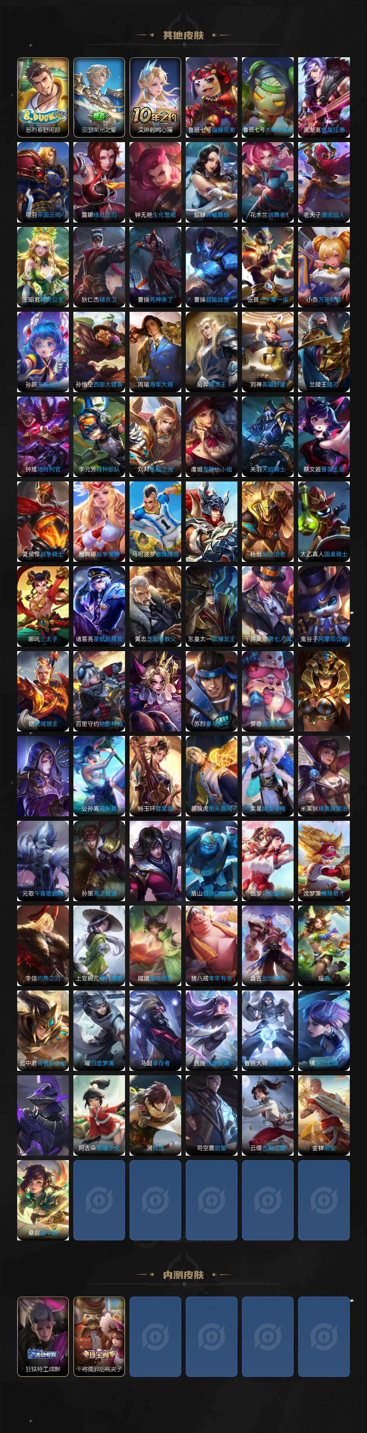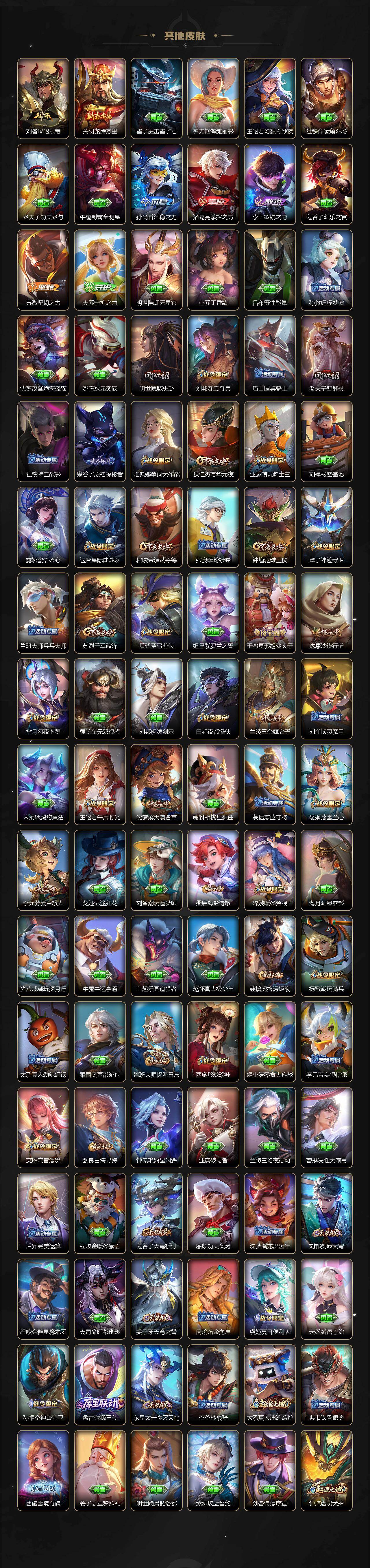 【限定皮肤】:夏侯惇霜北刀,暃埋骨钱,蒙犽顽岩魄,蔡文姬夏日便利店,大乔绒语心约,虞姬夏日便利店,姜子牙天穹之誓,狄仁杰阴阳师,赵云皇家上将,赵云百木心枪,墨子神迹守卫,墨子降魔,孙尚香异界灵契,庄周高山流水,阿轲迷踪丽影,钟无艳超时空战士,扁鹊奇幻香踪,白起夜都怪侠,芈月幻夜卜梦,元歌云间偶戏,夏侯惇匿光决锋者,甄姬落雪兰心,狄仁杰魔术师,狄仁杰万华元夜,达摩星际陆战队,达摩沙漠行僧,项羽海滩派对,老夫子醍醐杖,老夫子航海奇遇记,程咬金演武夺筹,刘邦夺宝奇兵,韩信逐梦之影,韩信傲雪梅枪,王昭君午后时光,兰陵王默契交锋,兰陵王影龙天霄,兰陵王驯魔猎人,兰陵王金庭之子,花木兰默契交锋,亚瑟潮玩骑士王,孙悟空孙行者,后羿圣弓游侠,李元芳银河之约,李元芳云中旅人,虞姬启明星使,钟馗驱傩正仪,杨戬永曜之星,杨戬潮玩骑兵,干将莫邪冰霜恋舞曲,干将莫邪胡桃夹子,干将莫邪真爱魔法,雅典娜单词大作战,雅典娜黎明之约,蔡文姬繁星吟游,鬼谷子原初探秘者,鬼谷子五谷丰年,黄忠火炮绅士,苏烈千军破阵,百里玄策原初追逐者,梦奇顽趣,沈梦溪大漠名商,明世隐疑决卦,明世隐吟游魔法,裴擒虎擒涛扼浪,狂铁电玩高手,米莱狄胡桃异想国,云中君纤云弄巧,李信山海炽霜斩,伽罗天狼溯光者,猪八戒猪悟能,上官婉儿梁祝,嫦娥拒霜思,嫦娥暖冬兔眠,西施玲珑珍味,鲁班大师探海日志,桑启海盐诗旅,暃星界游侠,戈娅驭风魔法,艾琳流音漫舞,司空震地狱燃心,阿古朵江河有灵,张良古海寻踪,蒙犽百解令,蒙恬荣光圣徽,鬼谷子天穹祈灯,姬小满妄想食味,沈梦溪龙舞盛年,刘邦剑破天穹,程咬金群星魔术团,周瑜熔金海岸