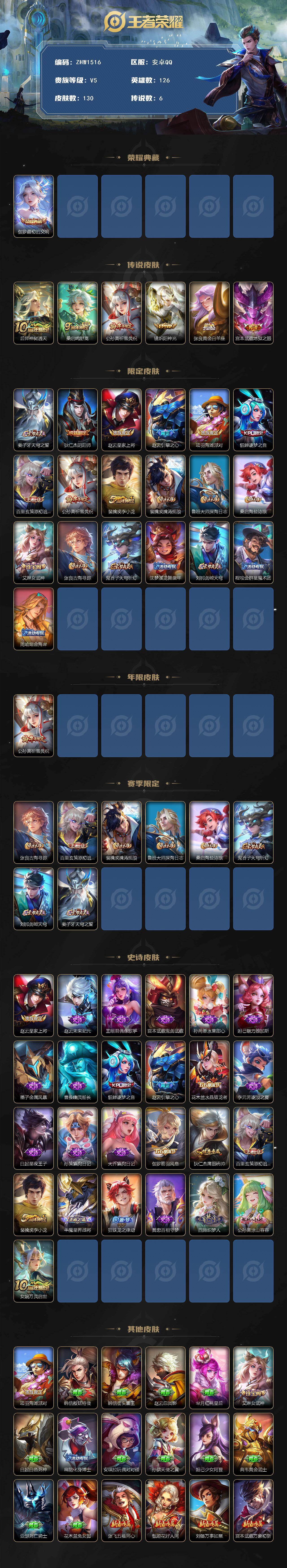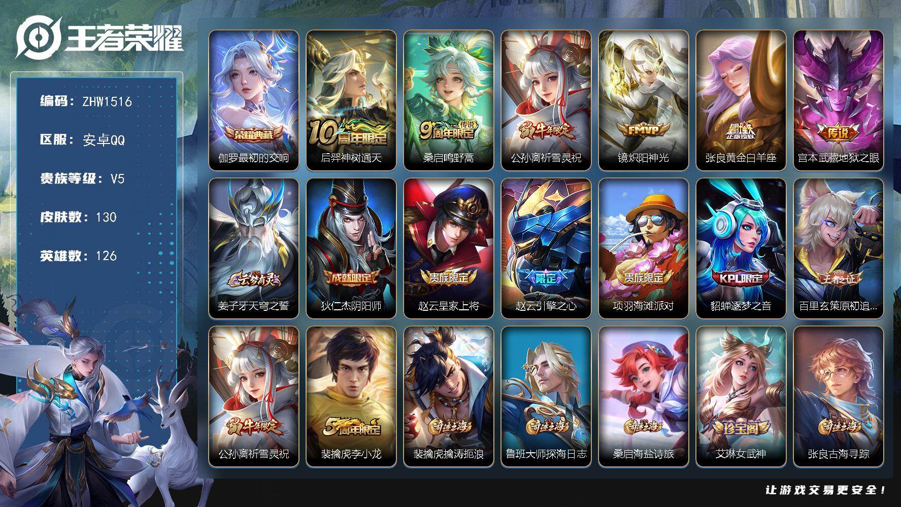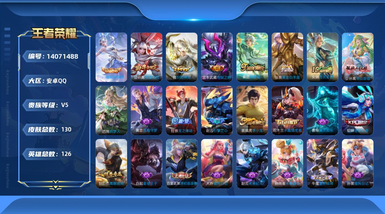 [14071488]【店主推荐捡漏号!可直接换绑】安卓Q-V5-最强王者段位-126英雄-130皮肤-1典藏-6传说-25史诗 【英雄全皮】:影全皮 【荣耀典藏】:伽罗最初的交响 【传说皮肤】:后羿神树通天,桑启鸣野蒿,公孙离祈雪灵祝,镜炽阳神光,张良黄金白羊座,宫本武藏地狱之眼 【限定皮肤】:姜子牙天穹之誓,狄仁杰阴阳师,赵云皇家上将,赵云引擎之心,项羽海滩派对,貂蝉逐梦之音,百里玄策原初追逐者,公孙离祈雪灵祝,裴擒虎李小龙,裴擒虎擒涛扼浪,鲁班大师探海日志,桑启海盐诗旅,艾琳女武神,张良古海寻踪,鬼谷子天穹祈灯,沈梦溪龙舞盛年,刘邦剑破天穹,程咬金群星魔术团,周瑜熔金海岸 【年限皮肤】:公孙离祈雪灵祝 【赛季限定】:张良古海寻踪,百里玄策原初追逐者,裴擒虎擒涛扼浪,鲁班大师探海日志,桑启海盐诗旅,鬼谷子天穹祈灯,刘邦剑破天穹,姜子牙天穹之誓 【史诗皮肤】:赵云皇家上将,赵云未来纪元,王昭君偶像歌手,宫本武藏鬼剑武藏,孙尚香水果甜心,妲己魅力维加斯,墨子金属风暴,曹操幽灵船长,貂蝉逐梦之音,赵云引擎之心,花木兰水晶猎龙者,李元芳逐浪之夏,白起星夜王子,孙策猫狗日记,大乔猫狗日记,伽罗箭羽风息,狄仁杰鹰眼统帅,百里玄策原初追逐者,裴擒虎李小龙,牛魔星界战将,狂铁龙之律动,黄忠百相守梦,西施织梦人,公孙离涂山容容,女娲万灵启世 【其他皮肤】:项羽海滩派对,韩信教廷特使,韩信街头霸王,赵云忍炎影,芈月红桃皇后,艾琳女武神,白起白色死神,扁鹊化身博士,安琪拉玩偶对对碰,孙膑天使之翼,妲己少女阿狸,典韦黄金武士,亚瑟死亡骑士,花木兰兔女郎,张飞五福同心,甄姬花好人间,刘备万事如意,宫本武藏万象初新,后羿阿尔法小队,狄仁杰阴阳师,关羽龙腾万里,王昭君幻想奇妙夜,老夫子功夫老勺,诸葛亮掌控之力,李白敏锐之力,苏烈坚韧之力,哪吒次元突破,狂铁特工战影,鲁班大师乓乓大师,刘禅唤灵魔甲,戈娅危途狂花,桑启海盐诗旅,白起乐园追猎者,裴擒虎擒涛扼浪,太乙真人劲辣红锅,莱西奥西部游侠,鲁班大师探海日志,李元芳妄想特派,张良古海寻踪,钟无艳聚星闪耀,亚连破局者,后羿完美运算,鬼谷子天穹祈灯,廉颇功夫炙烤,沈梦溪龙舞盛年,钟无艳春野之旅,刘邦剑破天穹,程咬金群星魔术团,大司命暗都幽影,姜子牙天穹之誓,周瑜熔金海岸,盘古敬我三分,东皇太一噬灭天穹,干将莫邪雾都夜雨,苍苍林狼骑,太乙真人谧流熔炉,典韦铁骨偃魂,影魅