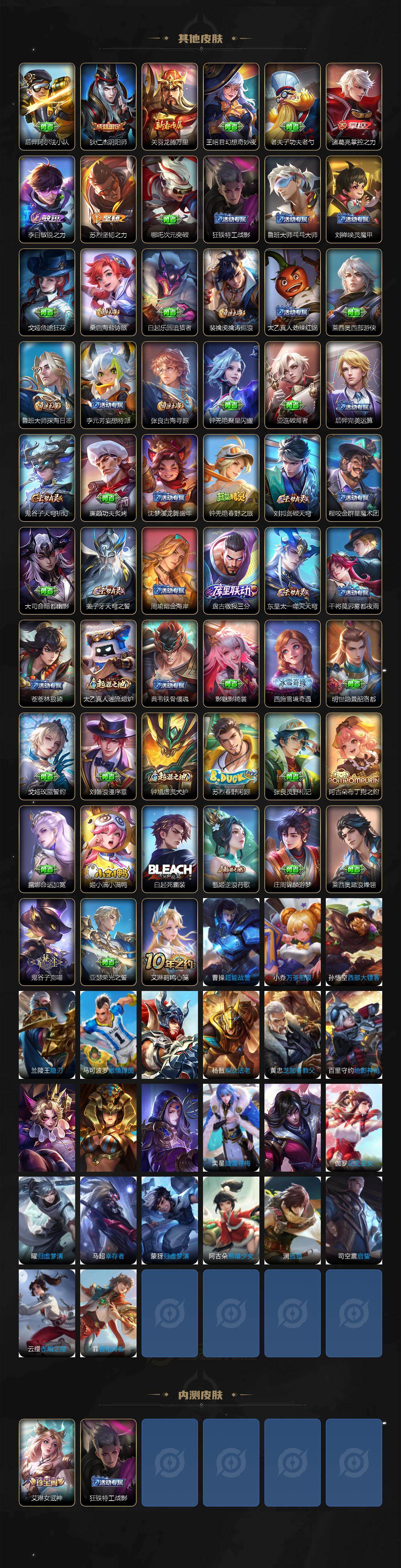 【其他皮肤】:项羽海滩派对,韩信教廷特使,韩信街头霸王,赵云忍炎影,芈月红桃皇后,艾琳女武神,白起白色死神,扁鹊化身博士,安琪拉玩偶对对碰,孙膑天使之翼,妲己少女阿狸,典韦黄金武士,亚瑟死亡骑士,花木兰兔女郎,张飞五福同心,甄姬花好人间,刘备万事如意,宫本武藏万象初新,后羿阿尔法小队,狄仁杰阴阳师,关羽龙腾万里,王昭君幻想奇妙夜,老夫子功夫老勺,诸葛亮掌控之力,李白敏锐之力,苏烈坚韧之力,哪吒次元突破,狂铁特工战影,鲁班大师乓乓大师,刘禅唤灵魔甲,戈娅危途狂花,桑启海盐诗旅,白起乐园追猎者,裴擒虎擒涛扼浪,太乙真人劲辣红锅,莱西奥西部游侠,鲁班大师探海日志,李元芳妄想特派,张良古海寻踪,钟无艳聚星闪耀,亚连破局者,后羿完美运算,鬼谷子天穹祈灯,廉颇功夫炙烤,沈梦溪龙舞盛年,钟无艳春野之旅,刘邦剑破天穹,程咬金群星魔术团,大司命暗都幽影,姜子牙天穹之誓,周瑜熔金海岸,盘古敬我三分,东皇太一噬灭天穹,干将莫邪雾都夜雨,苍苍林狼骑,太乙真人谧流熔炉,典韦铁骨偃魂,影魅