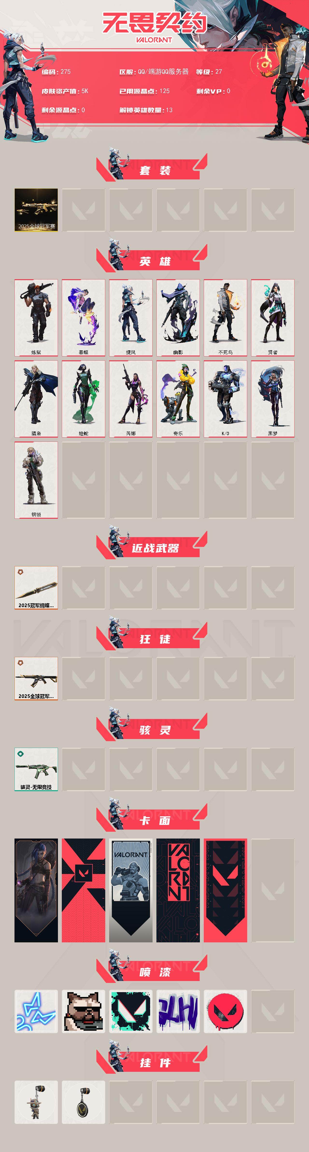 [14071928]【套装】:2025全球冠军赛套装 【英雄】:炼狱,暮蝶,捷风,幽影,不死鸟,贤者,猎枭,蝰蛇,芮娜,奇乐,K/O,黑梦,钢锁 【近战 武器】:近战武器-2025全球冠军赛 蝴蝶刀 【狂徒】:狂徒-2025全球冠军赛 【骇灵】:骇灵-无限竞技 【卡面】:《双城之战》金克丝 卡面,代号红色 卡面,新兵报到 卡面,V契约 卡面,无畏契约 卡面 【喷漆】:霓光四射 喷漆,关门放狗 喷漆,胜利属于无畏契约 喷漆,GLHF 喷漆,无畏契约 喷漆 【挂饰】:无畏契约GO!第一卷 零 挂饰,无畏契约 纪念币 挂饰