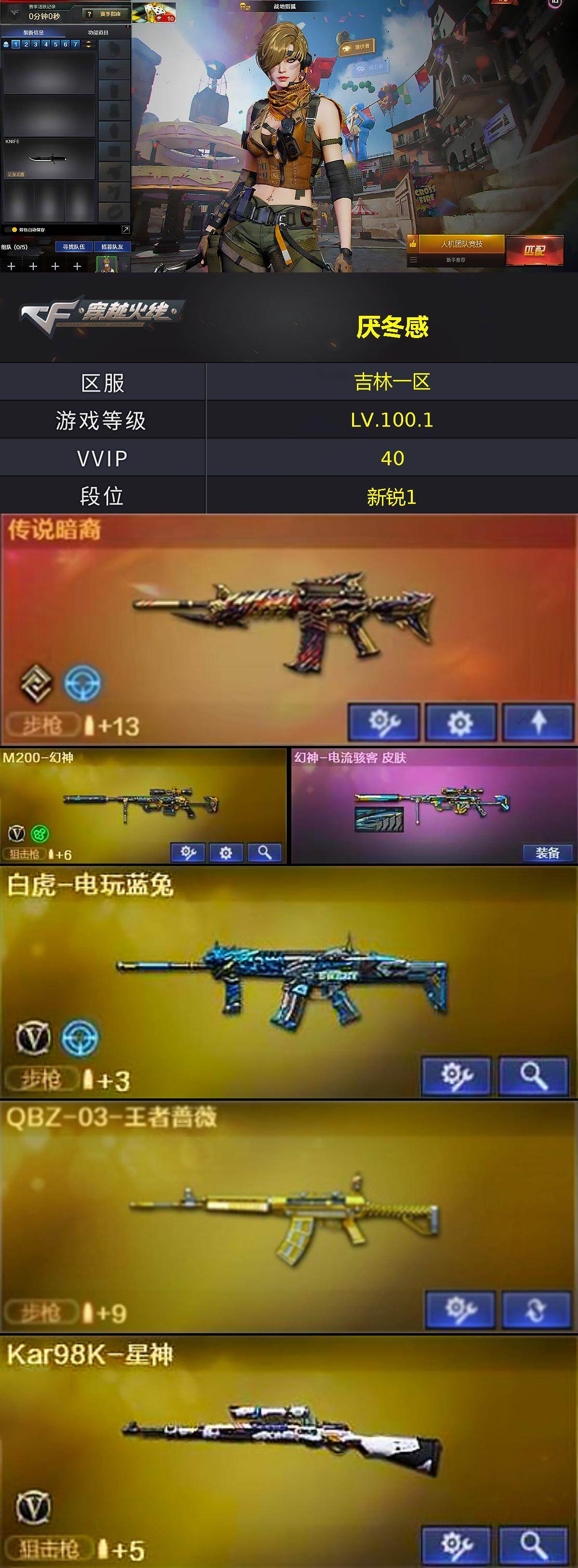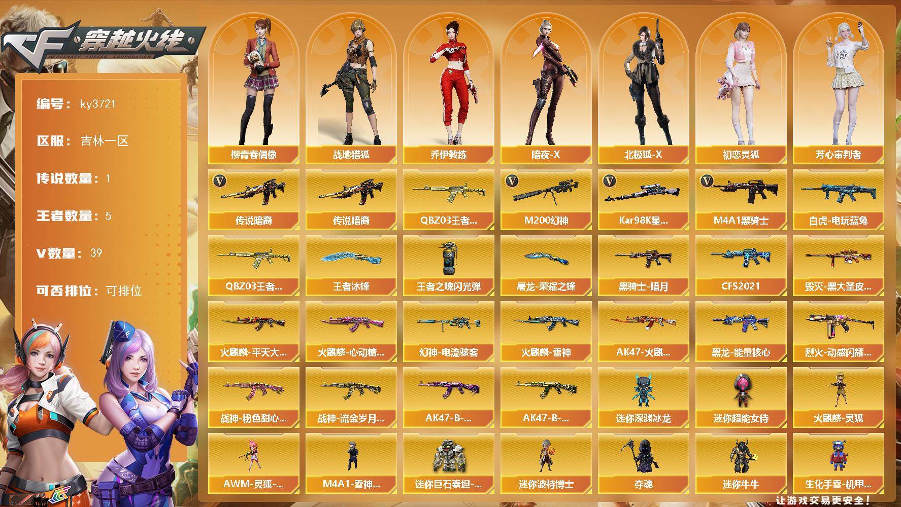 [14073890]吉林一区-39V-5王者-0炫金 【传说武器】:传说暗裔 【热门武器】:传说暗裔,M200-幻神,QBZ-03-王者蔷薇,白虎-电玩蓝兔,Kar98K-星神,M4A1-黑骑士 【王者炫金武器】:QBZ-03-王者蔷薇,王者冰锋,王者之魄闪光弹*2 【皮肤】:幻神-电流骇客 皮肤,火麒麟-雷神*2,火麒麟-平天大圣,火麒麟-心动糖果,AK47-火麒麟-百城23冠军皮肤,毁灭-黑大圣皮肤,黑龙-能量核心*2,黑骑士-暗月,黑骑士-CFS2021,烈火-动感闪耀 皮肤,战神-粉色甜心皮肤,战神-流金岁月皮肤,AK47-B-常胜将军-曹操,AK47-B-常胜将军-孙权*2,屠龙-荣耀之锋 【角色】:战地猎狐,乔伊教练,暗夜-X,北极狐-X,初恋灵狐,芳心审判者,风暴女,虎妞,嘉年华灵狐,荆棘玫瑰,灵狐者-X,灵狐者-七夕宝贝,龙儿,麻雀,曼陀罗-X,曼陀罗-礼服,潘多拉-X,潘多拉-甜心教官,潜龙队-X,斯沃特-X,兔囡囡,新娜塔莎,樱-青春偶像,影武者-X 【人偶武器】:火麒麟-灵狐,M4A1-雷神-精英刀锋,迷你宝贝,AWM-灵狐-15周年嘉年华,迷你深渊冰龙,迷你波特博士,夺魂,迷你牛牛,生化手雷-机甲核心,迷你超能女侍,迷你巨石泰坦-魔花研究所 【暴走生化】:超级对讲机 【挑战大师】:冰龙粉碎者-白马银枪*2,激光毁灭者III-白马银枪,激光毁灭者III*2,KAC-圣炎切割者III,神圣爆裂者-末日III*2 【英雄级武器】:AK47-火麒麟*2,M4A1-黑龙,M4A1-黑骑士,AK47-黑武士*2,AK47-机械迷城,无影-神兵利器,烈火-动感闪耀,AK-47-猩红传说*2,AK47-B-战神,白虎-电玩蓝兔,M200-幻神,Kar98K-星神,Barrett-金色蔷薇,AA-12-雷霆,沙鹰-天神,天神-动感闪耀,屠龙,麒麟刺,擎天-竞技荣光,屠龙-动感闪耀,屠龙-云海游龙,王者之锋-觉醒版,丛林匕首-玄豹,高爆手雷-幻灵,高爆手雷-竞技荣光*2,手雷-动感闪耀,高爆手雷-玄豹,闪光弹-竞技荣光,闪光弹-玄豹*2,烟雾弹-竞技荣光,烟雾弹-玄豹,M4A1-赤狱骑士 【道具】:亚洲杯纪念炫彩背包,全能枪王背包,虎牙炫彩背包,超级背包,黄金超能特工背包,女皇终结者-魔龙之吻,绿色巨人,灵魂忍者,迷雾幽灵,生化弹匣,夺命之镰*2,防化服*3,金色流光-枪王排位*