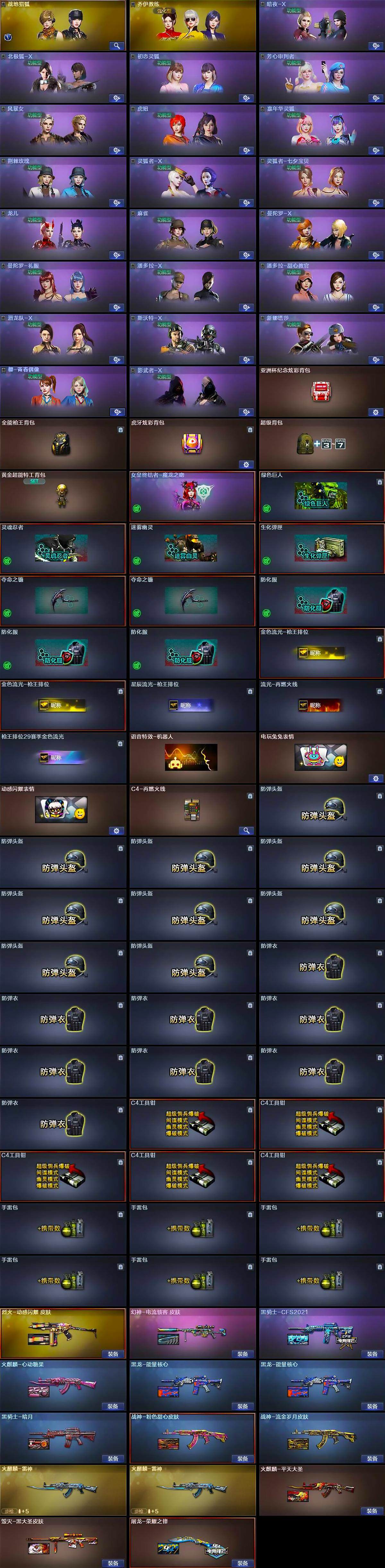 【皮肤】:幻神-电流骇客 皮肤,火麒麟-雷神*2,火麒麟-平天大圣,火麒麟-心动糖果,AK47-火麒麟-百城23冠军皮肤,毁灭-黑大圣皮肤,黑龙-能量核心*2,黑骑士-暗月,黑骑士-CFS2021,烈火-动感闪耀 皮肤,战神-粉色甜心皮肤,战神-流金岁月皮肤,AK47-B-常胜将军-曹操,AK47-B-常胜将军-孙权*2,屠龙-荣耀之锋