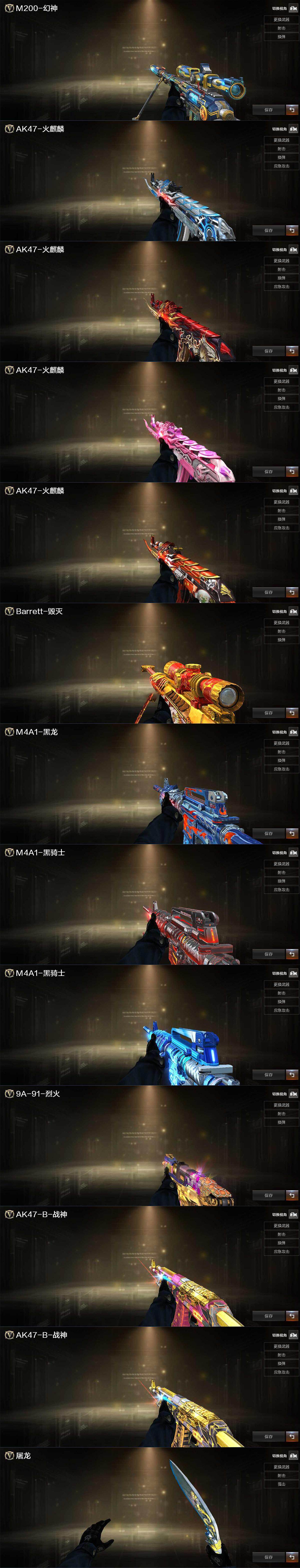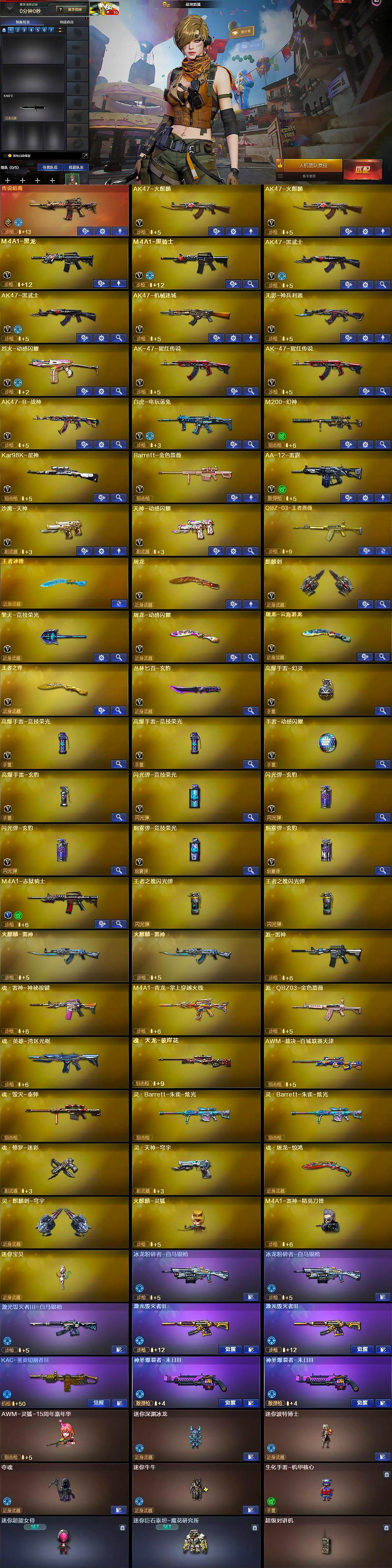 【英雄级武器】:AK47-火麒麟*2,M4A1-黑龙,M4A1-黑骑士,AK47-黑武士*2,AK47-机械迷城,无影-神兵利器,烈火-动感闪耀,AK-47-猩红传说*2,AK47-B-战神,白虎-电玩蓝兔,M200-幻神,Kar98K-星神,Barrett-金色蔷薇,AA-12-雷霆,沙鹰-天神,天神-动感闪耀,屠龙,麒麟刺,擎天-竞技荣光,屠龙-动感闪耀,屠龙-云海游龙,王者之锋-觉醒版,丛林匕首-玄豹,高爆手雷-幻灵,高爆手雷-竞技荣光*2,手雷-动感闪耀,高爆手雷-玄豹,闪光弹-竞技荣光,闪光弹-玄豹*2,烟雾弹-竞技荣光,烟雾弹-玄豹,M4A1-赤狱骑士