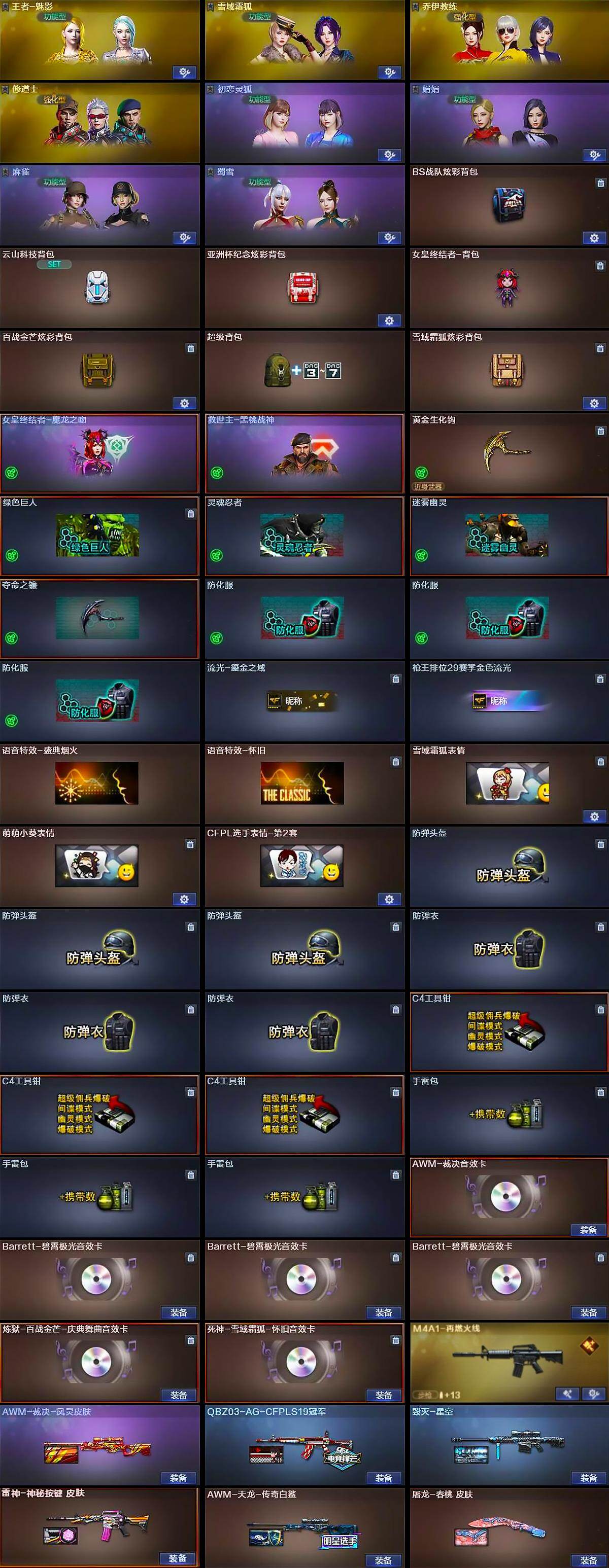 【道具】:BS战队炫彩背包,云山科技背包,亚洲杯纪念炫彩背包,女皇终结者-背包,百战金芒炫彩背包,超级背包,雪域霜狐炫彩背包,女皇终结者-魔龙之吻,救世主-黑桃战神,黄金生化钩,绿色巨人,灵魂忍者,迷雾幽灵,夺命之镰,防化服*3,流光-鎏金之域,枪王排位29赛季金色流光,语音特效-盛典烟火,语音特效-怀旧,雪域霜狐表情,萌萌小葵表情,CFPL选手表情-第2套,防弹头盔*3,防弹衣*3,C4工具钳*3,手雷包*3