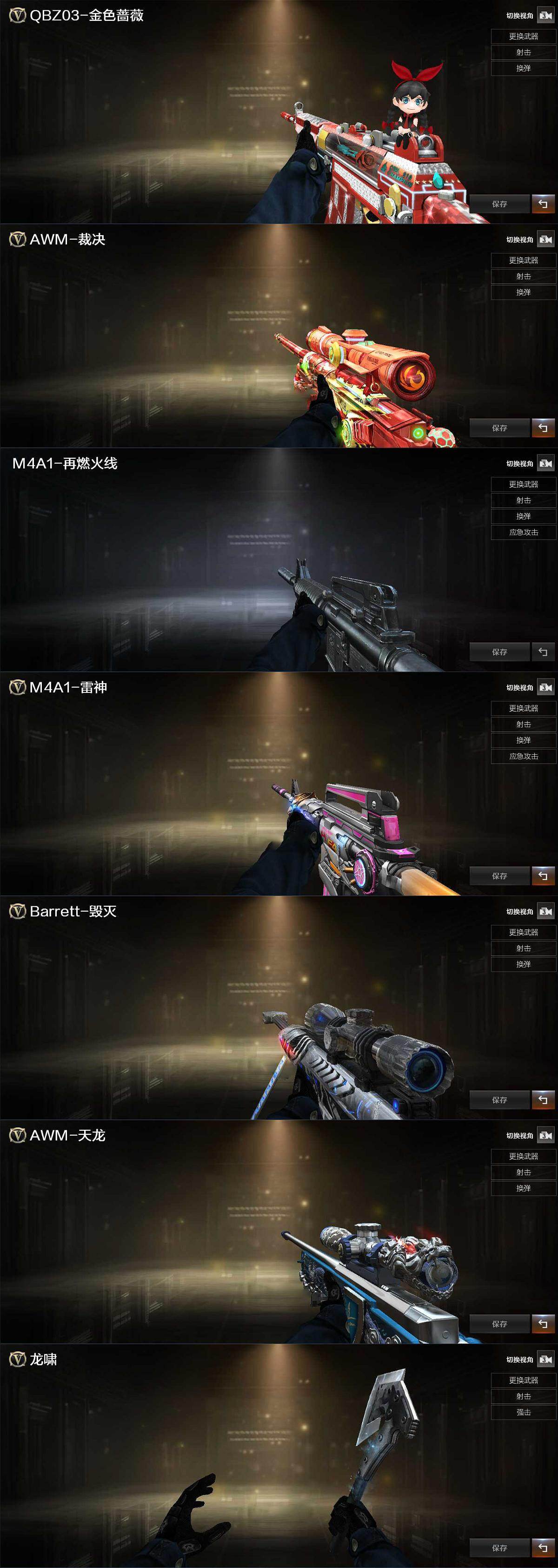 【皮肤】:QBZ03-AG-CFPLS19冠军,AWM-裁决-凤灵皮肤,M4A1-再燃火线,雷神-神秘按键 皮肤,毁灭-星空,AWM-天龙-传奇白鲨,屠龙-春桃 皮肤,轻型军用手斧-再燃火线
