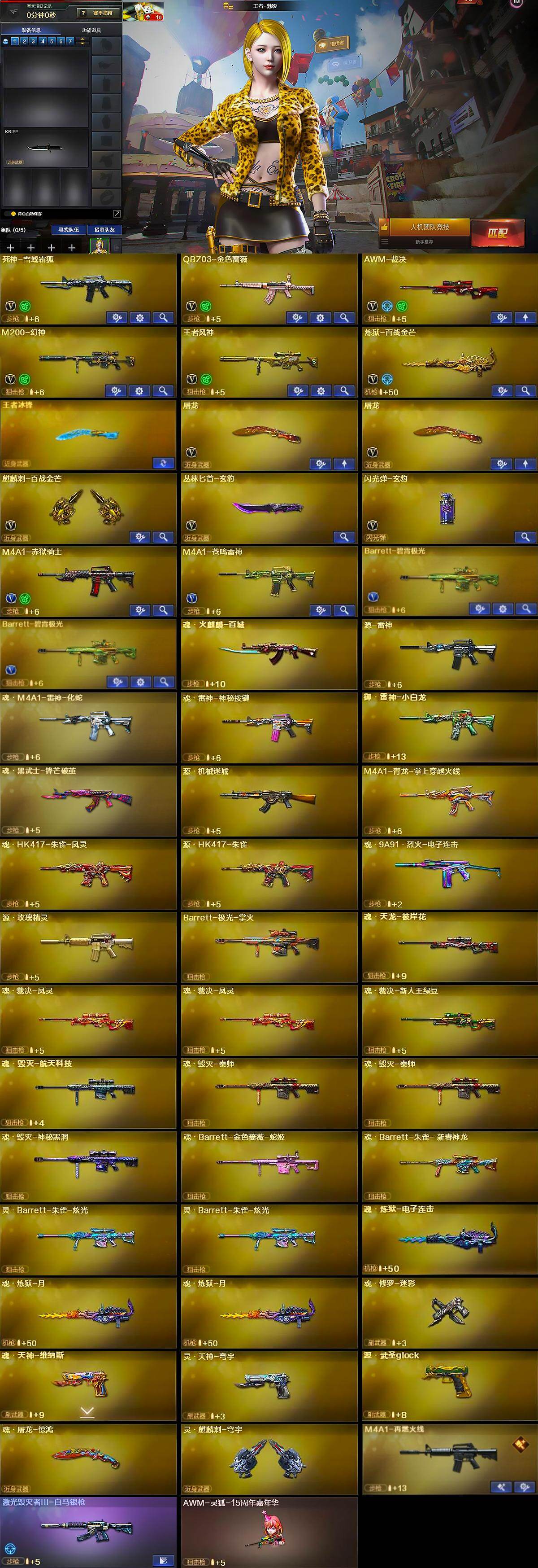 【英雄级武器】:死神-雪域霜狐,QBZ03-金色蔷薇,AWM-裁决,M200-幻神,王者风神-觉醒版,炼狱-百战金芒,屠龙*2,麒麟刺-百战金芒,丛林匕首-玄豹,闪光弹-玄豹,烟雾弹-荣耀世冠EP,M4A1-赤狱骑士,M4A1-苍鸣雷神,Barrett-碧霄极光*2