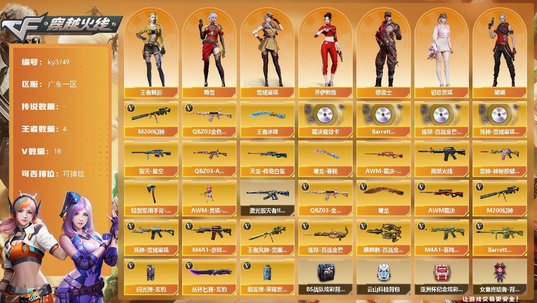 [14074080]广东一区-18V-4王者-0炫金 【热门武器】:QBZ03-金色蔷薇,M200-幻神 【王者炫金武器】:王者冰锋 【音效卡】:AWM-裁决音效卡,Barrett-碧霄极光音效卡*3,炼狱-百战金芒-庆典舞曲音效卡,死神-雪域霜狐-怀旧音效卡 【皮肤】:QBZ03-AG-CFPLS19冠军,AWM-裁决-凤灵皮肤,M4A1-再燃火线,雷神-神秘按键 皮肤,毁灭-星空,AWM-天龙-传奇白鲨,屠龙-春桃 皮肤,轻型军用手斧-再燃火线 【角色】:王者-魅影,雪域霜狐,乔伊教练,修道士,初恋灵狐,娟娟,麻雀,蜀雪 【人偶武器】:AWM-灵狐-15周年嘉年华 【挑战大师】:激光毁灭者III-白马银枪 【英雄级武器】:死神-雪域霜狐,QBZ03-金色蔷薇,AWM-裁决,M200-幻神,王者风神-觉醒版,炼狱-百战金芒,屠龙*2,麒麟刺-百战金芒,丛林匕首-玄豹,闪光弹-玄豹,烟雾弹-荣耀世冠EP,M4A1-赤狱骑士,M4A1-苍鸣雷神,Barrett-碧霄极光*2 【道具】:BS战队炫彩背包,云山科技背包,亚洲杯纪念炫彩背包,女皇终结者-背包,百战金芒炫彩背包,超级背包,雪域霜狐炫彩背包,女皇终结者-魔龙之吻,救世主-黑桃战神,黄金生化钩,绿色巨人,灵魂忍者,迷雾幽灵,夺命之镰,防化服*3,流光-鎏金之域,枪王排位29赛季金色流光,语音特效-盛典烟火,语音特效-怀旧,雪域霜狐表情,萌萌小葵表情,CFPL选手表情-第2套,防弹头盔*3,防弹衣*3,C4工具钳*3,手雷包*3 【特殊枪械】: