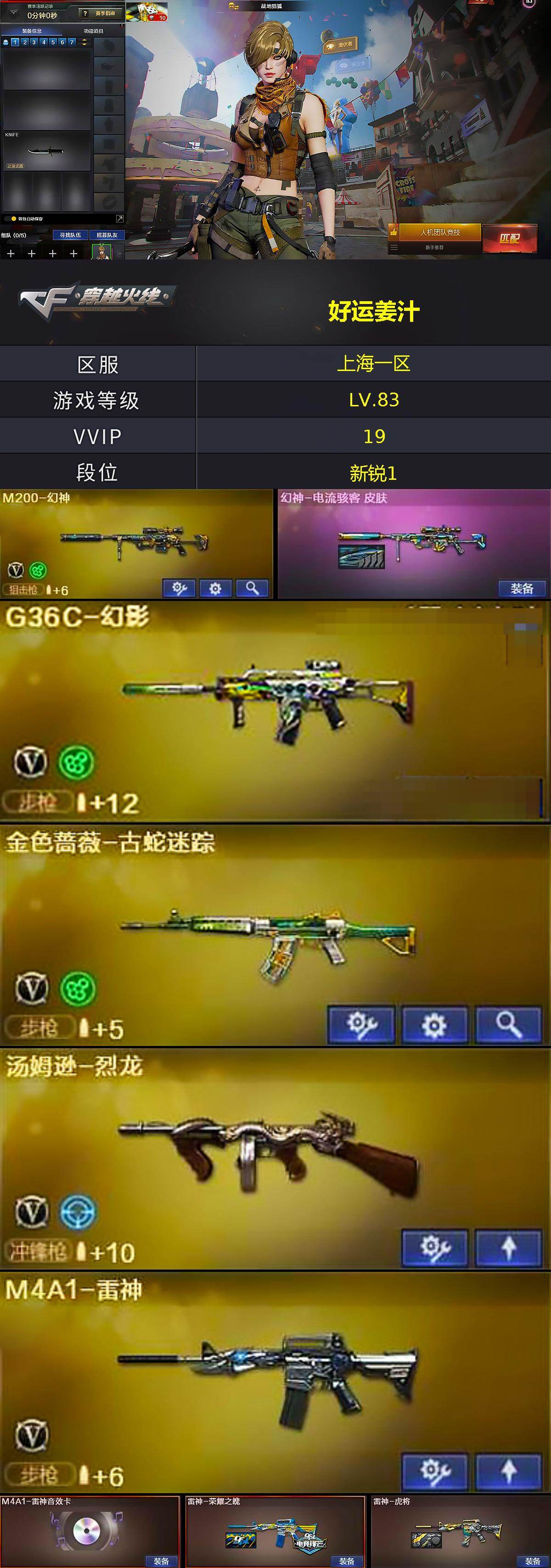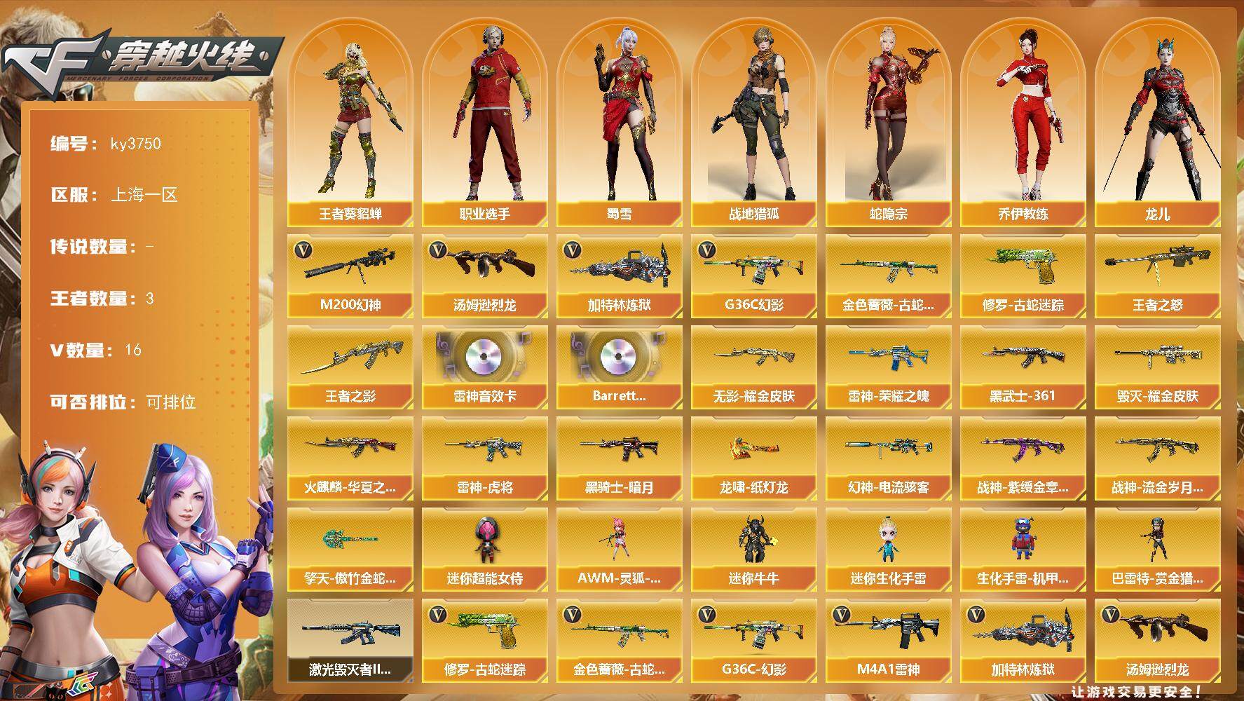 [14074123]上海一区-16V-3王者-0炫金 【热门武器】:G36C-幻影,M200-幻神,金色蔷薇-古蛇迷踪,修罗-古蛇迷踪,汤姆逊-烈龙,加特林-炼狱 【王者炫金武器】:王者之影,王者之怒 【音效卡】:M4A1-雷神音效卡,Barrett-碧霄极光音效卡 【皮肤】:幻神-电流骇客 皮肤,雷神-荣耀之魄,雷神-虎将,火麒麟-华夏之心,毁灭耀金皮肤,黑骑士-暗月,无影耀金皮肤,AK47-黑武士-361,战神-紫绶金章皮肤*2,战神-流金岁月皮肤,龙啸-纸灯龙皮肤,擎天-傲竹金蛇 皮肤 【角色】:战地猎狐,王者-葵-貂蝉,蛇隐宗,乔伊教练,龙儿,潘多拉-甜心教官,蛇姬,蜀雪,兔囡囡,职业选手 【人偶武器】:AWM-灵狐-15周年嘉年华,迷你牛牛,迷你生化手雷,生化手雷-机甲核心,巴雷特-赏金猎人,迷你超能女侍 【挑战大师】:激光毁灭者III-白马银枪 【英雄级武器】:AK47-火麒麟,M4A1-雷神,G36C-幻影,金色蔷薇-古蛇迷踪,AK-47-猩红传说*4,M200-幻神,加特林-炼狱,汤姆逊-烈龙,沙鹰-天神,修罗-古蛇迷踪,擎天,高爆手雷-古蛇迷踪,烟雾弹-古蛇迷踪,M4A1-赤狱骑士 【道具】:BS战队炫彩背包,古蛇迷踪炫彩背包,女皇终结者-背包,背包-洛丽塔,超级背包,黑桃战神背包,女皇终结者-魔龙之吻,救世主-黑桃战神,黄金生化钩,绿色巨人,灵魂忍者,迷雾幽灵,夺命之镰,防化服*3,枪王排位29赛季金色流光,古蛇迷踪打击特效,蛇隐宗表情,电玩兔兔表情,动感闪耀表情,C4-再燃火线,防弹头盔*3,防弹衣*3,C4工具钳*3,手雷包*3 【特殊枪械】:1烈龙,1炼狱
