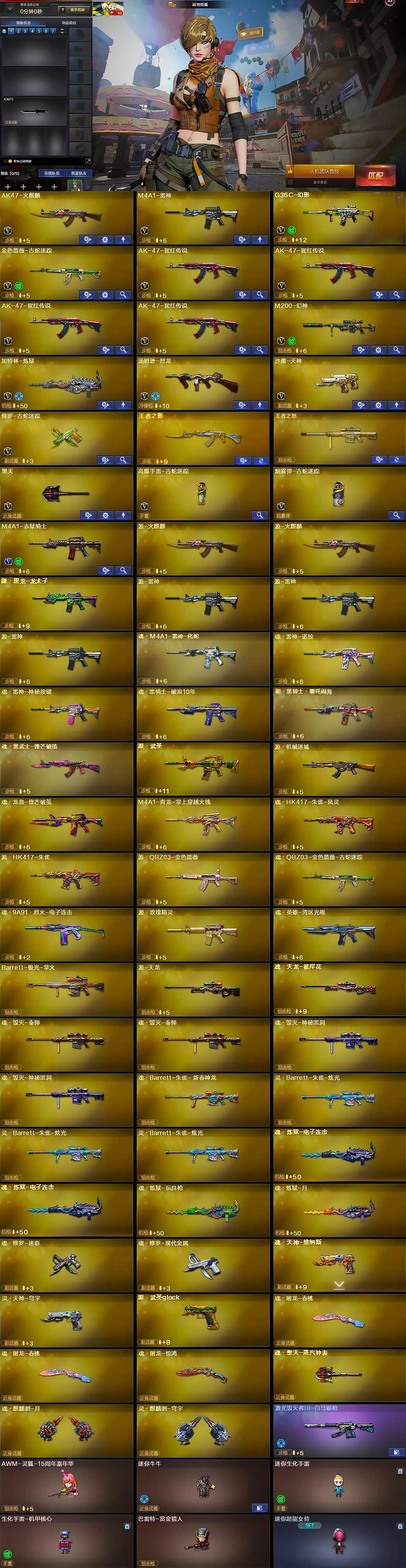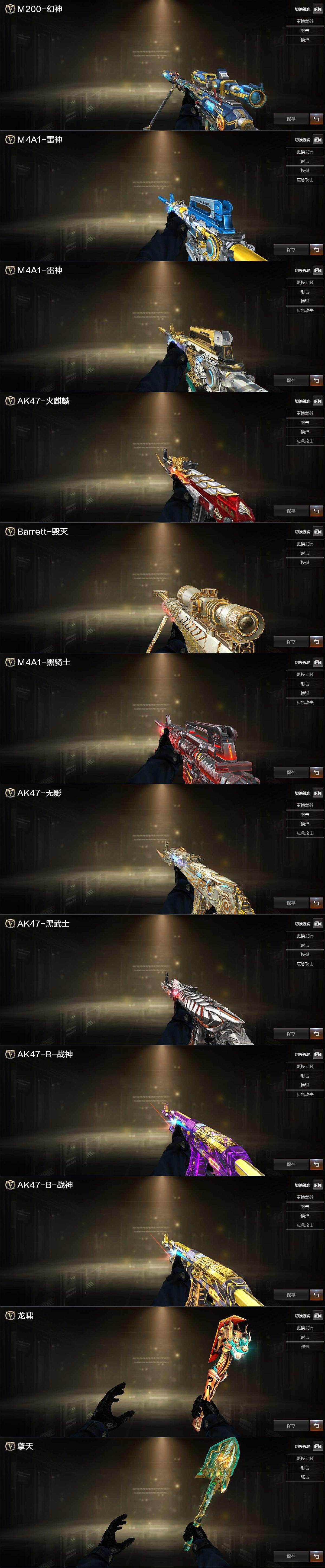 【英雄级武器】:AK47-火麒麟,M4A1-雷神,G36C-幻影,金色蔷薇-古蛇迷踪,AK-47-猩红传说*4,M200-幻神,加特林-炼狱,汤姆逊-烈龙,沙鹰-天神,修罗-古蛇迷踪,擎天,高爆手雷-古蛇迷踪,烟雾弹-古蛇迷踪,M4A1-赤狱骑士