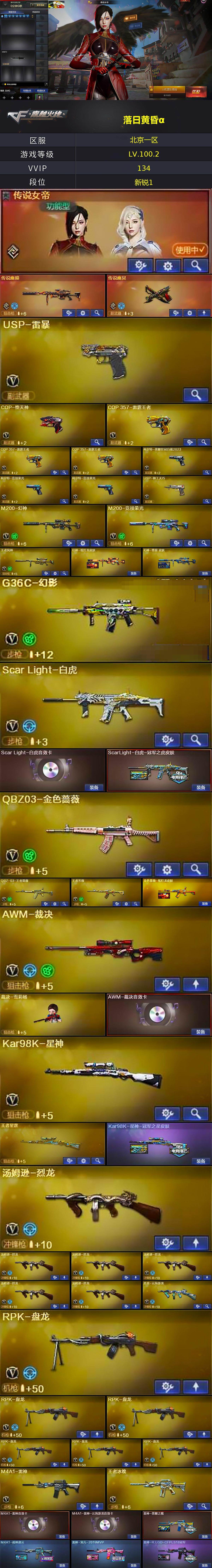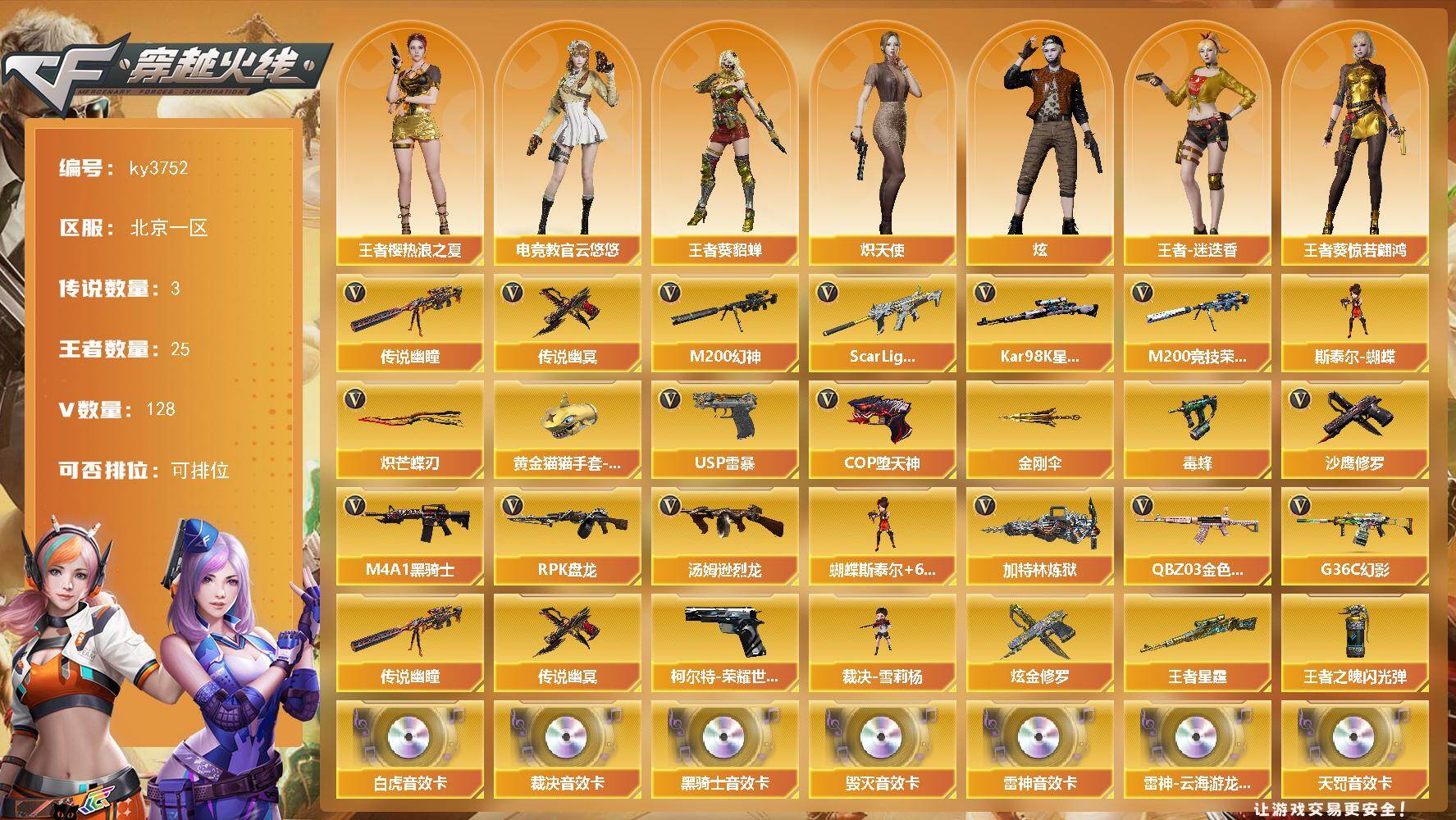 [14074334]北京一区-128V-25王者-1炫金 【传说武器】:传说幽瞳,传说幽冥 【传说角色】:传说女帝 【热门武器】:传说幽瞳,传说幽冥,G36C-幻影,QBZ03-金色蔷薇,Scar Light-白虎,M200-幻神,柯尔特-荣耀世冠白鲨2023,M200-竞技荣光,Kar98K-星神,毒蜂,M4A1-黑骑士,汤姆逊-烈龙*6,RPK-盘龙*6,加特林-炼狱,斯泰尔-蝴蝶,裁决-雪莉杨,USP-雷暴,COP-堕天神,沙鹰-修罗*2,炽芒蝶刃,黄金猫猫手套-白鲨,金刚伞 【王者炫金武器】:王者星霆,炫金修罗,王者之魄闪光弹 【音效卡】:M4A1-雷神音效卡,M4A1-雷神-云海游龙音效卡,M4A1-黑骑士音效卡,Barrett-毁灭音效卡,AWM-裁决音效卡,Scar Light-白虎音效卡,QBZ03-天罚音效卡 【皮肤】:幻神-纸灯龙皮肤,幻神-曹操 皮肤,ScarLight-白虎-冠军之虎皮肤,金色蔷薇-纸灯龙皮肤,Kar98K-星神-冠军之星皮肤,雷神-荣耀之魄,M4A1-战神赵云,雷神-宠儿-2019MVP,雷神-R.LGD-CFPLS18冠军,火麒麟-白虎,毁灭-荣耀之怒,毁灭耀金皮肤,毁灭-BEAN-2020MVP,毁灭-魔灵皮肤,M4A1-千变-孔明皮肤,黑龙-能量核心,黑骑士-冠军之势,黑骑士-AG-S4冠军典藏,战神-粉色甜心皮肤,战神-紫绶金章皮肤,战神-流金岁月皮肤,AK47-B-常胜将军-曹操,AK47-B-常胜将军-刘备,AK47-B-常胜将军-孙权*2,屠龙-荣耀之锋*2,龙啸-冠军之啸,龙啸-纸灯龙皮肤,擎天-冠军之击 【角色】:魅影,炫,电竞教官-云悠悠,机械姬,王者樱-热浪之夏,王者-葵-貂蝉,王者葵-惊若翩鸿,王者炫,王者-迷迭香,蛇隐宗,奇洋探员,乔伊教练,云海玲珑,炽天使,暗夜-X,飞虎队-X,风暴女*2,灵动武士,灵狐者-X,灵狐者-黄金海岸,潘多拉-X,潜龙队-X,蛇姬,斯沃特-X,蜀雪,新灵狐者,幽,职业选手 【人偶武器】:裁决-雪莉杨,斯泰尔-蝴蝶,巴雷特-零-水下丽影,Scar Light-马枪,AWM-灵狐-15周年嘉年华,迷你深渊冰龙,迷你牛魔王,迷你波特博士,夺魂,迷你生化手雷,生化手雷-机甲核心*2,深渊终结者手雷,闪光弹-小乔,闪光弹-貂蝉,高爆手雷-大乔,灵狐娃娃手雷*2 【暴走生化】:毒蜂,异变清道夫,KA