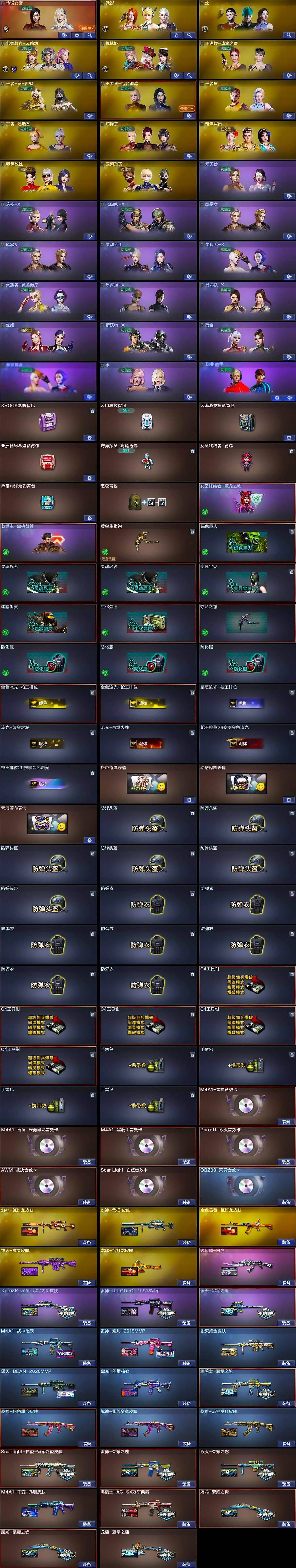 【皮肤】:幻神-纸灯龙皮肤,幻神-曹操 皮肤,ScarLight-白虎-冠军之虎皮肤,金色蔷薇-纸灯龙皮肤,Kar98K-星神-冠军之星皮肤,雷神-荣耀之魄,M4A1-战神赵云,雷神-宠儿-2019MVP,雷神-R.LGD-CFPLS18冠军,火麒麟-白虎,毁灭-荣耀之怒,毁灭耀金皮肤,毁灭-BEAN-2020MVP,毁灭-魔灵皮肤,M4A1-千变-孔明皮肤,黑龙-能量核心,黑骑士-冠军之势,黑骑士-AG-S4冠军典藏,战神-粉色甜心皮肤,战神-紫绶金章皮肤,战神-流金岁月皮肤,AK47-B-常胜将军-曹操,AK47-B-常胜将军-刘备,AK47-B-常胜将军-孙权*2,屠龙-荣耀之锋*2,龙啸-冠军之啸,龙啸-纸灯龙皮肤,擎天-冠军之击