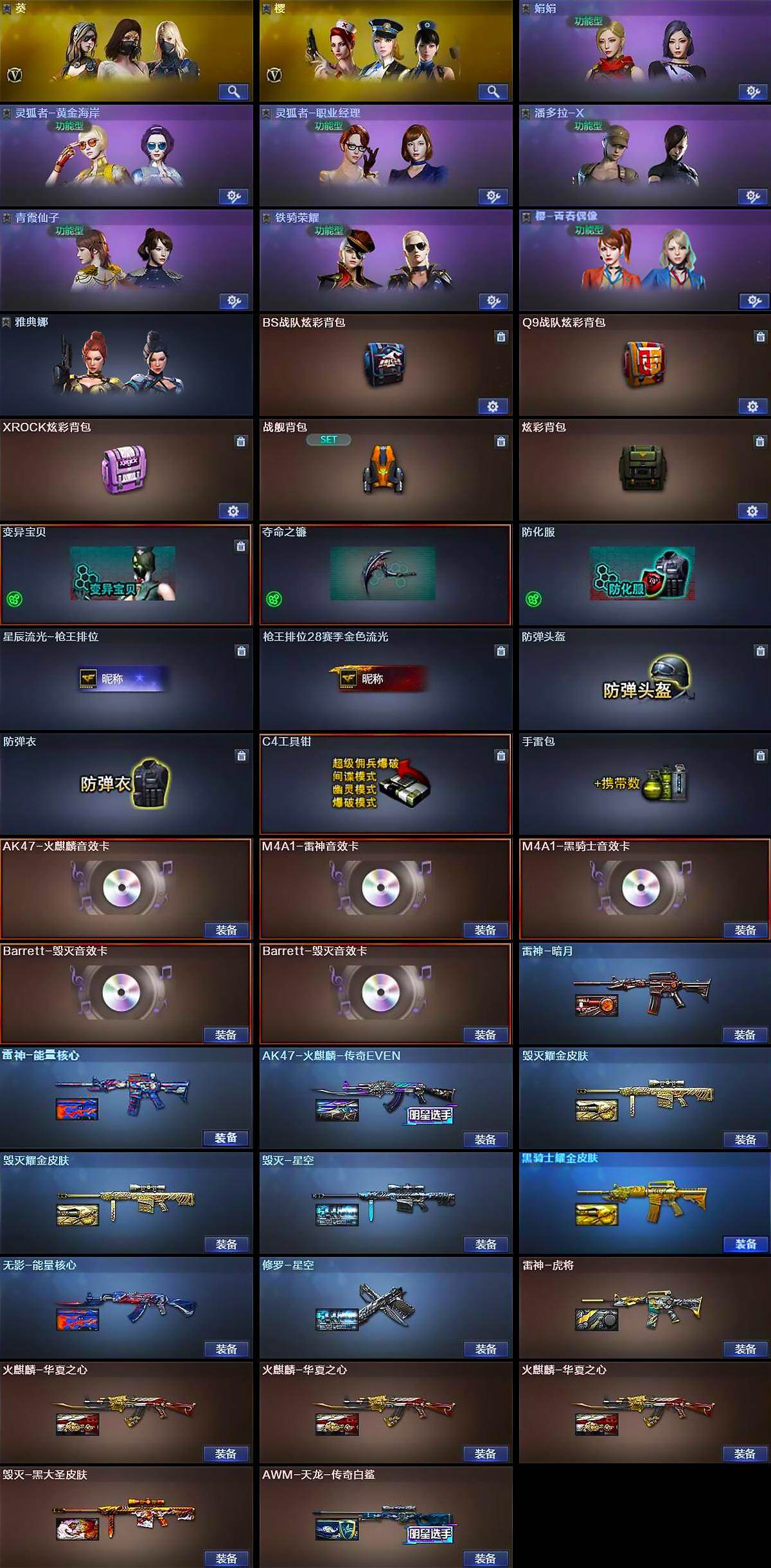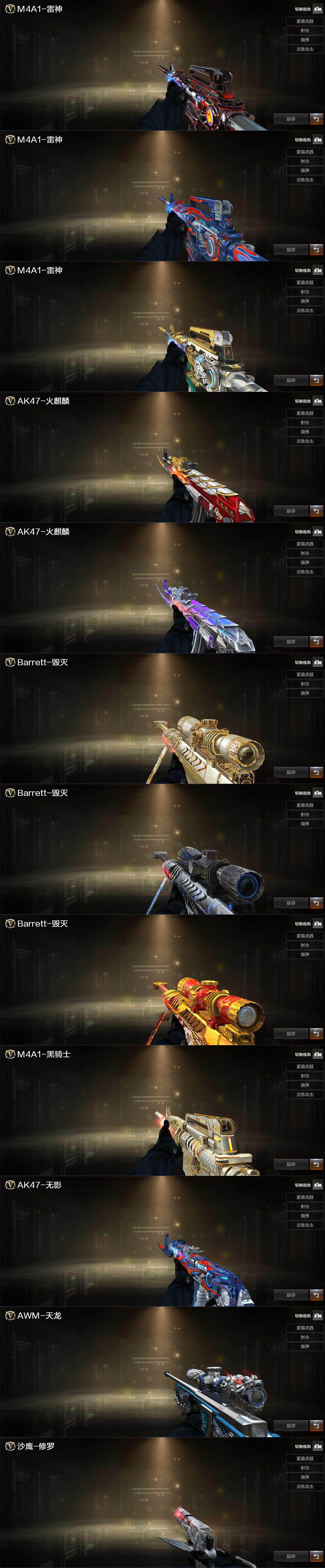 【英雄级武器】:AK47-火麒麟*2,M4A1-雷神*4,M4A1-黑骑士,AK47-无影,AK12-天启*4,AK47-黑鲨*2,M4A1-龙血*3,AK47-雷暴,HK417-朱雀*2,Scar Light-白虎,QBZ03-金色蔷薇,王者之魄-觉醒版,王者之势-觉醒版,AK-47-猩红传说,AWM-天龙*8,Barrett-毁灭*2,Barrett-极光,AWM-裁决*2,M200-幻神,Barrett-金色蔷薇,RPK-盘龙*6,加特林-炼狱*3,汤姆逊-烈龙*10,AA-12-雷霆*2,沙鹰-修罗*6,沙鹰-天神*2,USP-雷暴,柯尔特-电竞装甲,屠龙,龙啸*2,擎天*4,麒麟刺*2,斩神刀-雷暴,高爆手雷-雷暴*5,闪光弹-雷暴*5,烟雾弹-雷暴*5