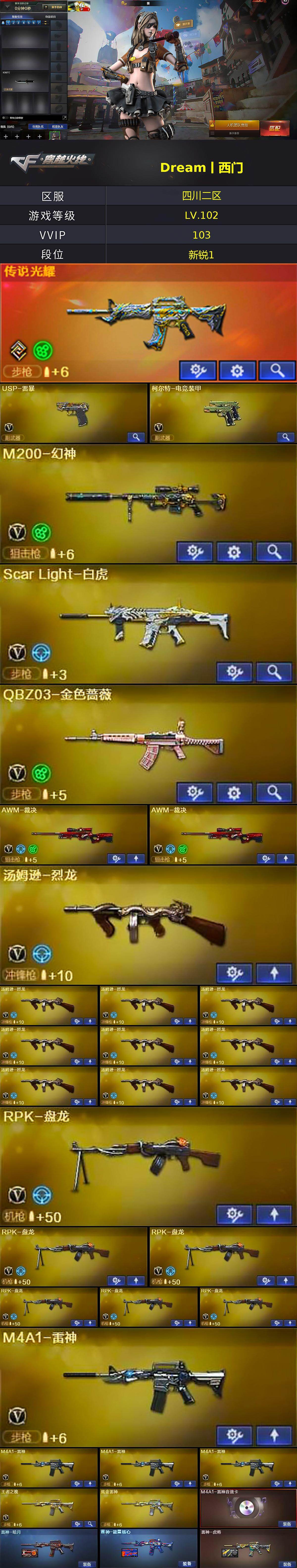 【热门武器】:传说光耀,QBZ03-金色蔷薇,Scar Light-白虎,HK417-朱雀*2,M200-幻神,死亡之眼,王者炎心*2,M4A1-黑骑士,汤姆逊-烈龙*10,RPK-盘龙*6,加特林-炼狱*3,斯泰尔-蝴蝶,COP-白鲨,USP-雷暴,沙鹰-修罗*6